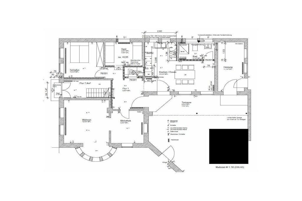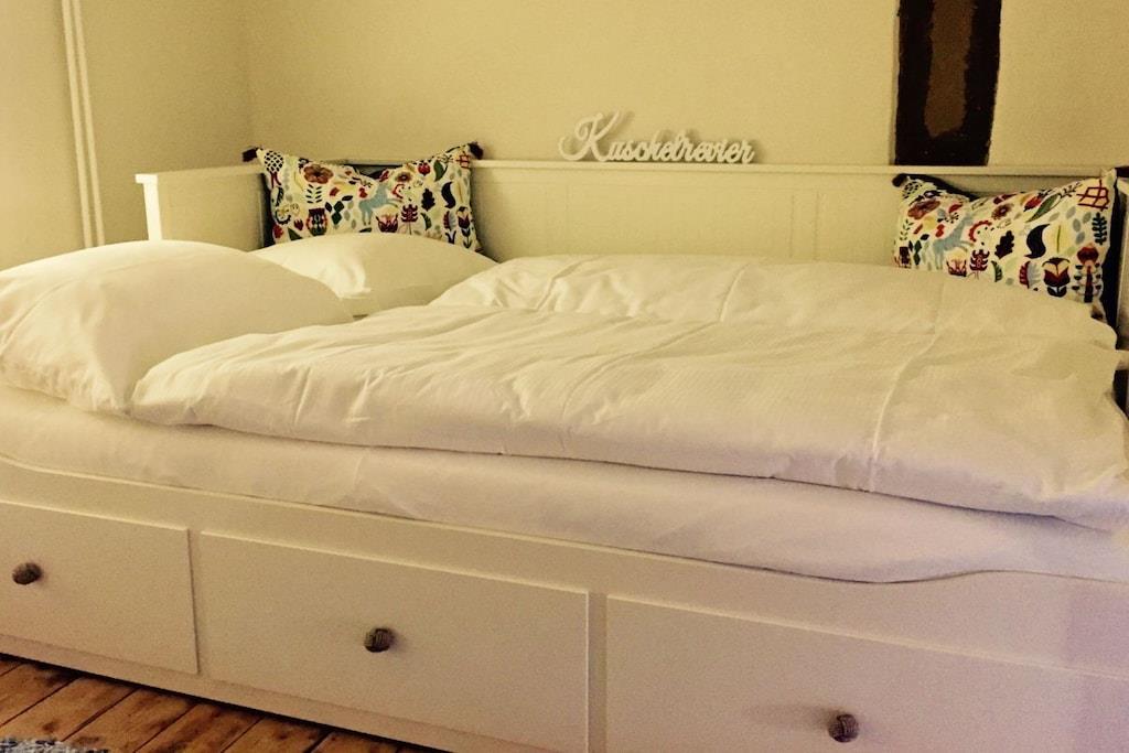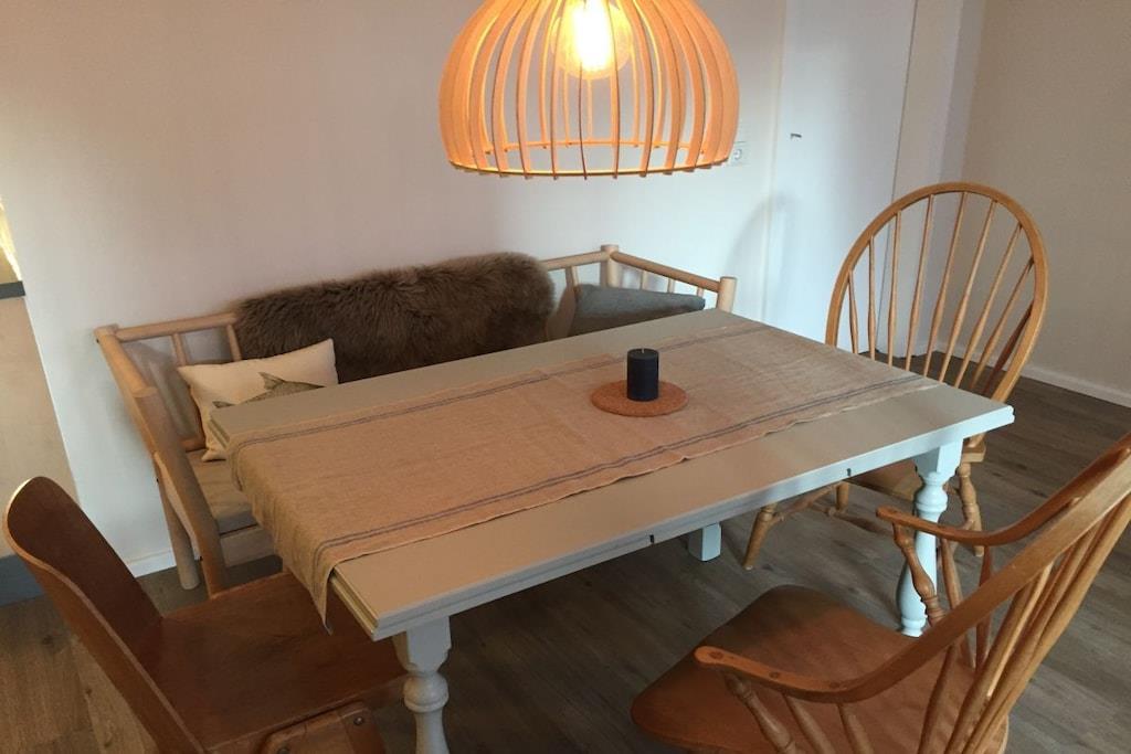 Das historische Haus Lange Strasse 1, Baujahr 1856 wurde aufwendig renoviert, die historischen Lehm-Stroh Mauern mit ihrem Charme und Fachwerk wurden beibehalten, die alten Balken freigelegt. Die mit skandinavischen Designer Möbeln und nautischen Elementen neu gestaltete Ferienwohnung bietet der gesamten Familie reichlich Platz. Der großzügige Ess- und Küchenbereich lädt zu gemütlichen Kochabenden ein. Im Spielzimmer stehen Gesellschaftsspiele, Bücher und Kinderspielzeug zur Verfügung. Das Wohnzimmer verfügt über ein gemütliches Sitzfenster im historischen Erker mit Blick bis auf die Schlei. Das neue Badezimmer mit großzügiger Dusche bietet ausreichend Platz. Beide Schlafzimmer verfügen über Doppelbetten (160x200m). Die "Koje", ein um 50 cm erhöhter Schlafraum mit Bullaugentür begeistert vor allem die Kinder.