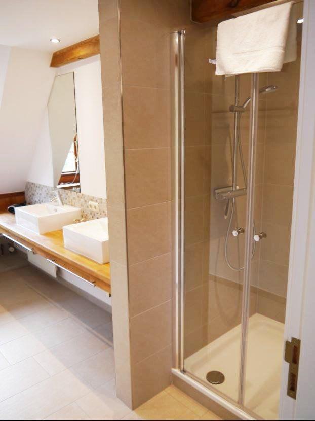 Das moderne Badezimmer ist mit einer Dusche mit flachem Einstieg, einem Ganzkörperspiegel, WC, Haartrockner sowie zwei Waschbecken ausgestattet. Eine Fußbodenheizung sorgt hier für zusätzlichen Komfort.