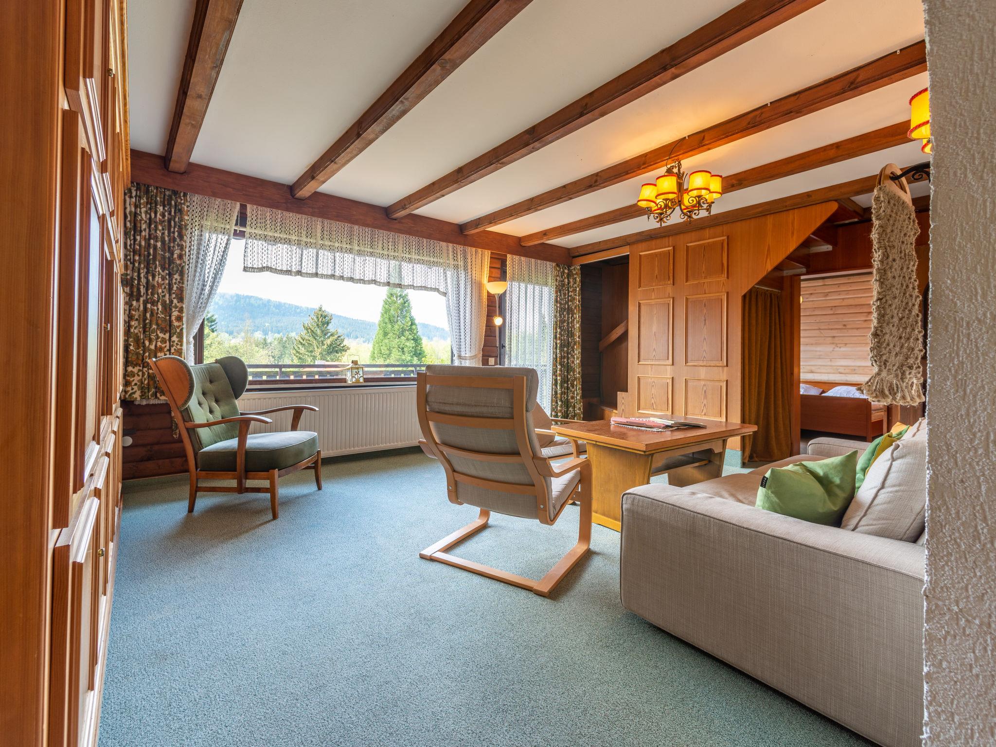 4-room apartment 100 m2 on 2 levels, on the upper floor. Cosy and wooden furniture furnishings: living room 35 m2 with satellite TV (flat screen), DVD. Exit to the balcony. 1 room 13 m2 with 1 double bed (180 cm, length 200 cm). 1 room 9 m2 with 2 beds (90 cm, length 200 cm), satellite TV (flat screen). Open kitchen 9 m2 (oven, dishwasher, 4 ceramic glass hob hotplates, kettle, microwave, electric coffee machine) with dining table. Shower/WC. Top floor: 1 room 9 m2, with sloping ceilings with 2 beds (90 cm, length 180 cm). Gas heating. Large balcony 40 m2, south facing position. Balcony furniture, deck chairs (3). Beautiful view of the mountains. Facilities: washing machine. Internet (WiFi, free). Please note: non-smokers only. Maximum 1 pet/ dog allowed. Private entrance, smoke alarm. Balcony partly covered. Lake 150 m.