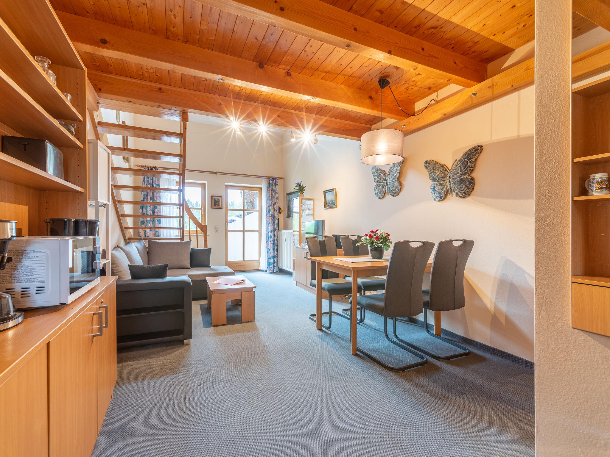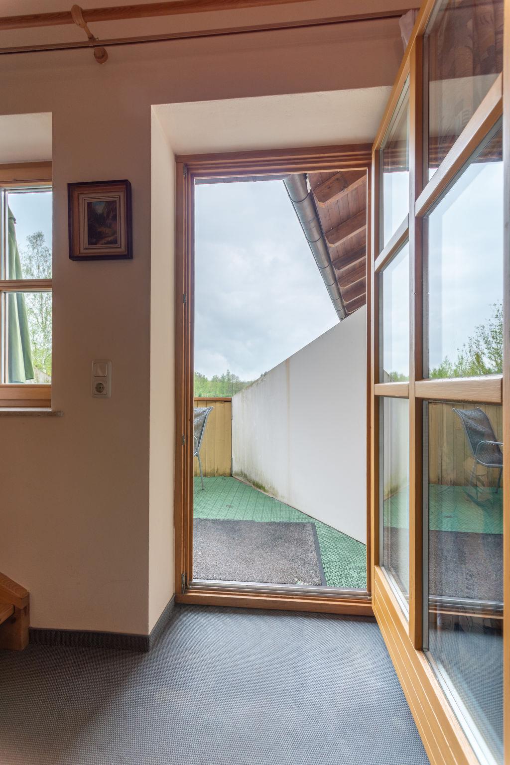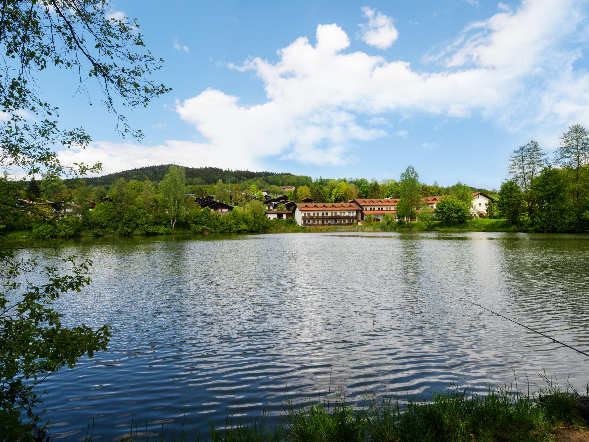 Child friendly holiday village "Am Hohen Bogen", 5 m a.s.l.. In the district of Kummersdorf, outside the resort, 3 km from the centre of Arrach, on a slope, traffic calmed area, 300 m from the edge of the forest, 100 m from the lake, 9 km from the skiing area. For shared use: volleyball, children's playground (slide, swing, sandbox). In the complex: table tennis (extra). Central heating system. Parking at the house. Shop 3 km, grocery 3 km, supermarket 3 km, restaurant 3 km, bakery 3 km, bus stop "Großmühle Abzw. Hohenwarth" 650 m, railway station "Hohenwarth" 1.5 km, grass beach "Seepark Arrach" 5 km, outdoor swimming pool 10 km, thermal baths 10 km, bathing lake "Seepark Arrach" 5 km. Golf course (9 hole) 6 km, tennis 6 km, riding stable 800 m, chair lift 9 km, skisport facilities 9 km, slopes 9 km, ski rental 11 km, ski school 9 km, cross country ski track 11 km. Nearby attractions: Bayerwald-Tierpark Lohberg 15 km, Spielbank Bad Kötzting, Fun-Park Neukirchen, Tiergarten Straubing, Pullman-City. Well-known ski regions can easily be reached: Eck 6 km, Am Hohen Bogen 9 km, Arber 29 km. Hiking paths: Arberregion. Please note: car recommended. Groups of teenagers on request only. Boating, fishing 500 m. The holiday village consists of an apartment house and two-storey holiday houses with shared lawns and play areas. The distance from the individual houses to the natural swimming lake is 50 – 400 m.