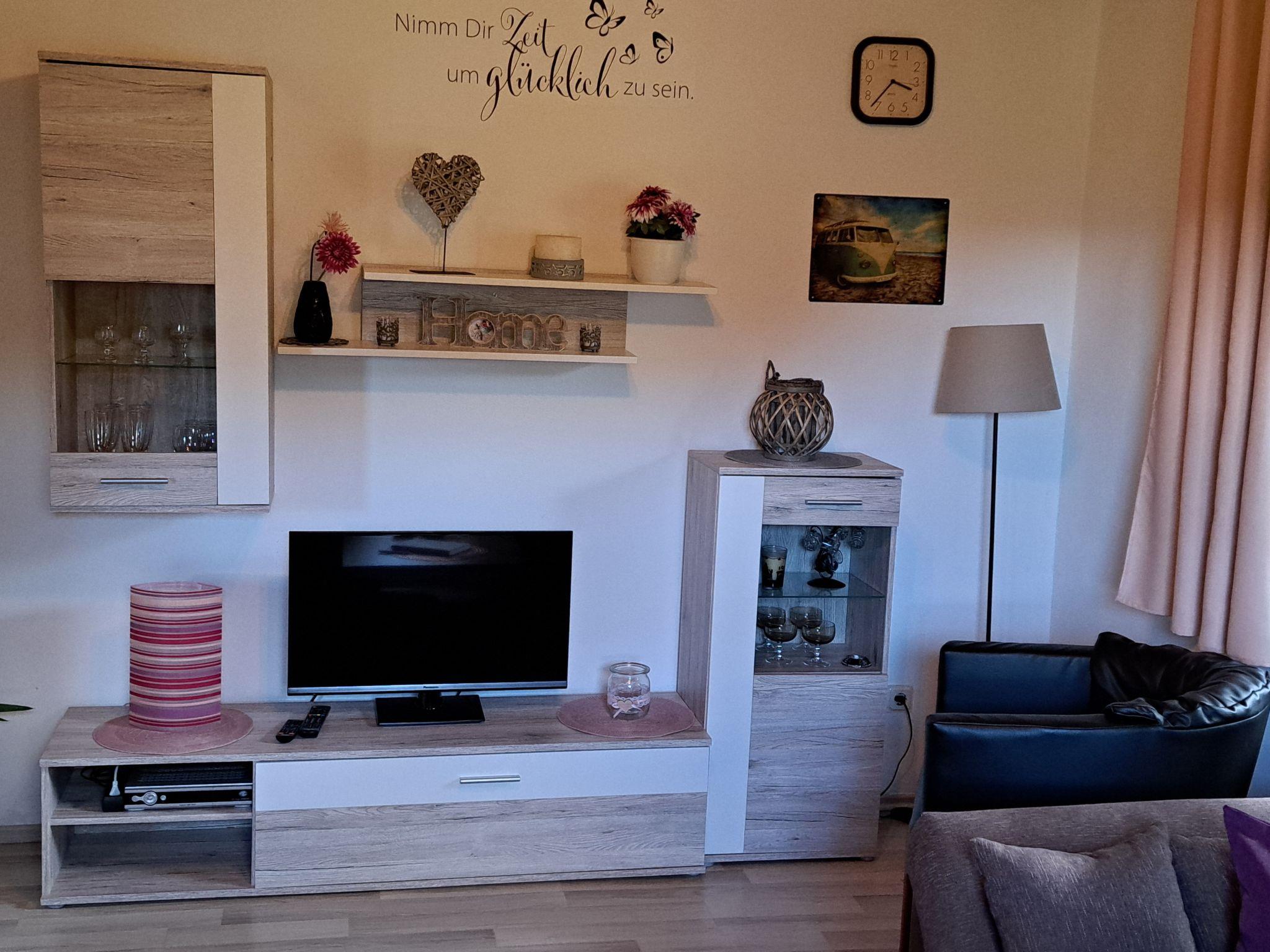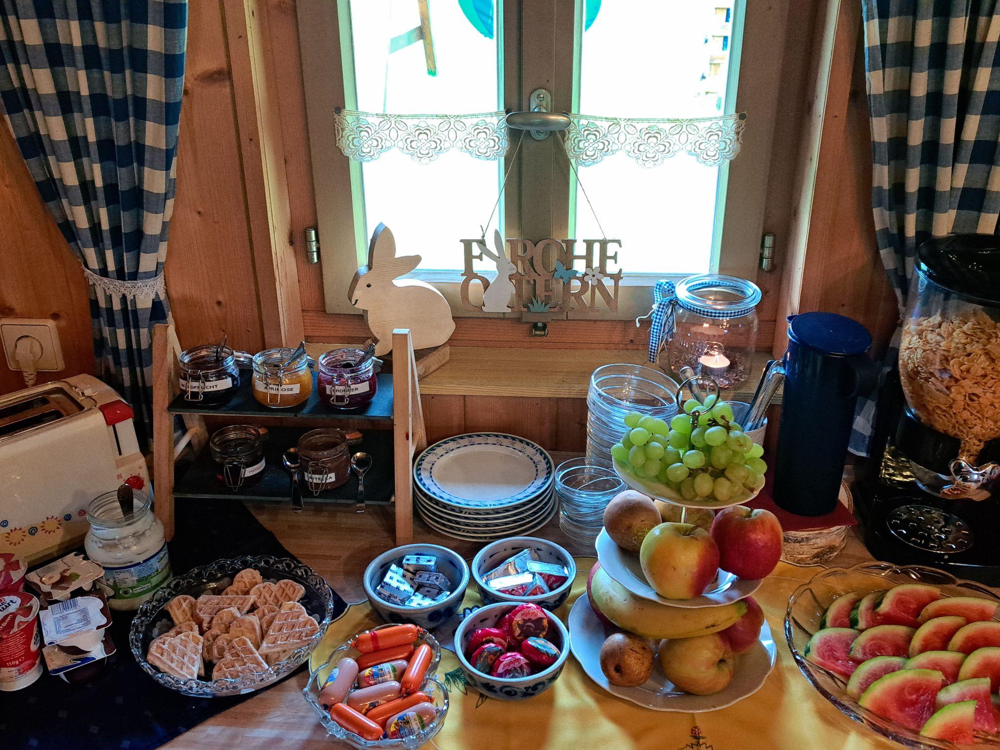 In our holiday home you will find a comfortable interior that leaves nothing to be desired. The living room has a pull-out sofa bed (180x200 cm), which offers enough space for two adults, as well as a relaxing armchair, a living room cupboard and a table, complemented by a satellite TV for cosy evenings. The bedroom is furnished with a large wardrobe, a spacious double bed and a single bed to ensure a good night's sleep for you and your loved ones. The kitchen is fully equipped with a Senseo coffee pod machine, a filter coffee machine, a toaster, an egg cooker, a bread machine and a kettle.