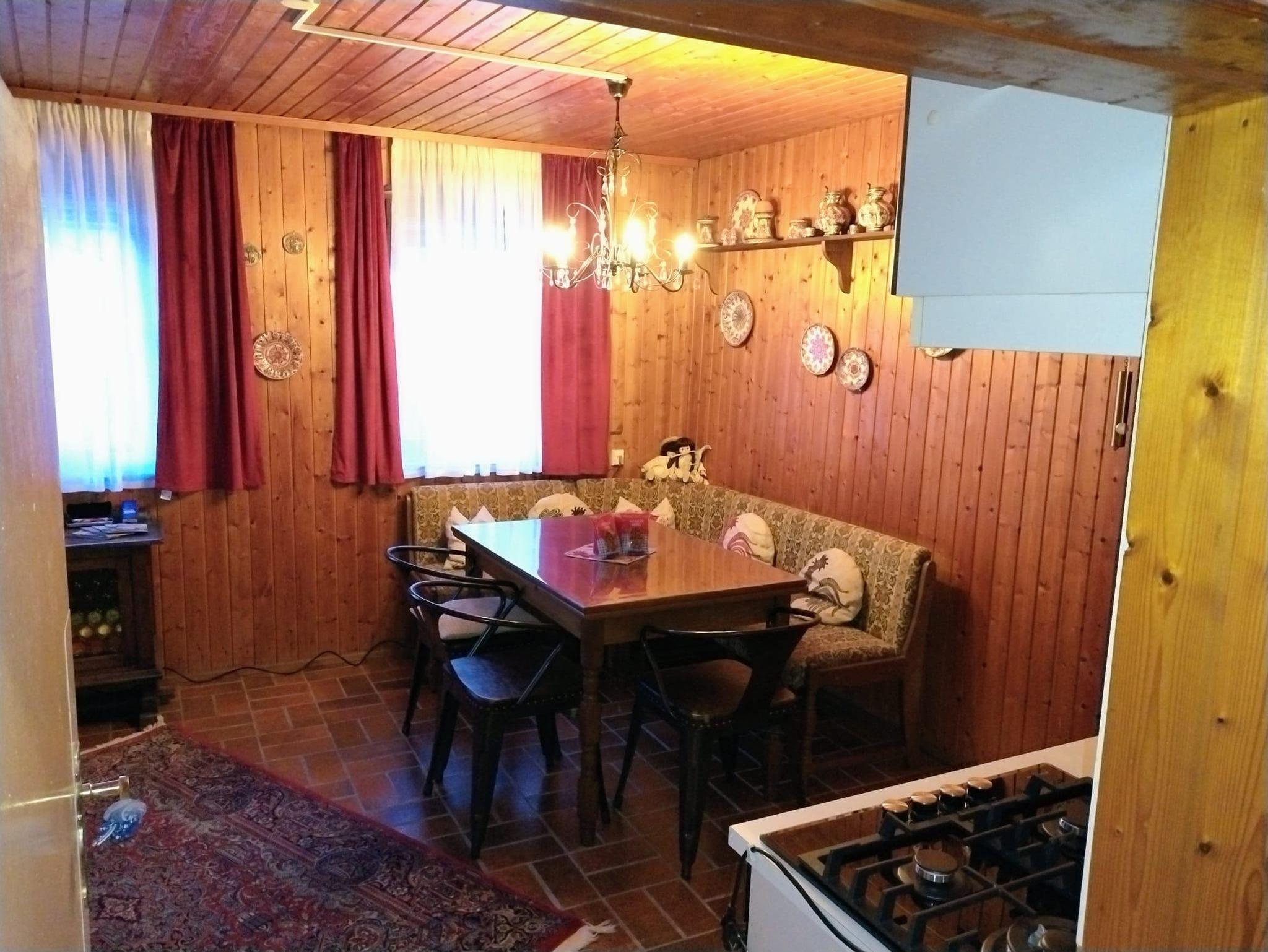 gemütliche Eckbank mit Tisch sowie eine voll ausgestattete Küchenzeile.