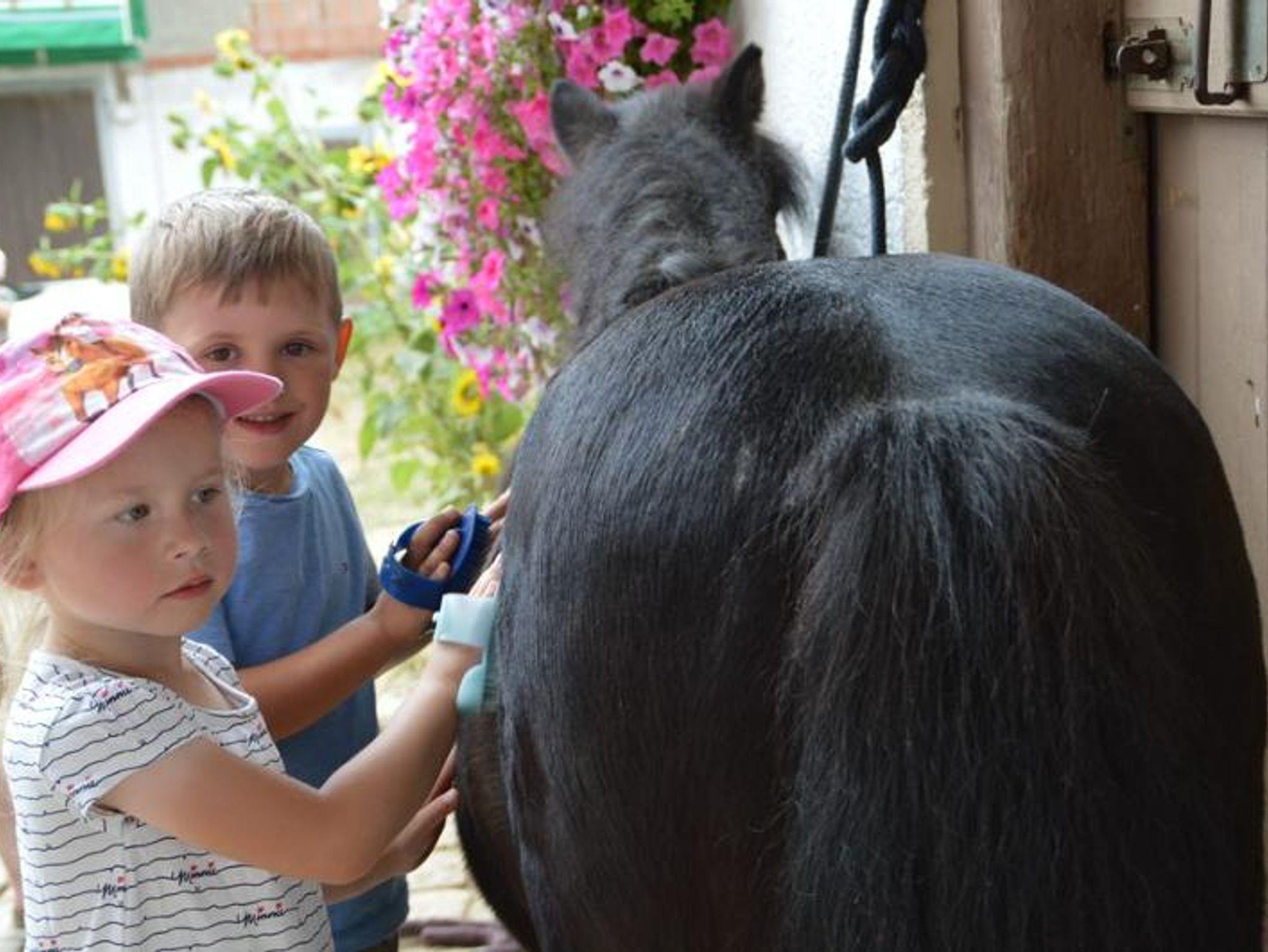 Pradies beim Versorgen der Tiere, beim Striegeln der Ponys und