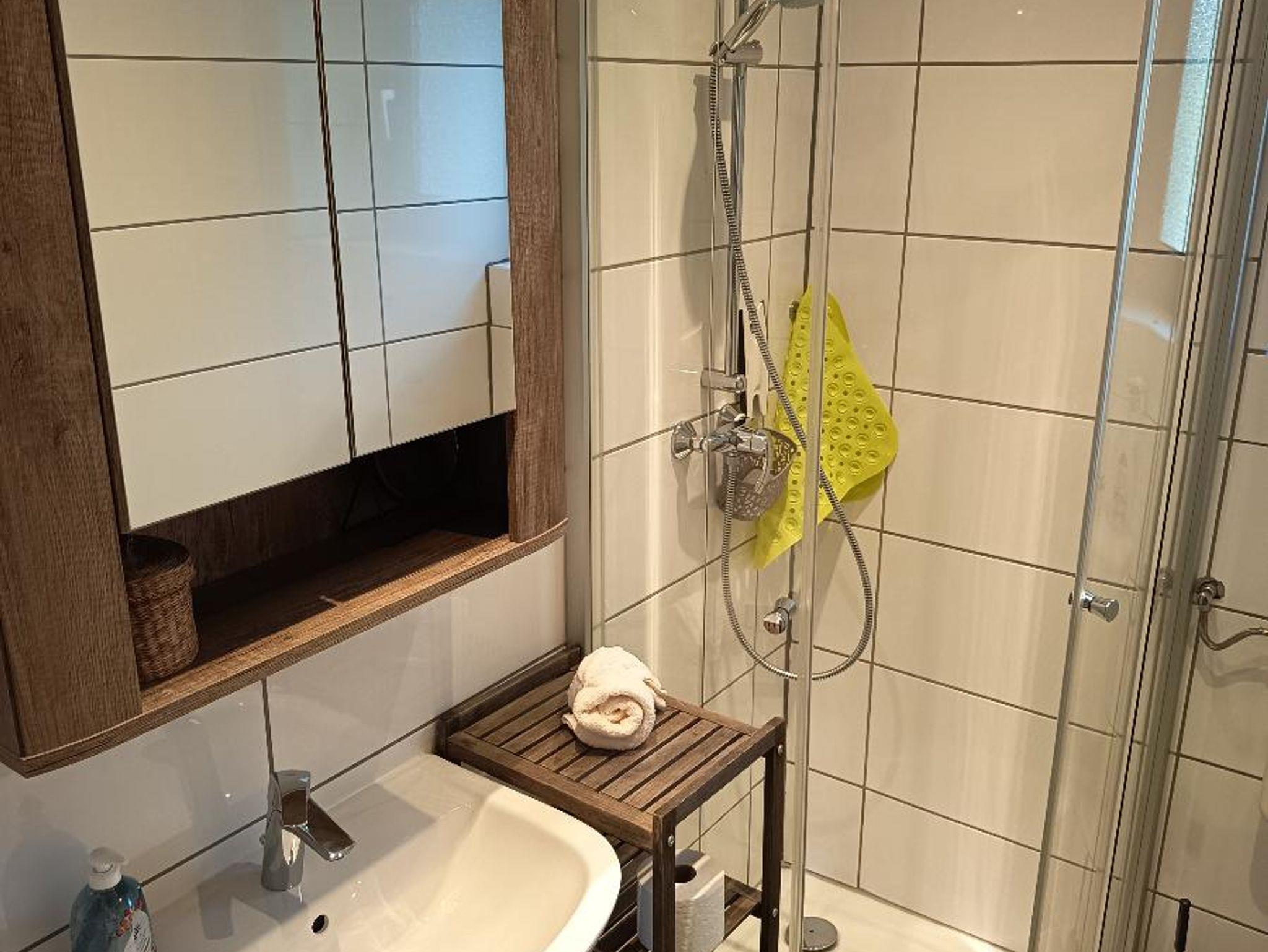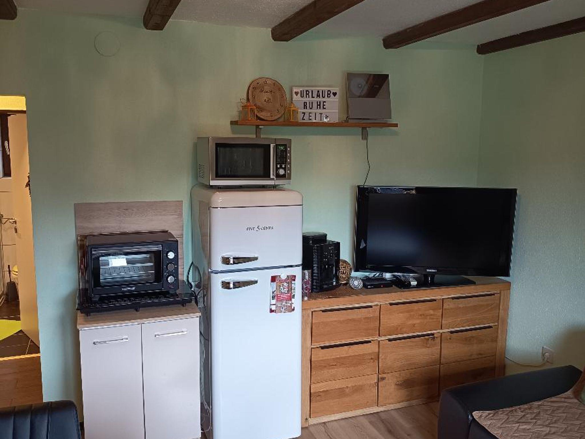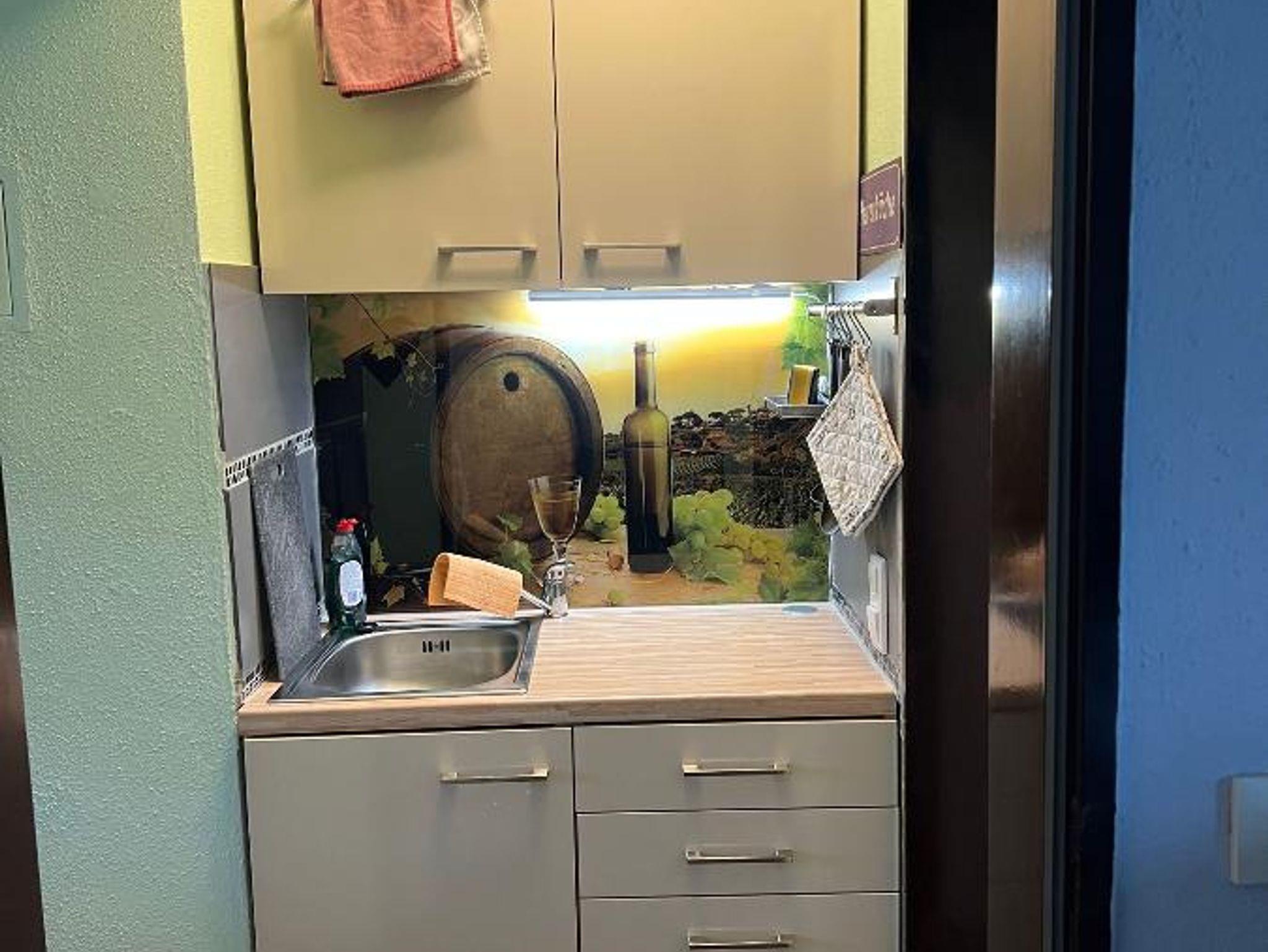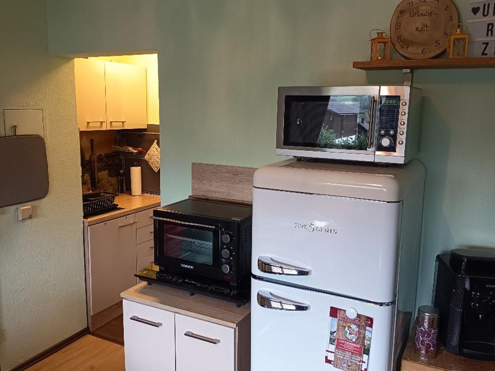 Die kleine aber feine Küchenecke (zwei Iductionsherdplatten , incl. Küchenausstattung), sowie Kühlschrank mit Gefrierfach, Kaffeemaschine, Wasserkocher und Mikrowelle runden die Atmosphäre der Wohnung ab.