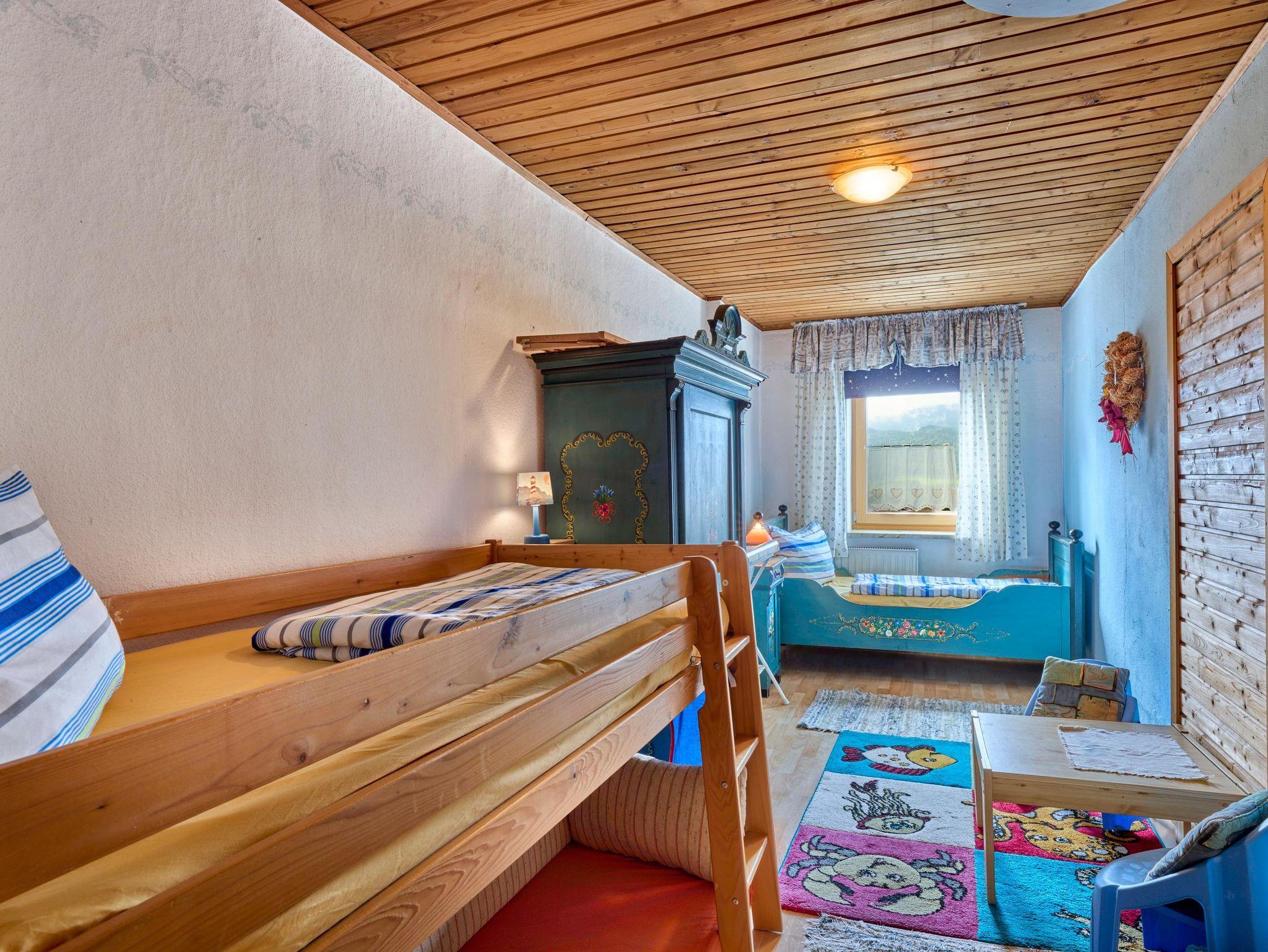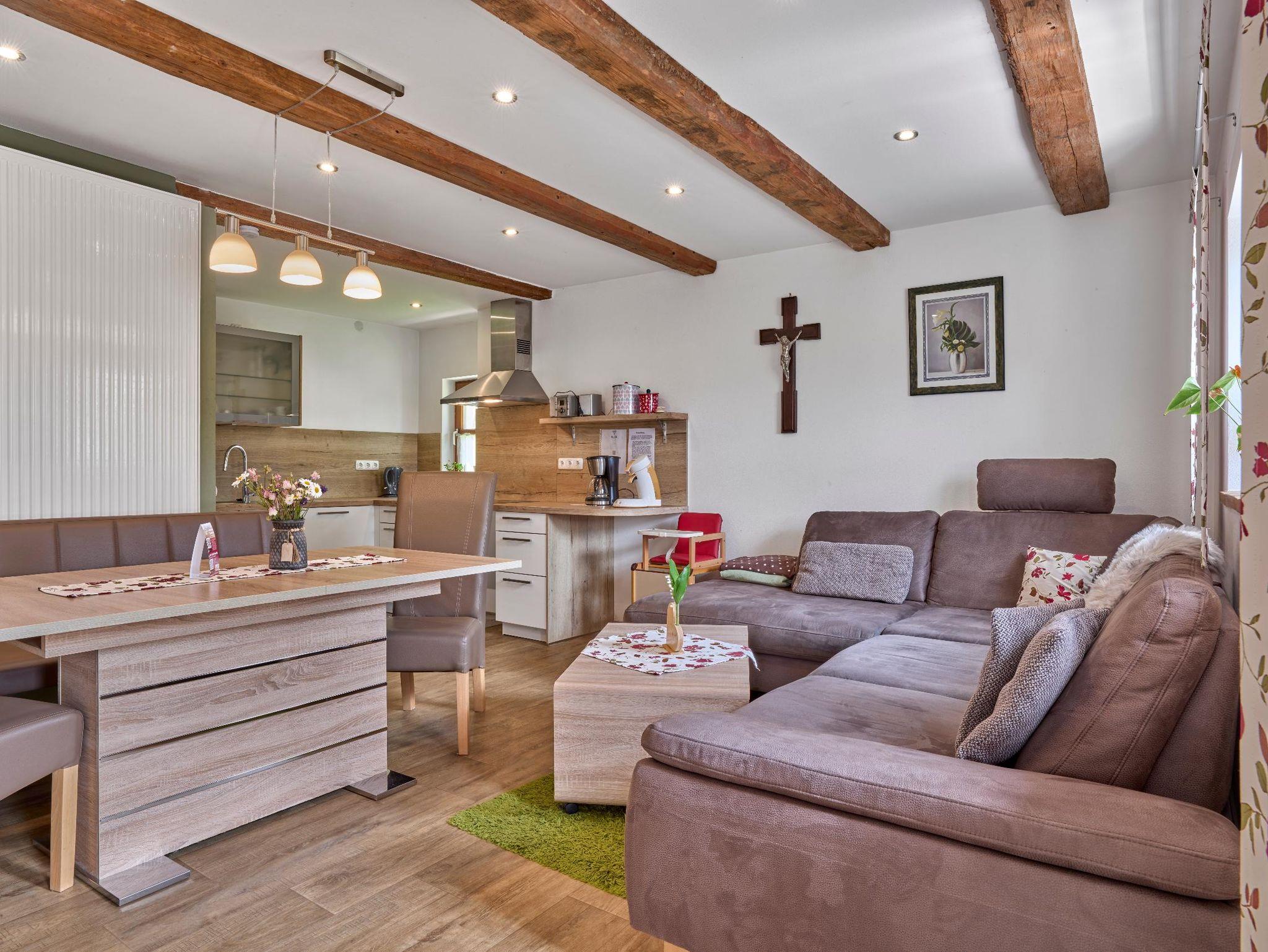 Die Ferienwohnung Talblick (75 qm) ist für 4 Personen geeignet. Sie verfügt über zwei schöne Schlafzimmer (1x Doppelbett, 1x Etagenbett). Das Wohnzimmer mit Sat-TV, großer Couch lädt zum Verweilen ein. Die Küche mit Spülmaschine, Mikrowelle, Toaster, Wasserkocher, Espressomaschine lässt keine Wünsche offen. Das Bad besteht aus Badewanne, Dusche und WC Babygerechte Ausstattung möglich. Frühstücksbuffet gegen Aufpreis möglich. Tischtennisraum mit großem Fußballkicker, große Liegewiese mit Liegen und Grill und ein separater Waschraum mit Waschmaschine und Trockner stehen unseren Gästen zur Verfügung. Kostenloses Reiten am Hof und auf Wunsch Kinderbetreuung. Separates Kinderspielzimmer, Aufenthaltsraum, eigener schattiger Kinderspielplatz mit Baumhaus, großem Trampolin und Lagerfeuerstelle.