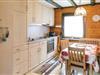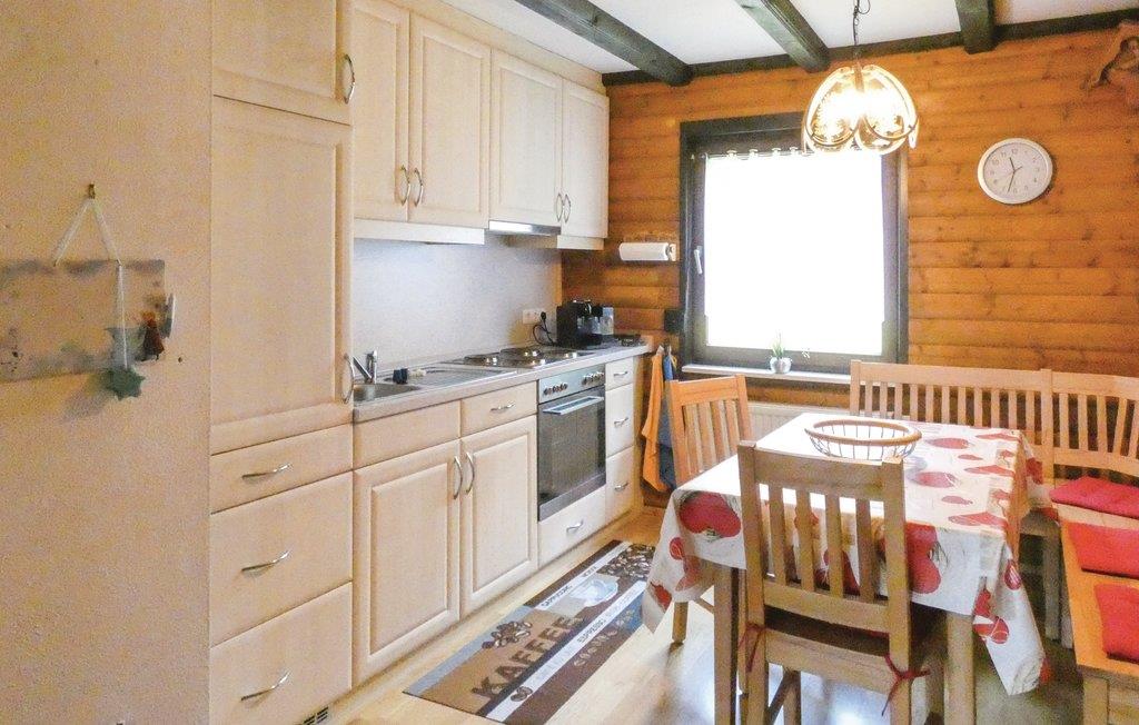 I det komfortable køkken er der en hjørnebænk, hvor I kan side sammen og hygge jer om aftenen. Der er skøn udsigt over den omliggende natur gennem store vinduer.