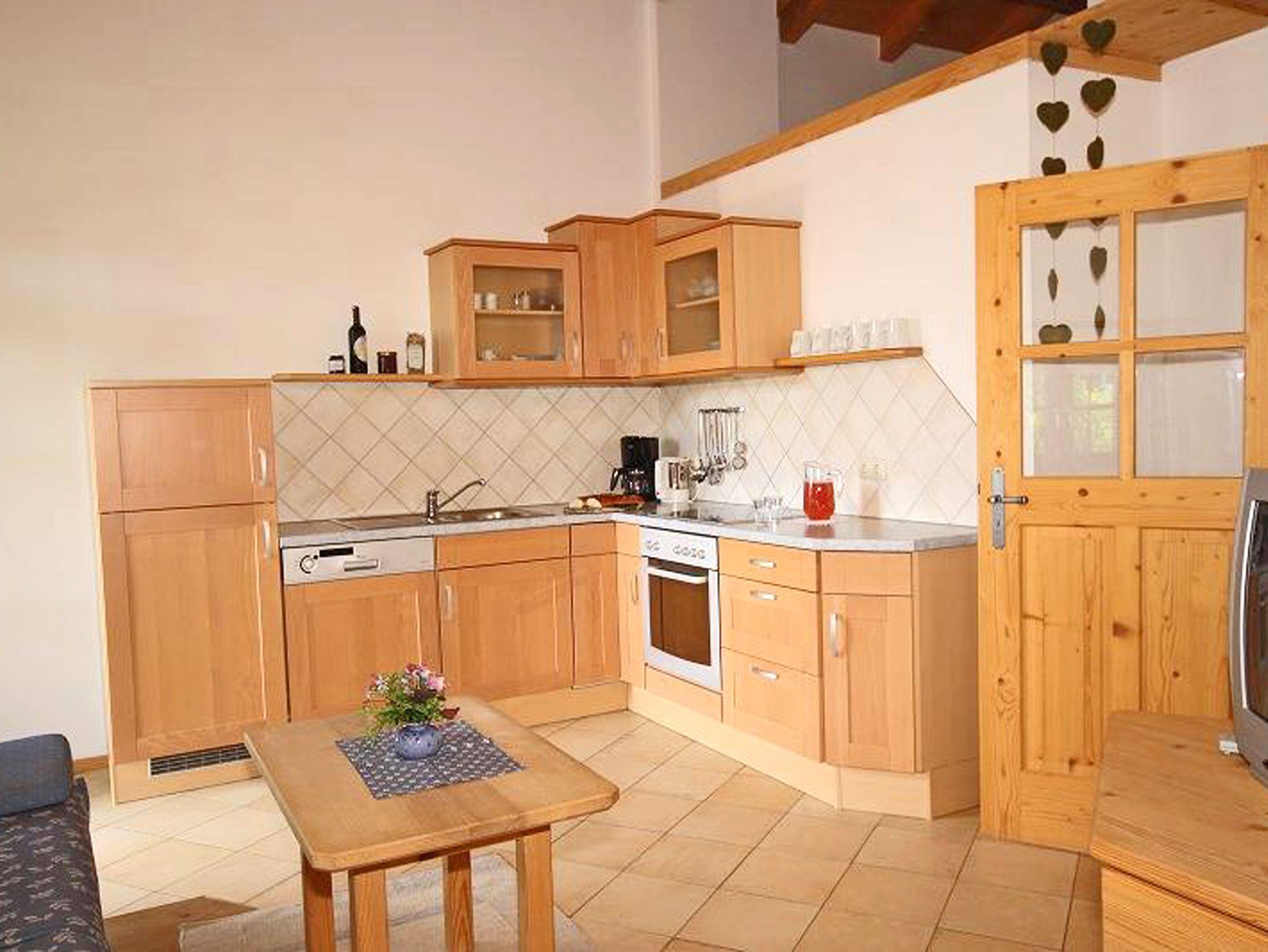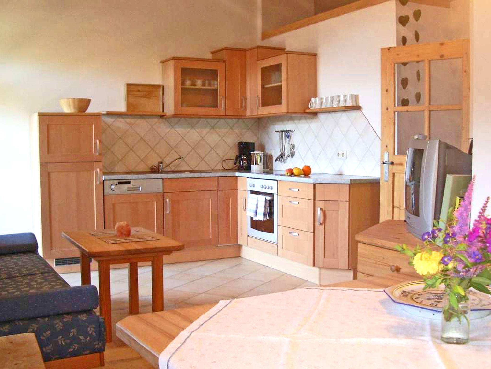 Die Ferienwohnung Geigelstein ist eine behagliche und liebliche Ferienwohnung mit einer romantischen Note. Vom Balkon der Wohnung können Sie einen herrlichen Blick ins Kaisergebirge genießen. Die großzügige Wohnküche ist mit folgenden Geräten ausgestattet: Kühl- und Gefrierschrank, Cerankochfeld, Backofen, Spülmaschine, Kaffeemaschine, Wasserkocher und Toaster. Unsere Schreiner haben eine schöne Eckbank mit Tisch in die gemütliche Nische eingepasst. Ein großes Sofa und ein Fernseher ergänzen die Wohnküche. Es gibt zwei Schlafzimmer. Das Elternschlafzimmer verfügt über ein Doppelbett und das Kinderzimmer ist mit einem Stockbett ausgestattet. Am Balkon stehen gemütlche Stühle, ein geschreinerter Klapptisch und eine Bank. Es ist eine Nichtraucherwohnung. Hunde auf Anfrage.