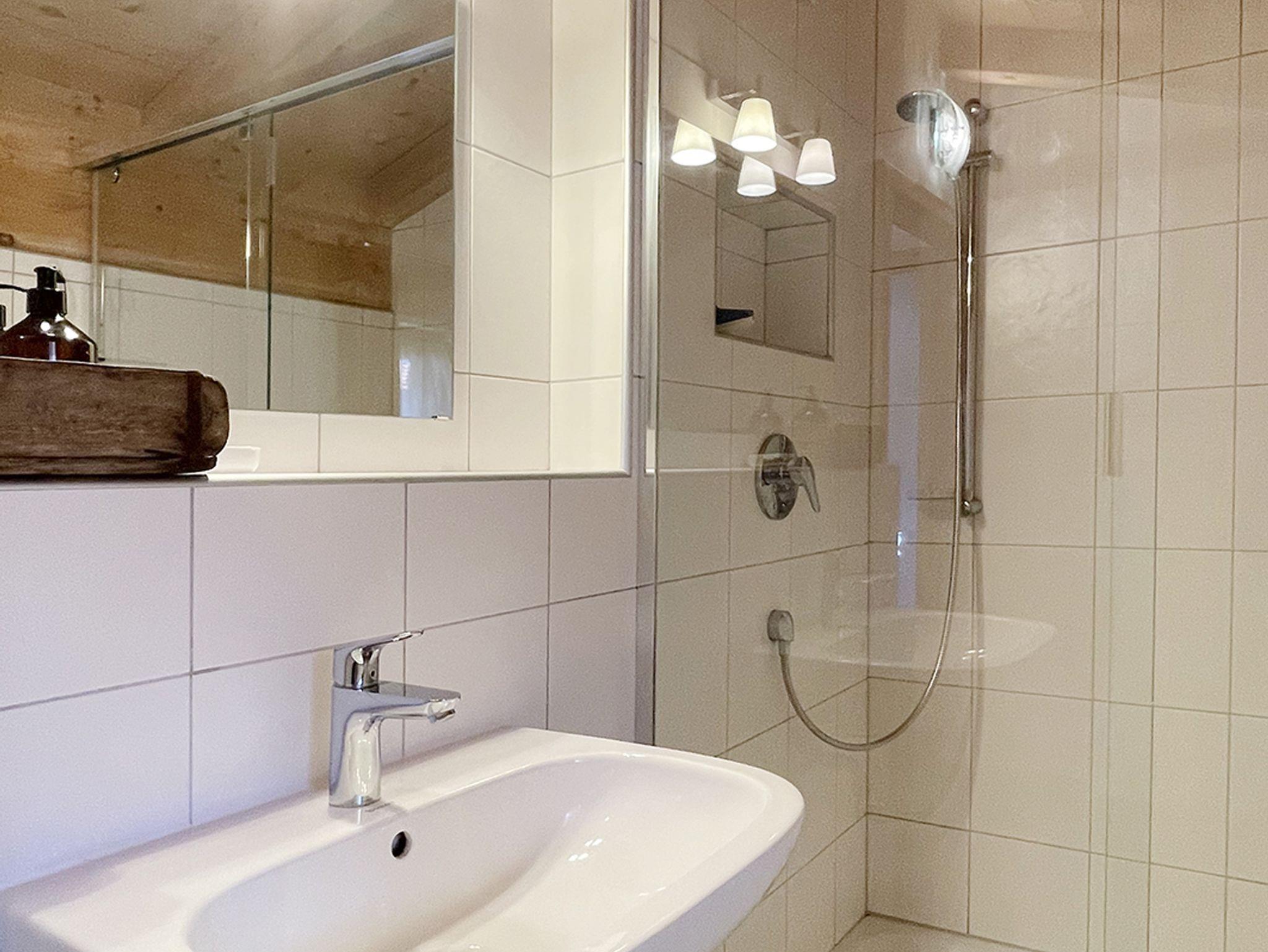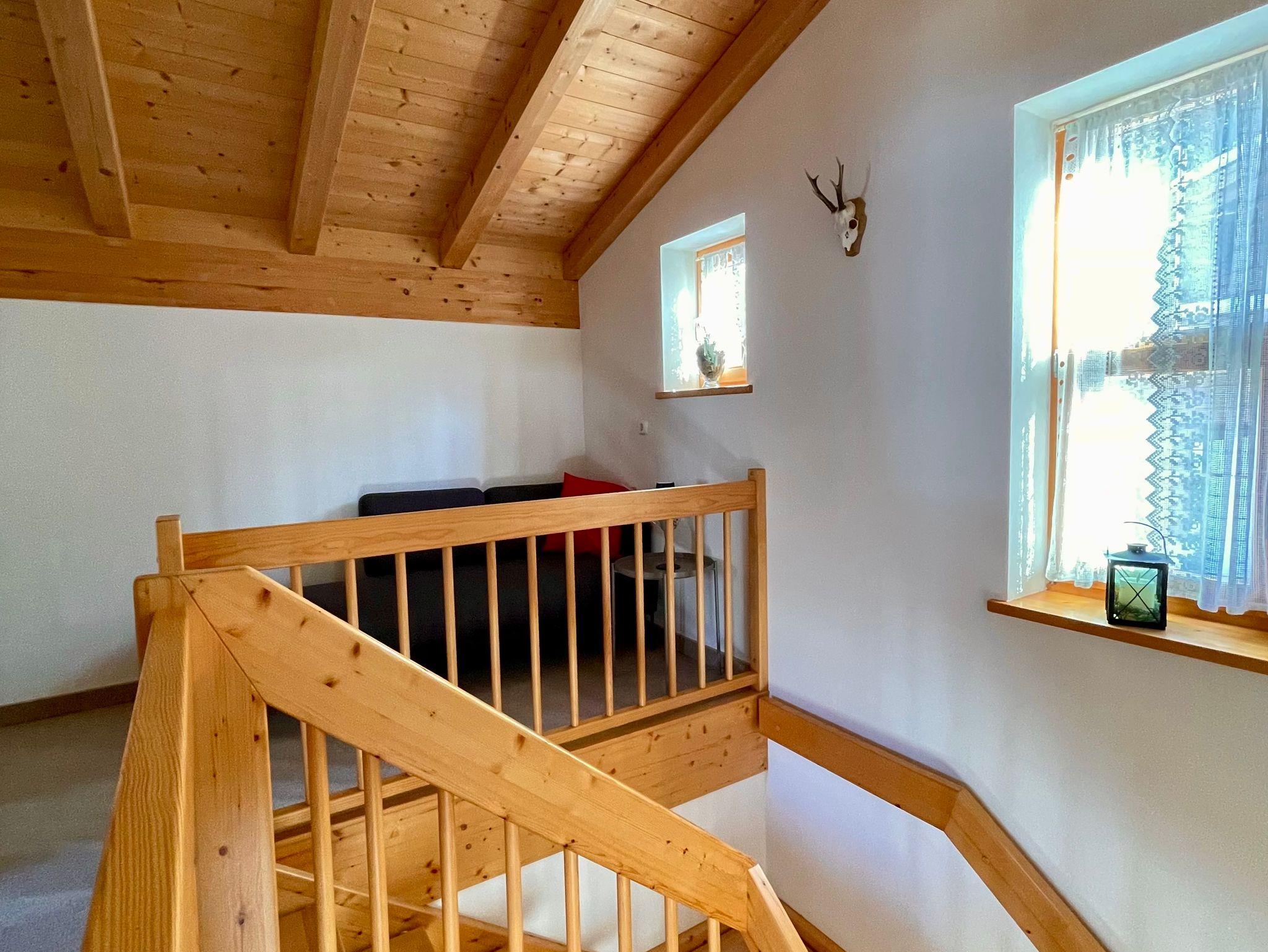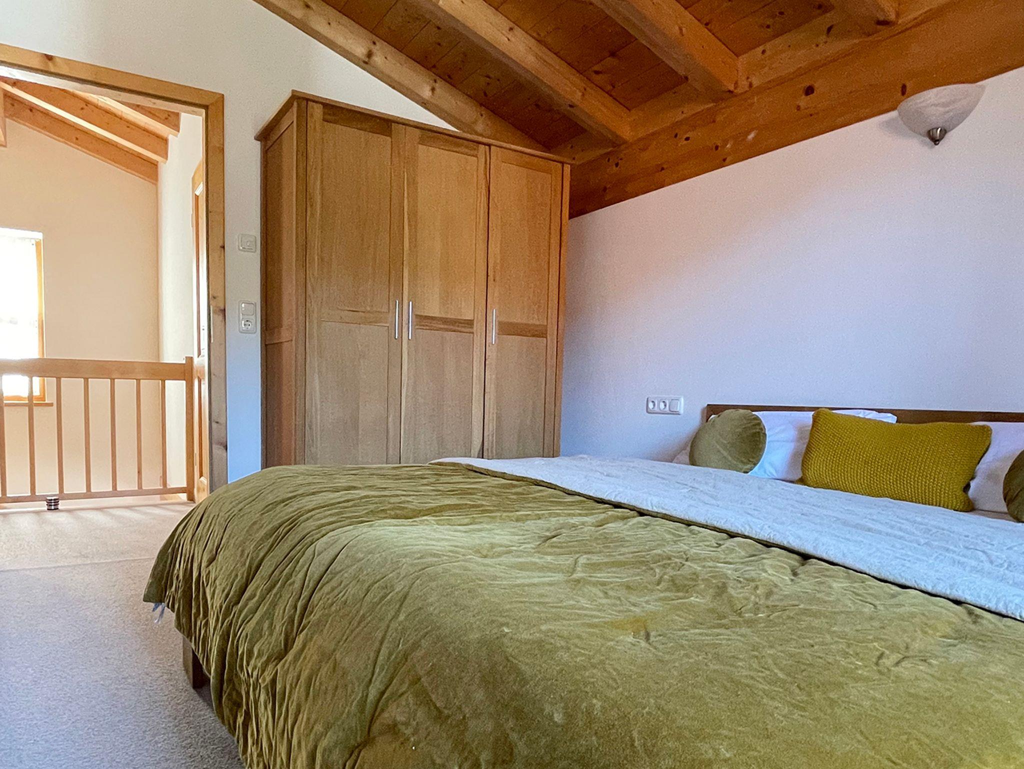 Ihr Zuhause auf Zeit – die Raumaufteilung: Im 1. Obergeschoss befinden sich zwei Schlafzimmer mit komfortablen Doppelbetten (188 x 204 cm), die direkt auf den Balkon führen. Hier können Sie den Tag mit frischer Bergluft beginnen und in der Abendsonne den Blick in die Natur genießen. Außerdem gibt es ein großzügiges Badezimmer mit einer begehbaren Dusche, das Ihnen viel Raum und Komfort bietet. Eine Empore mit einer zusätzlichen Schlafmöglichkeit (90 x 200cm) rundet das Obergeschoss ab und ist ideal für größere Familien oder Freunde.