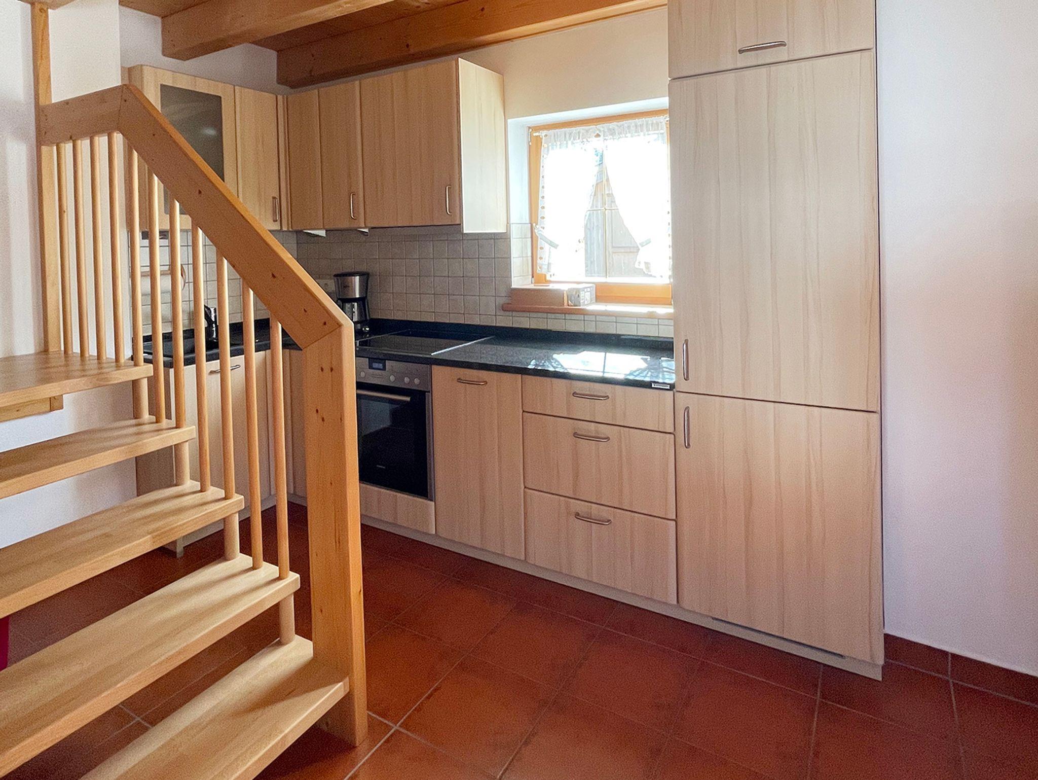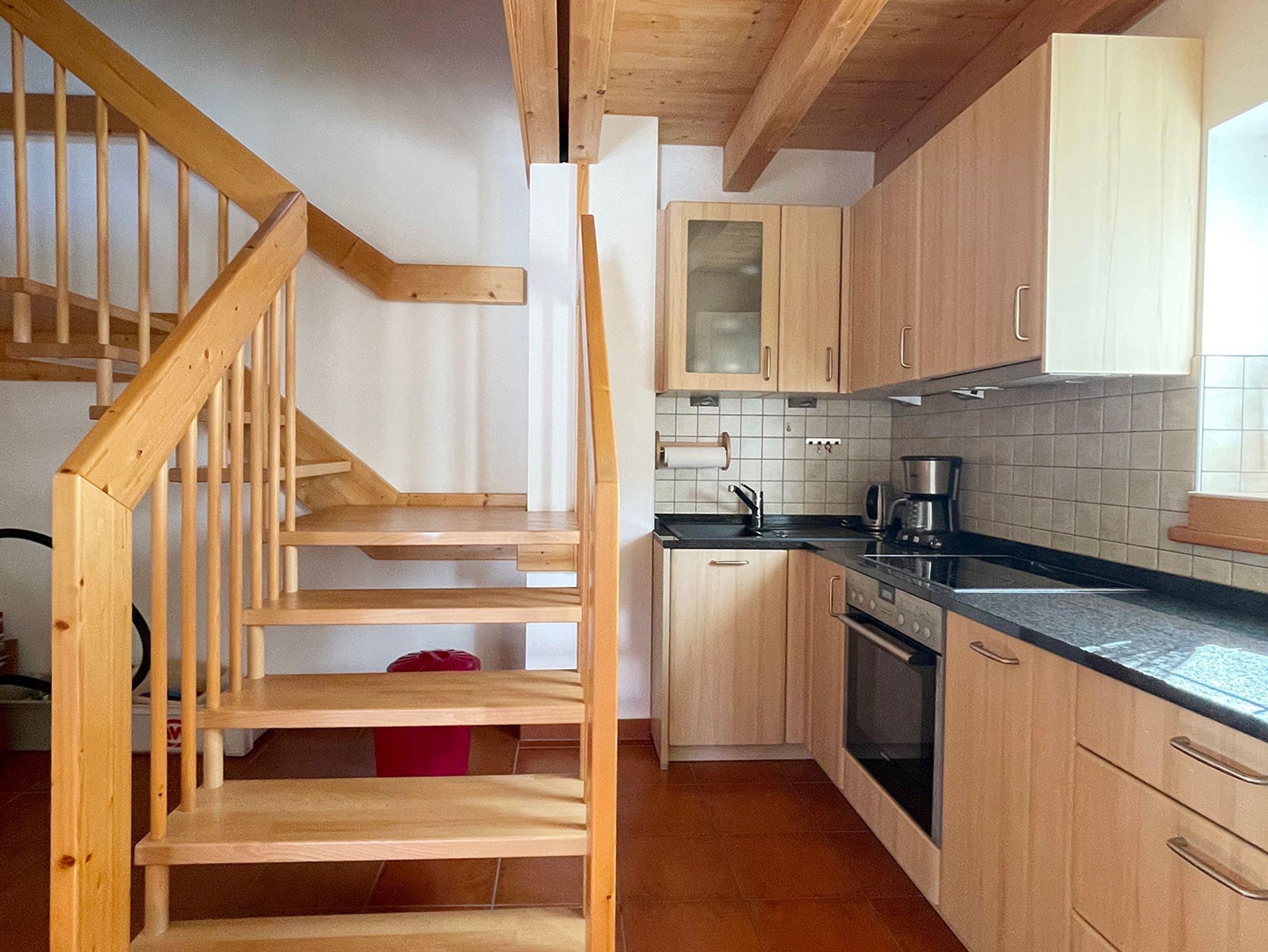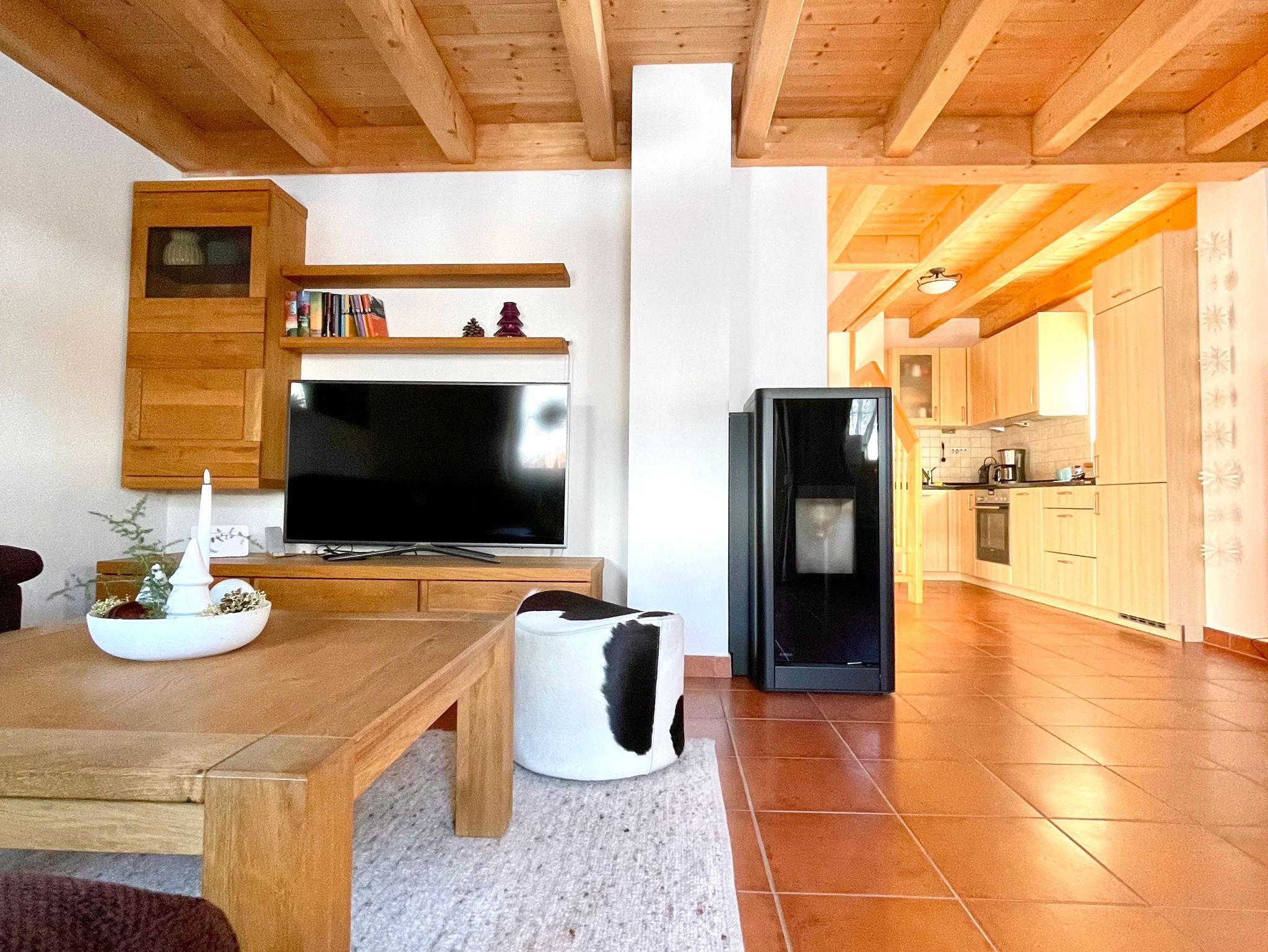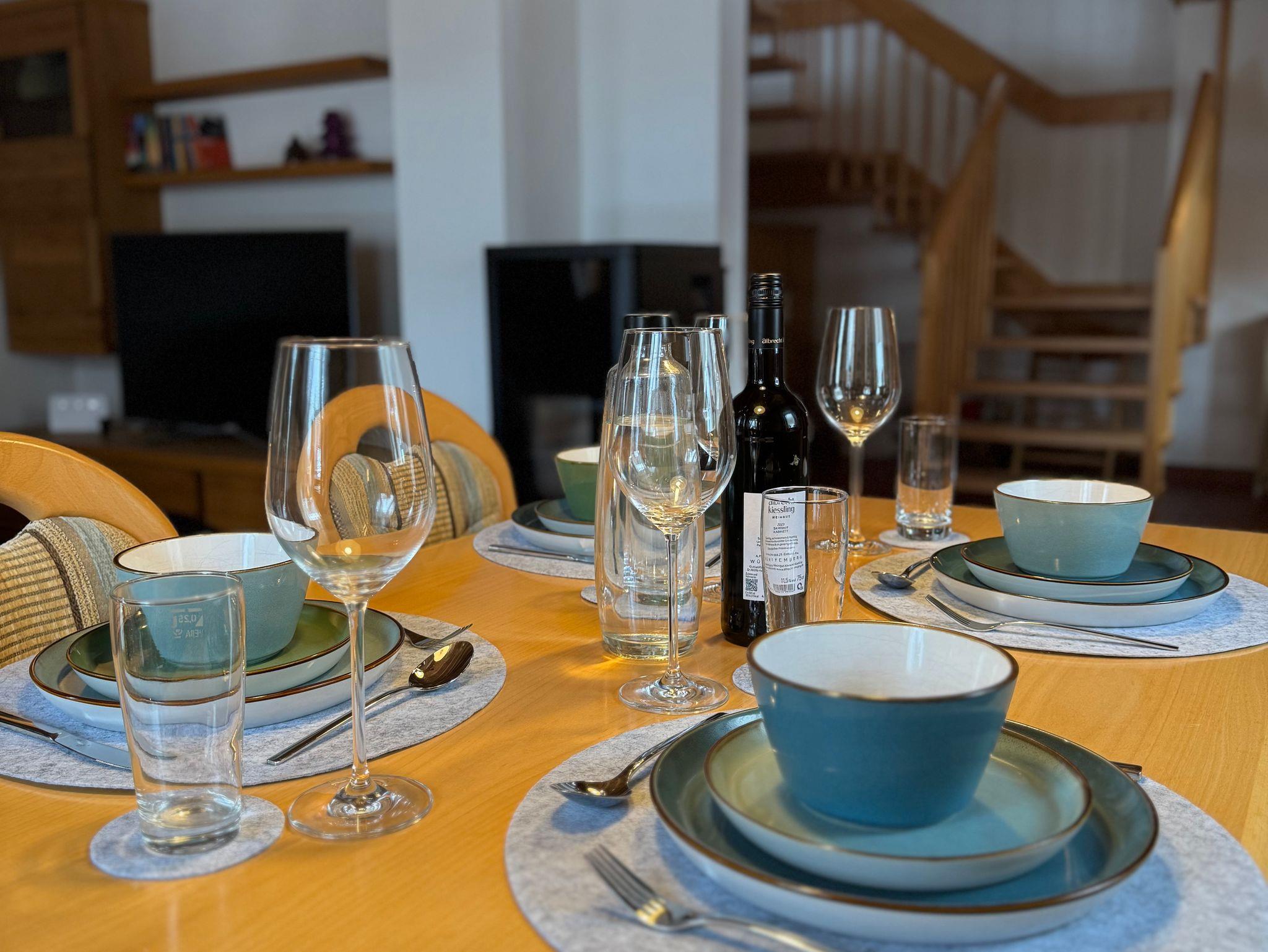 Das Erdgeschoss ist offen und freundlich gestaltet: Hier finden Sie eine voll ausgestattete Küche inklusive Spülmaschine, einen großen Kühlschrank mit Gefrierschrank und weitere zum Kochen wichtige Utensilien. Das offene Wohn-, Esszimmer umfasst eine gemütliche Essecke mit Eckbank – ein Ort für lange Mahlzeiten, Gespräche und Spiele sowie eine große, bequeme Couch zum Lesen und Entspannen mit großem, internetfähigem Flat-TV und kostenlosem WLAN. Ein Kaminofen spendet an kühleren Abenden eine behagliche Wärme, ebenso eine Fußbodenheizung im gesamten Erdgeschoss, die für zusätzlichen Komfort sorgt. Praktisch ergänzt wird das Erdgeschoss durch ein separates WC. Auf der sonnigen Terrasse können Sie den Tag ausklingen lassen und die Ruhe der Umgebung genießen. Bitte beachten Sie, dass Hunde und andere Haustiere in den Wohnungen leider nicht gestattet sind.
