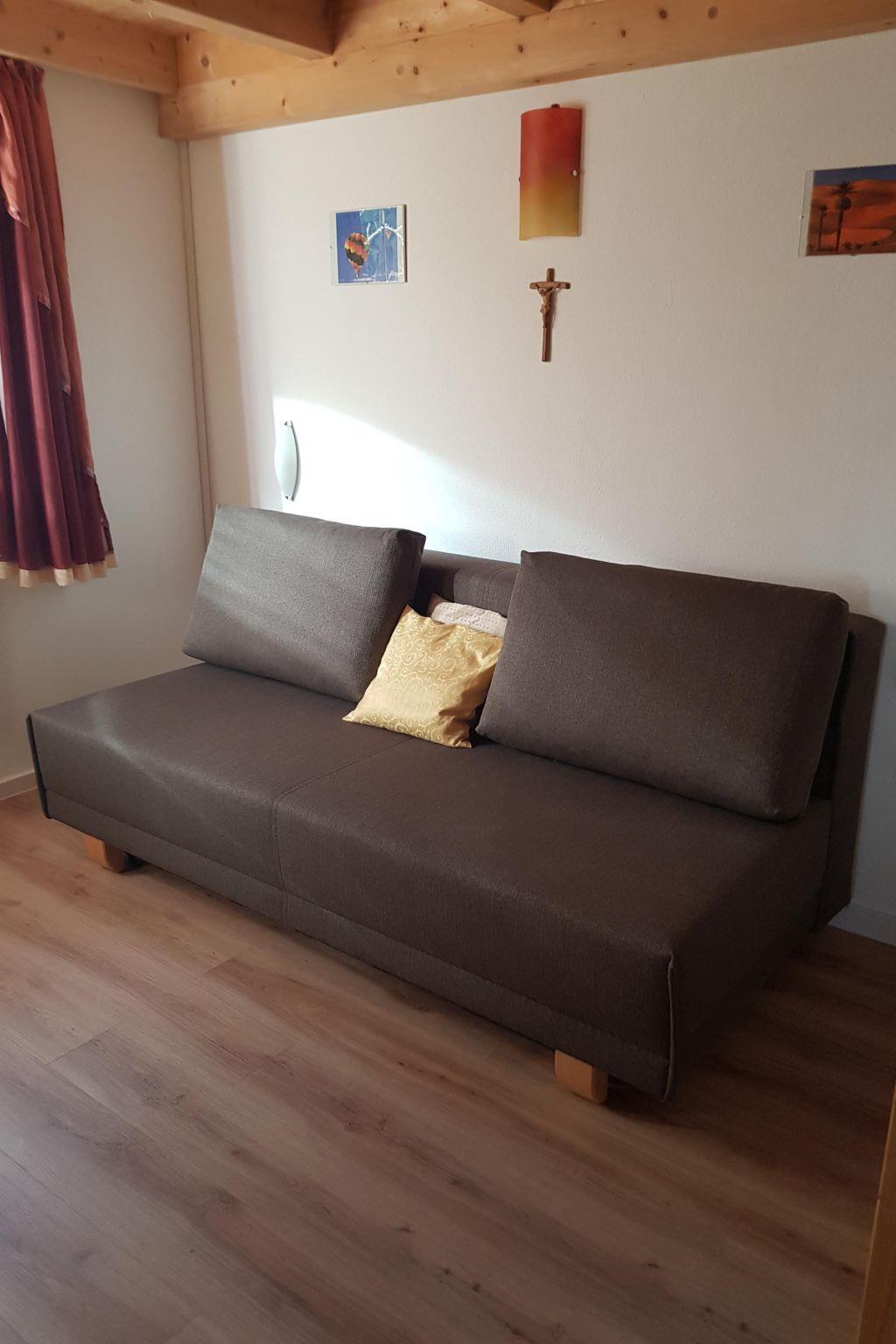 Inside the chalet you will find an inviting atmosphere, characterised by an open kitchen equipped with modern amenities such as a microwave, fridge/freezer, coffee machine, toaster, ceramic hob and oven. A cosy seating area near the wood-burning stove invites you to spend time together. A satellite TV and CD music system provide entertainment. Internet access is available for a fee. Upstairs there are two bedrooms, one with a double bed, large wardrobe and balcony, the other with a sofa bed and a sleeping loft that sleeps three more. A travel cot can be provided on request.