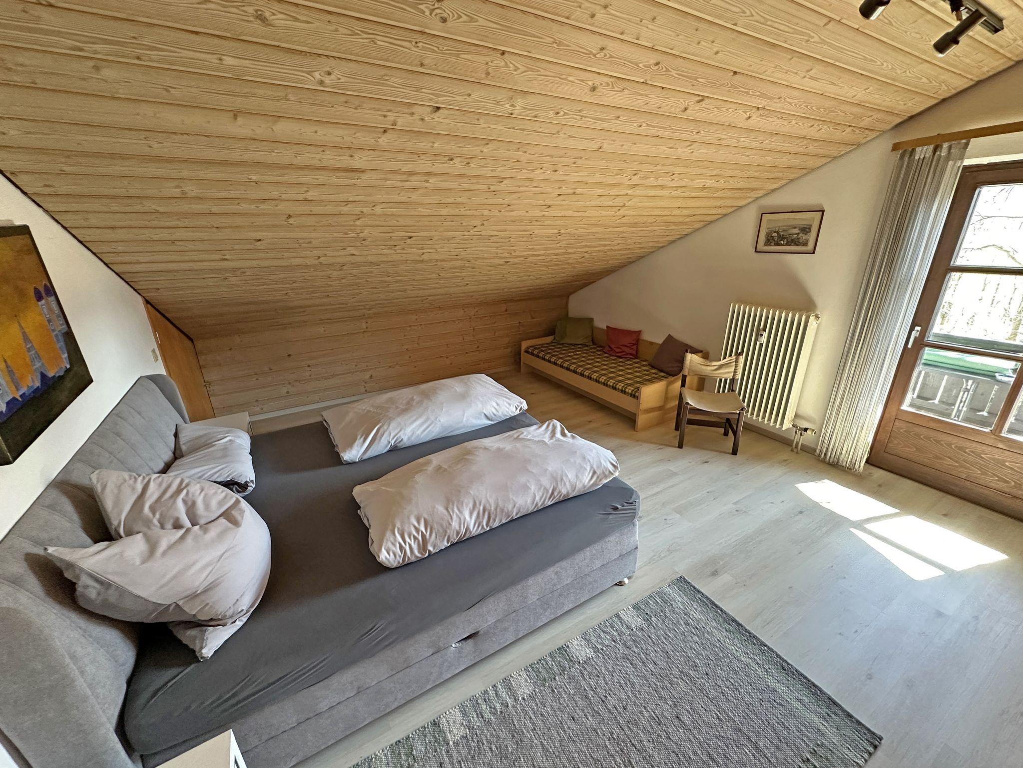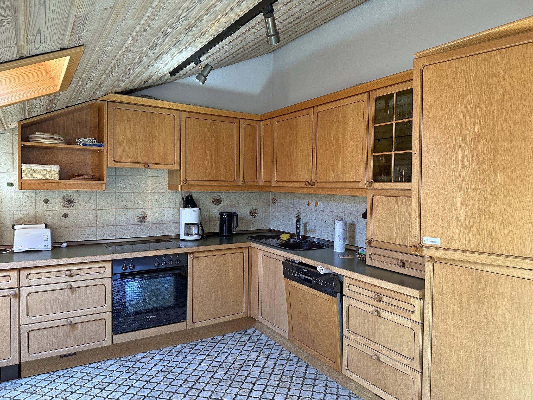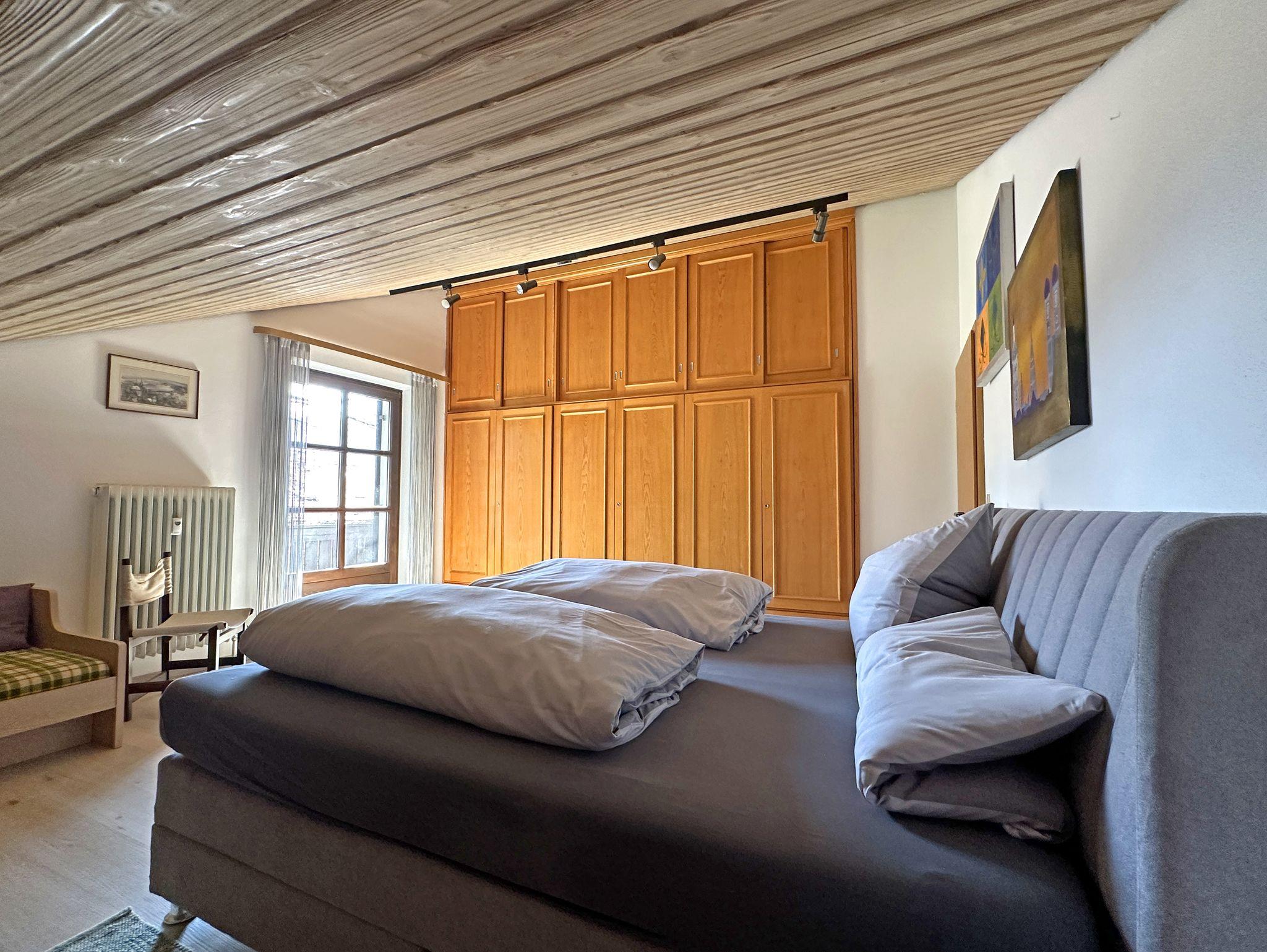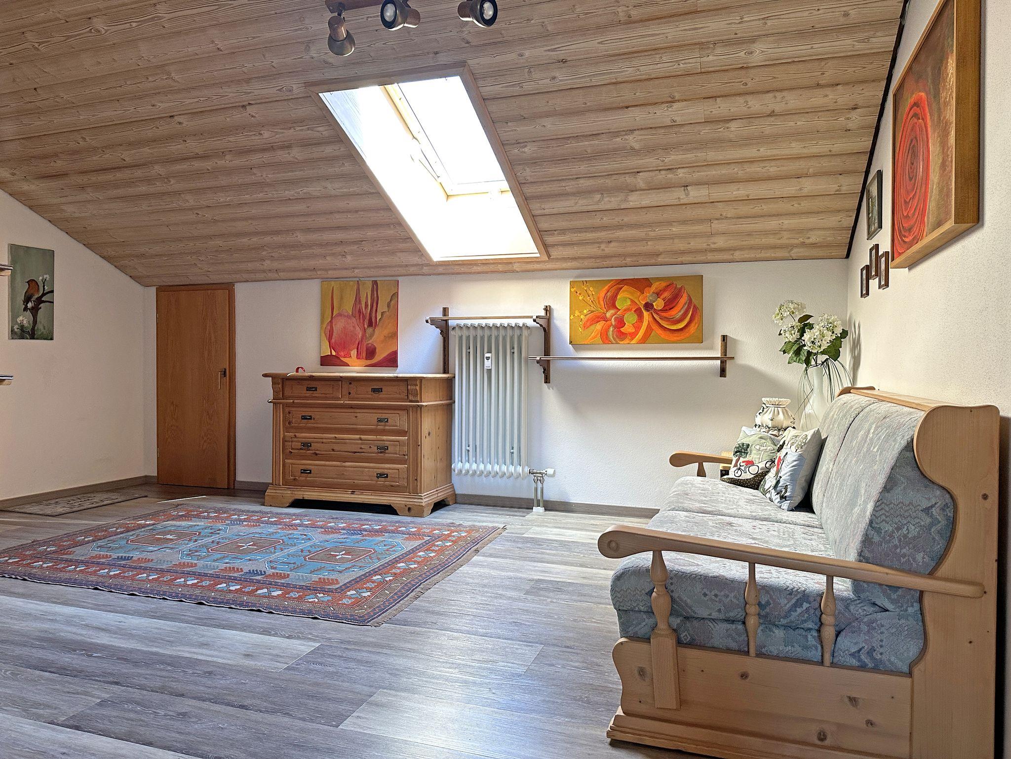Genießen Sie Ihren Aufenthalt in einer großzügigen und lichtdurchfluteten Ferienwohnung im Dachgeschoss eines gepflegten Mehrparteienhauses. Die Wohnung im 2. Stock, erreichbar über ein breites Treppenhaus, bietet eine gemütliche, rustikale Atmosphäre mit liebevollen Details, die zum Wohlfühlen einladen. Erholen Sie sich bei sonnigen Stunden auf dem Südbalkon, der eine schöne Aussicht bietet und den offenen Wohnraum mit natürlichem Licht durchflutet. Der Wohnbereich besticht durch eine großzügige Sitzgruppe und einen Essplatz unter einem hellen Dachfenster – perfekt für gemeinsame Mahlzeiten und entspannte Momente. Die voll ausgestattete Küche mit Geschirrspüler, Mikrowelle, E-Herd sowie Kühl- und Gefrierschrank lässt keine Wünsche offen und macht das Kochen zum Vergnügen. Die Holzdecken und der elektrisch betriebene Kachelofen verleihen der Wohnung ein besonders gemütliches Ambiente, das zum Entspannen einlädt. Das separate Schlafzimmer mit Dachschräge ist ausgestattet mit einem Doppelbett und einem Einzelbett, sodass es sowohl für Paare als auch für Familien geeignet ist. Ein großzügiger Eingangswohnbereich, mit einer ausziehbaren Schlafcouch, bietet eine zusätzliche Schlafmöglichkeit. Badezimmer mit Dusch-/Badewanne und zwei Waschbecken, von Komfort ist ein separates WC.