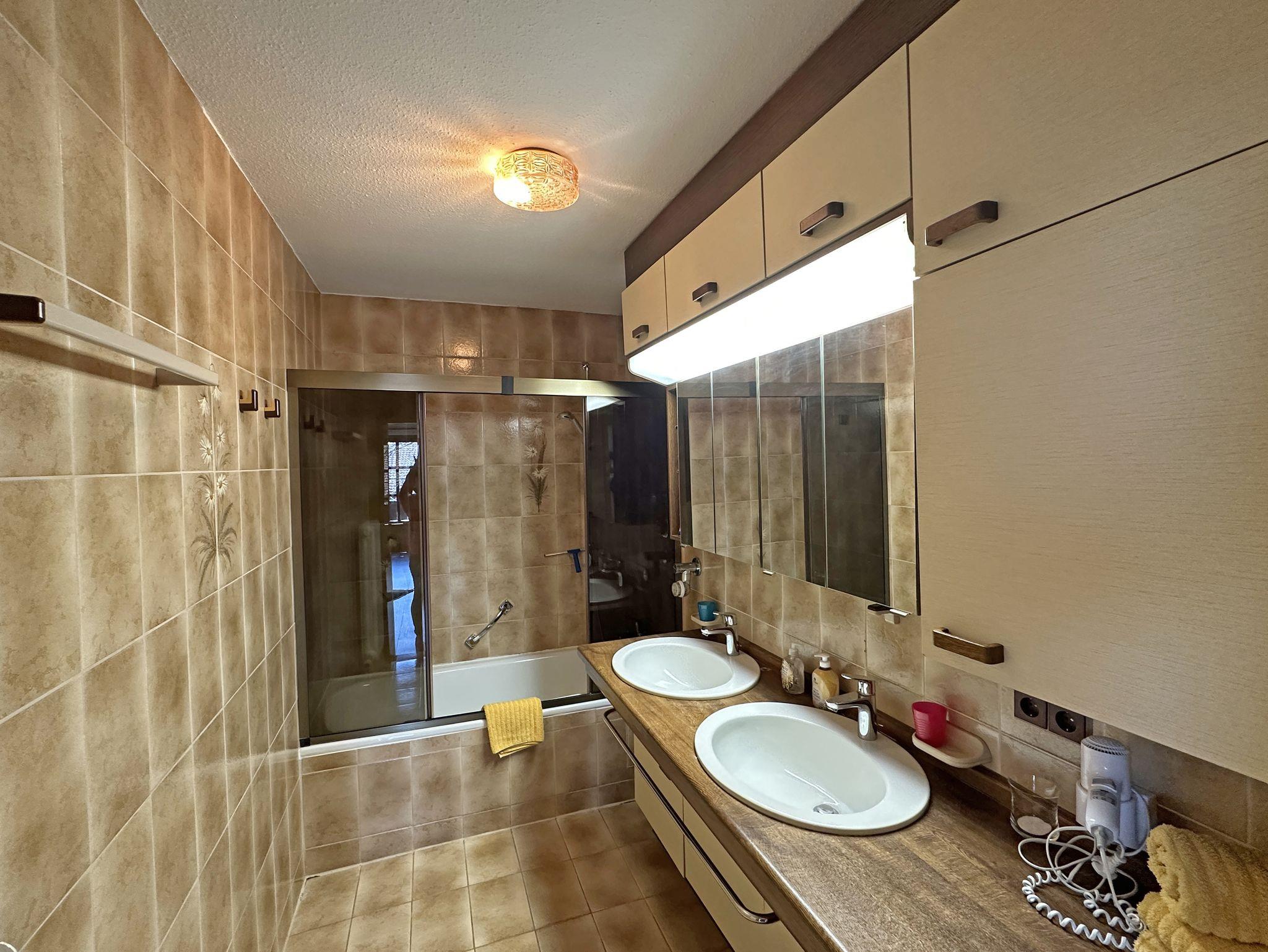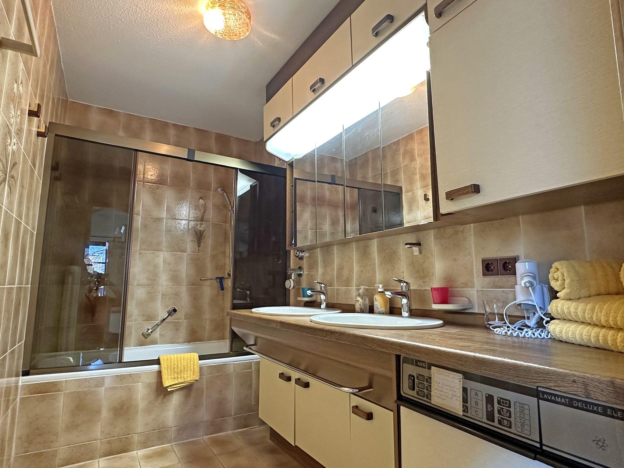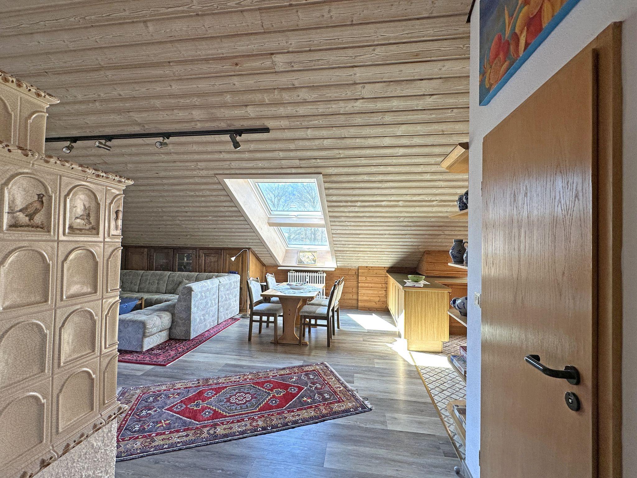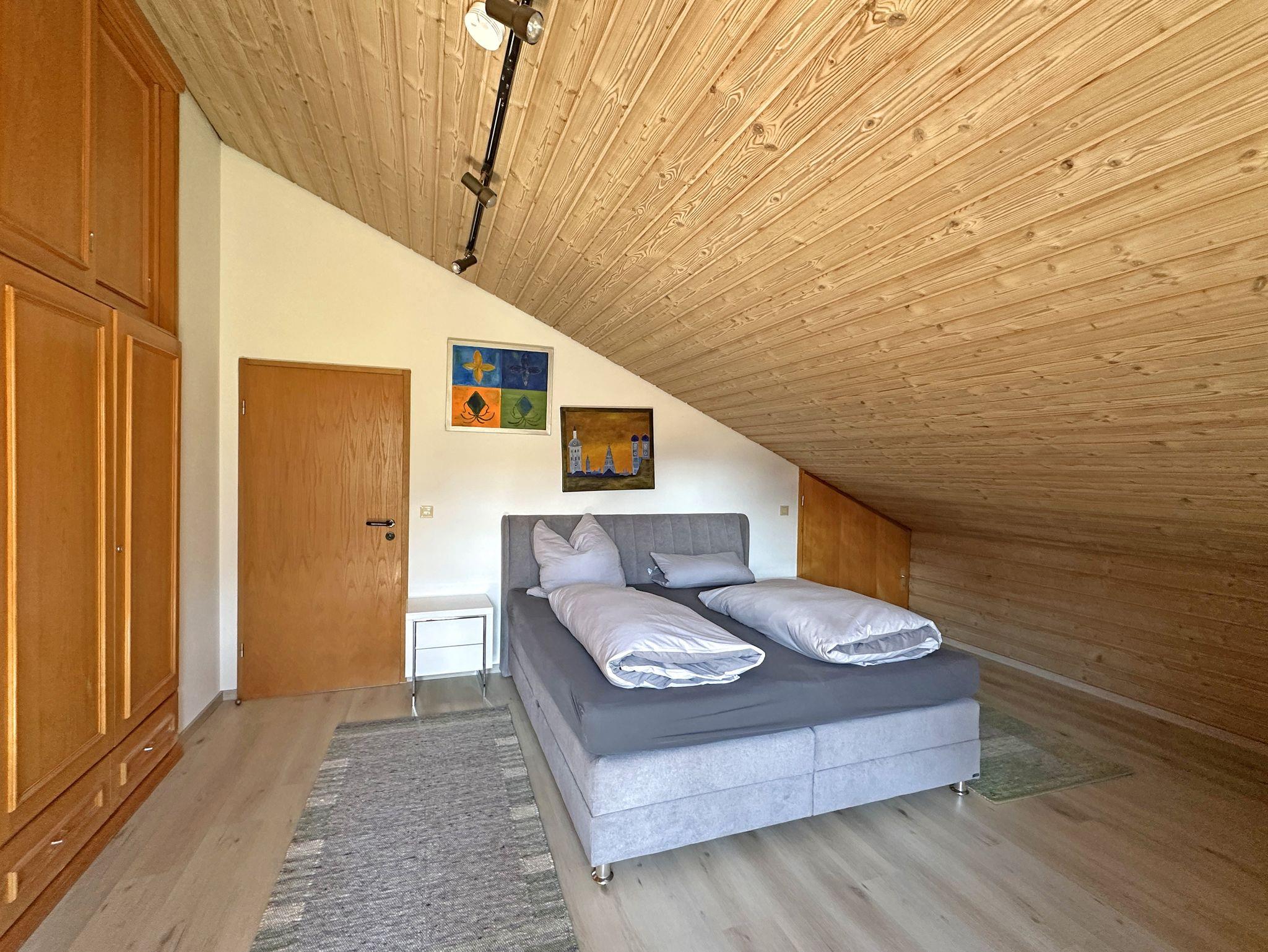 Genießen Sie Ihren Aufenthalt in einer großzügigen und lichtdurchfluteten Ferienwohnung im Dachgeschoss eines gepflegten Mehrparteienhauses. Die Wohnung im 2. Stock, erreichbar über ein breites Treppenhaus, bietet eine gemütliche, rustikale Atmosphäre mit liebevollen Details, die zum Wohlfühlen einladen. Erholen Sie sich bei sonnigen Stunden auf dem Südbalkon, der eine schöne Aussicht bietet und den offenen Wohnraum mit natürlichem Licht durchflutet. Der Wohnbereich besticht durch eine großzügige Sitzgruppe und einen Essplatz unter einem hellen Dachfenster – perfekt für gemeinsame Mahlzeiten und entspannte Momente. Die voll ausgestattete Küche mit Geschirrspüler, Mikrowelle, E-Herd sowie Kühl- und Gefrierschrank lässt keine Wünsche offen und macht das Kochen zum Vergnügen. Die Holzdecken und der elektrisch betriebene Kachelofen verleihen der Wohnung ein besonders gemütliches Ambiente, das zum Entspannen einlädt. Das separate Schlafzimmer mit Dachschräge ist ausgestattet mit einem Doppelbett und einem Einzelbett, sodass es sowohl für Paare als auch für Familien geeignet ist. Ein großzügiger Eingangswohnbereich, mit einer ausziehbaren Schlafcouch, bietet eine zusätzliche Schlafmöglichkeit. Badezimmer mit Dusch-/Badewanne und zwei Waschbecken, von Komfort ist ein separates WC.