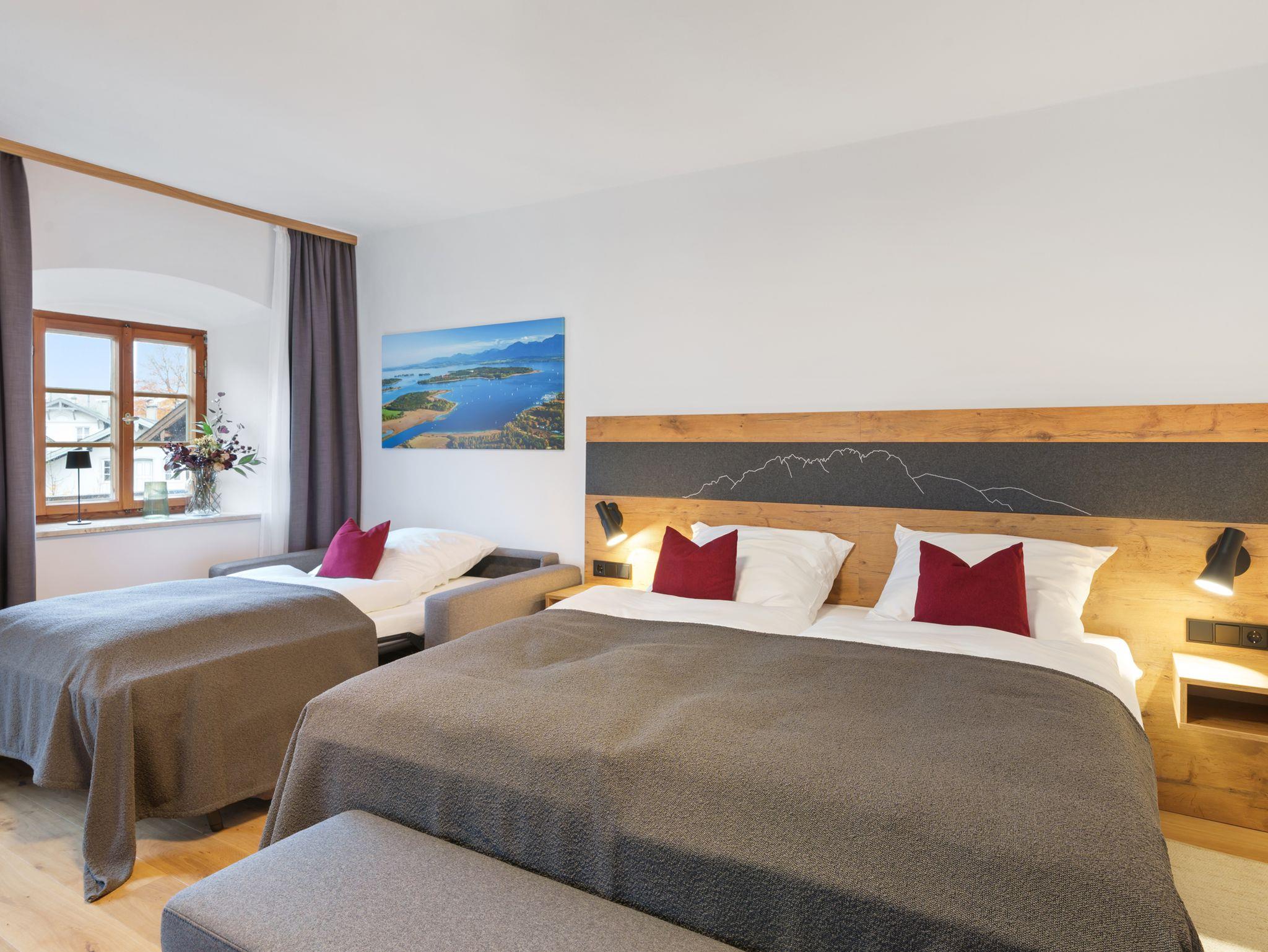 Ihr Wohlfühlzimmer am Kirchberg. Genießen Sie erholsame Urlaubstage in unserem frisch renovierten Zimmer für bis zu 3 Personen oder 2 Erwachsene und 2 kleine Kinder im 1. Obergeschoss. Das komfortable Boxspringbett (180 x 200 cm) sorgt für traumhaften Schlaf, während die ausklappbare Schlafcouch mit hochwertiger Matratze (130 x 195 cm) eine gemütliche Zusatzschlafmöglichkeit für eine erwachsene Person oder zwei kleine Kinder bietet.