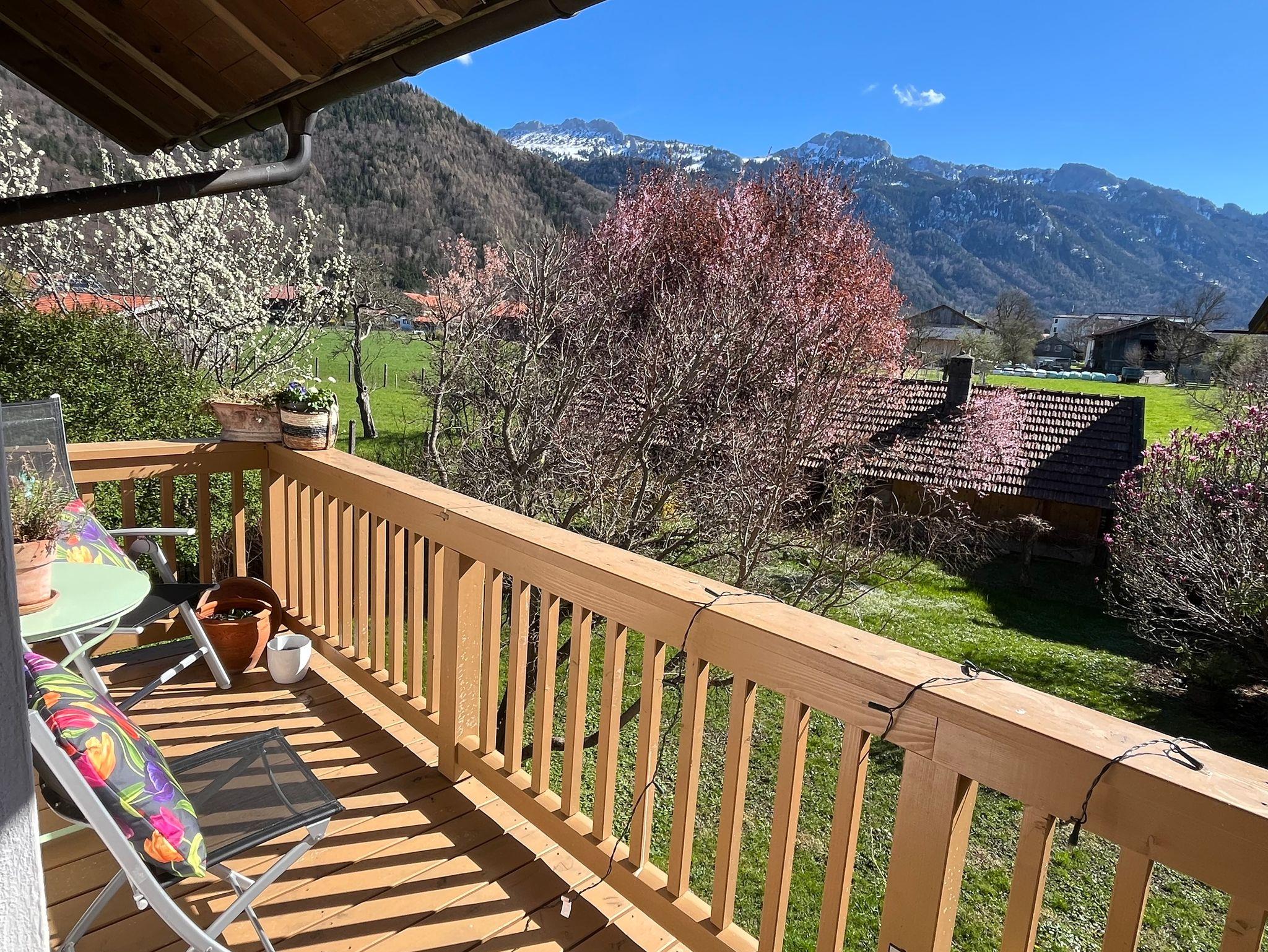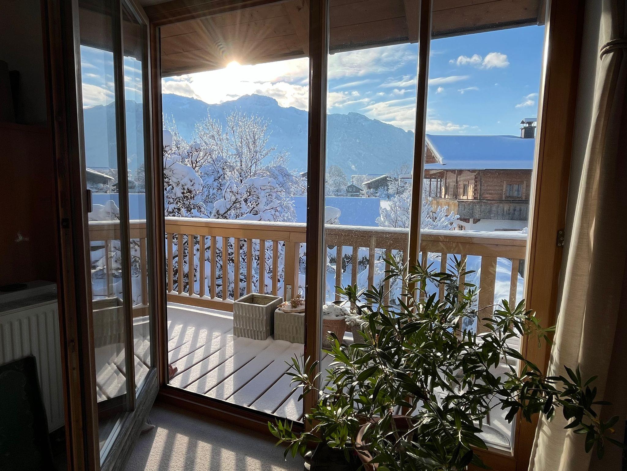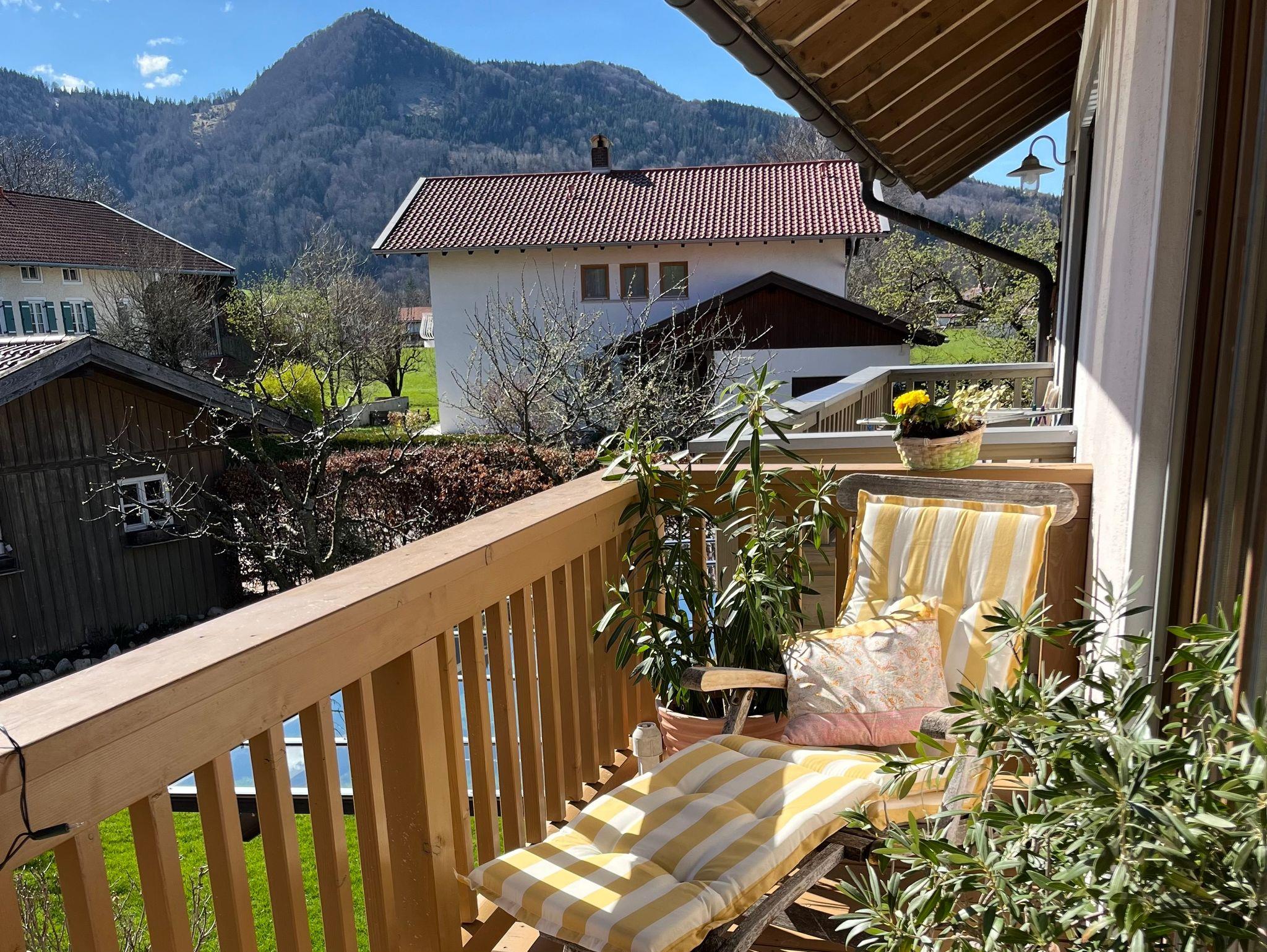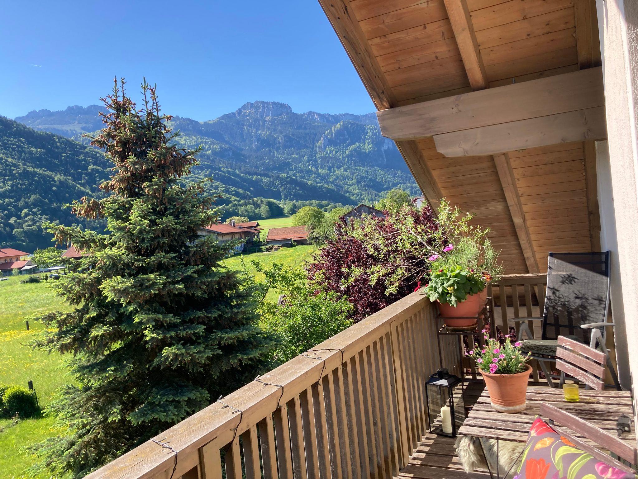 KampenWinkel: Traumhafter Bergblick: Zwei Balkone auf zwei Etagen. Biken & Wandern ab Haus. Die Ferienwohnung KampenWinkel ist eine schöne, gemütliche Maisonette-Ferienwohnung auf zwei Ebenen (68 qm) mit zwei großen Balkonen und fantastischem Blick auf die Kampenwand - zum In-die-Ferne Schauen, Träumen und Seele baumeln lassen. Beide Balkone sind gut ausgestattet mit Liegestuhl und Sitz- bzw. Essgelegenheiten.
