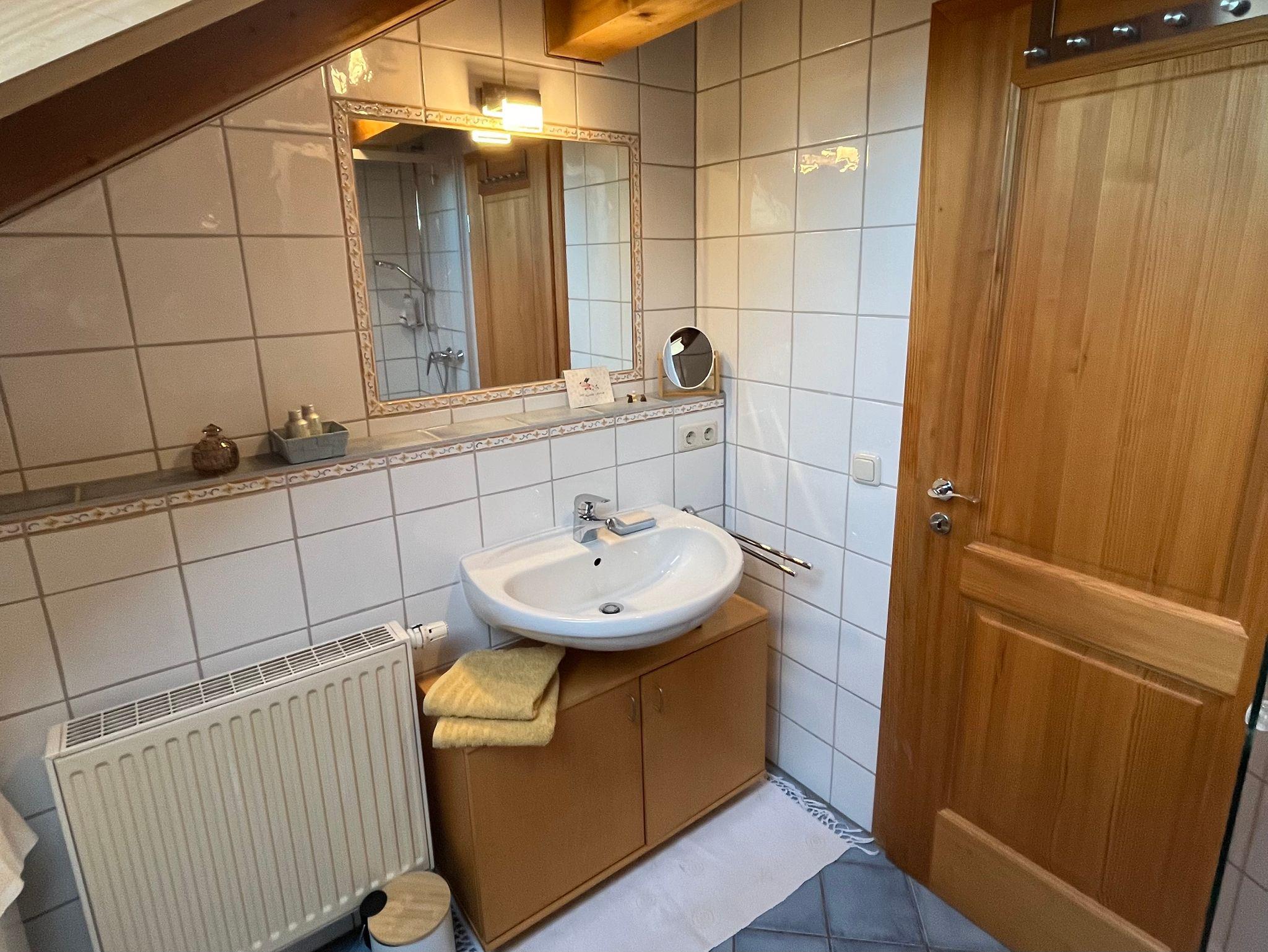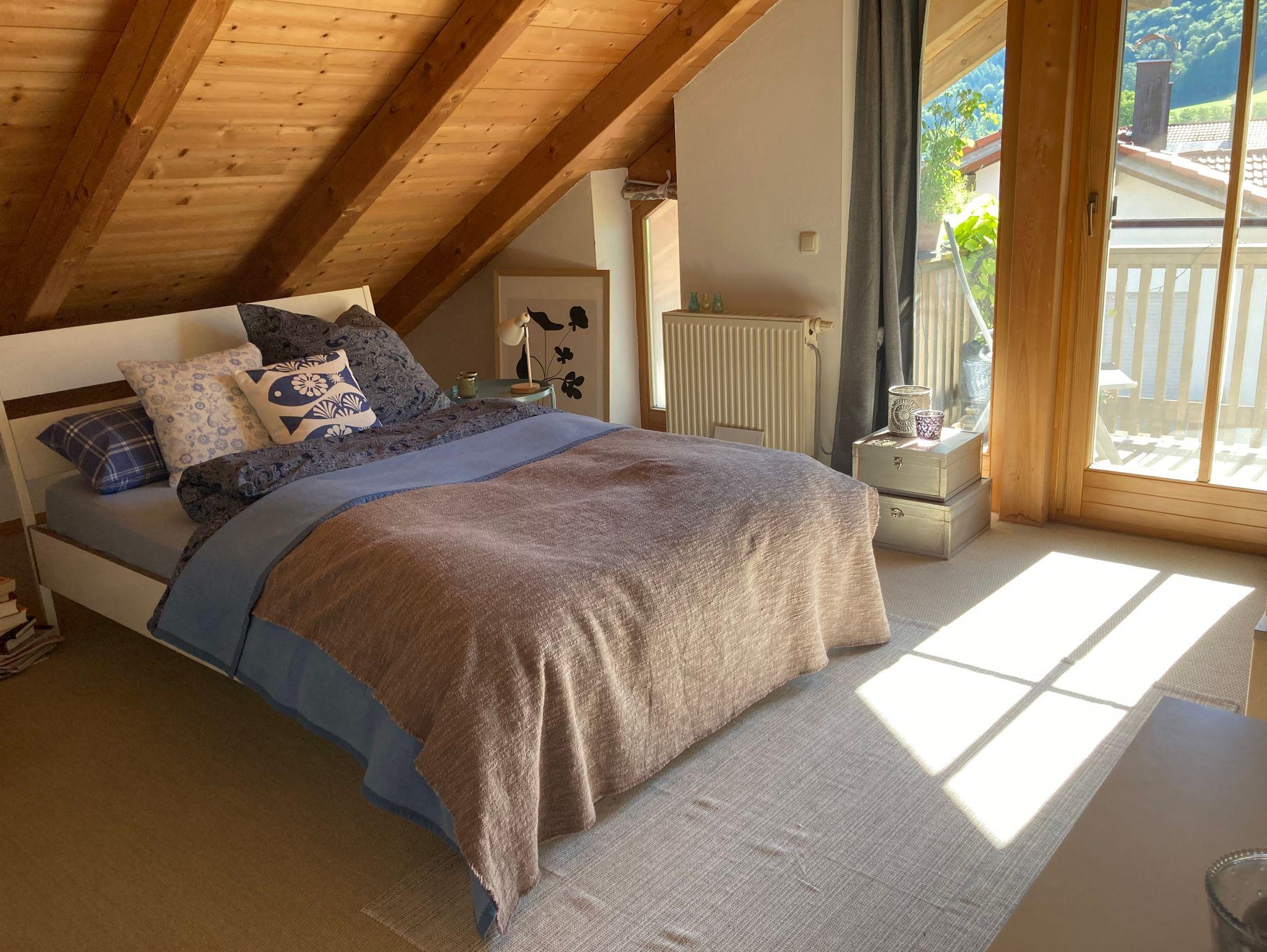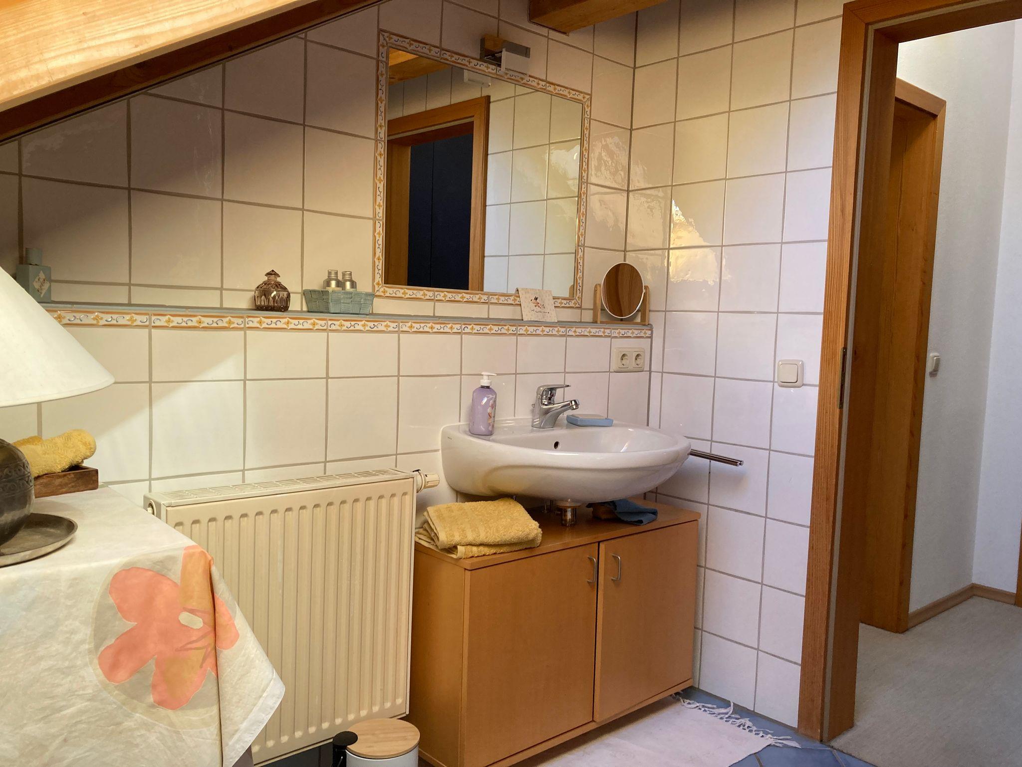 Im oberen Stockwerk (2. Stock / Dachgeschoss) sind das Schlafzimmer mit französischem Bett 1,40 x 2 m und ein Wohnzimmer mit Smart-TV, kostenloses W-LAN, kleiner Arbeitsplatz und einem komfortablen Schlafsofa (1,40 x 2 m / Lattenrost) und das Badezimmer. Dieses verfügt über eine Badewanne, eine separate Dusche mit Glastüre und eine Toilette. Dazu noch eine Waschmaschine und einen Fön.
