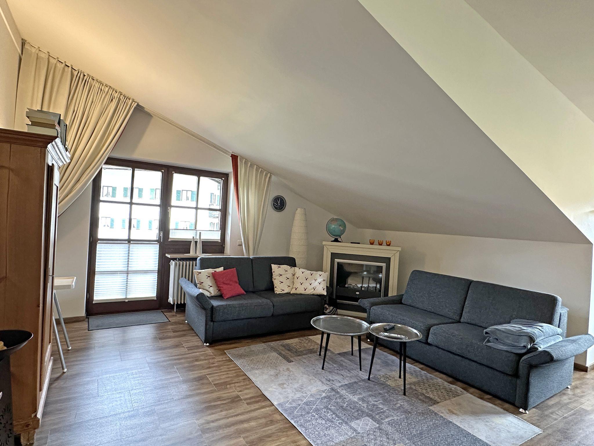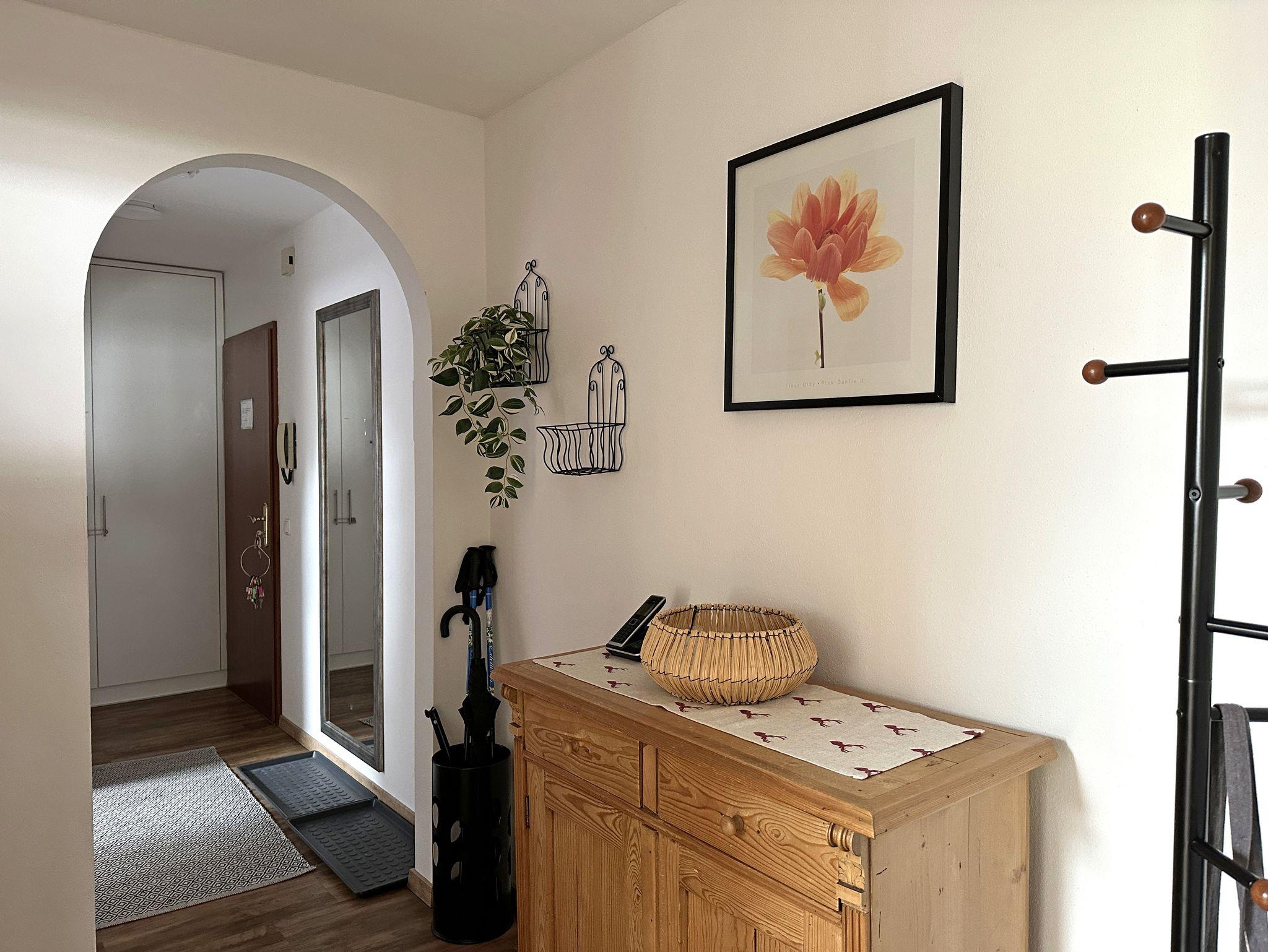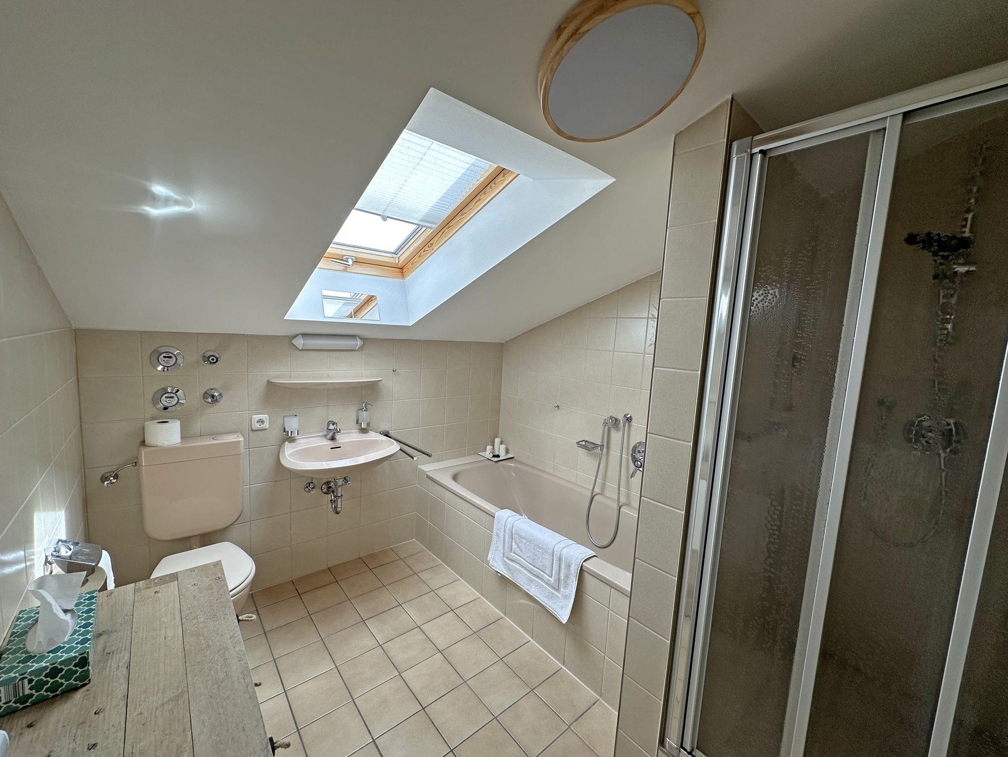 Sehr ruhig gelegene Ferienwohnung im 1. Stock, 73 qm mit teilweise leichter Mansarde und schönem Balkon mit Abendsonne. Die geräumige Wohnung verfügt über ein Schlafzimmer, ein Badezimmer mit Fenster, Dusche und Badewanne, Fön, sowie 2024 durch eine Gaube komplett neugestalteten, großen Wohnraum mit erweiterter Küche, Ess- und Wohnzimmer und neuem Vinylboden.