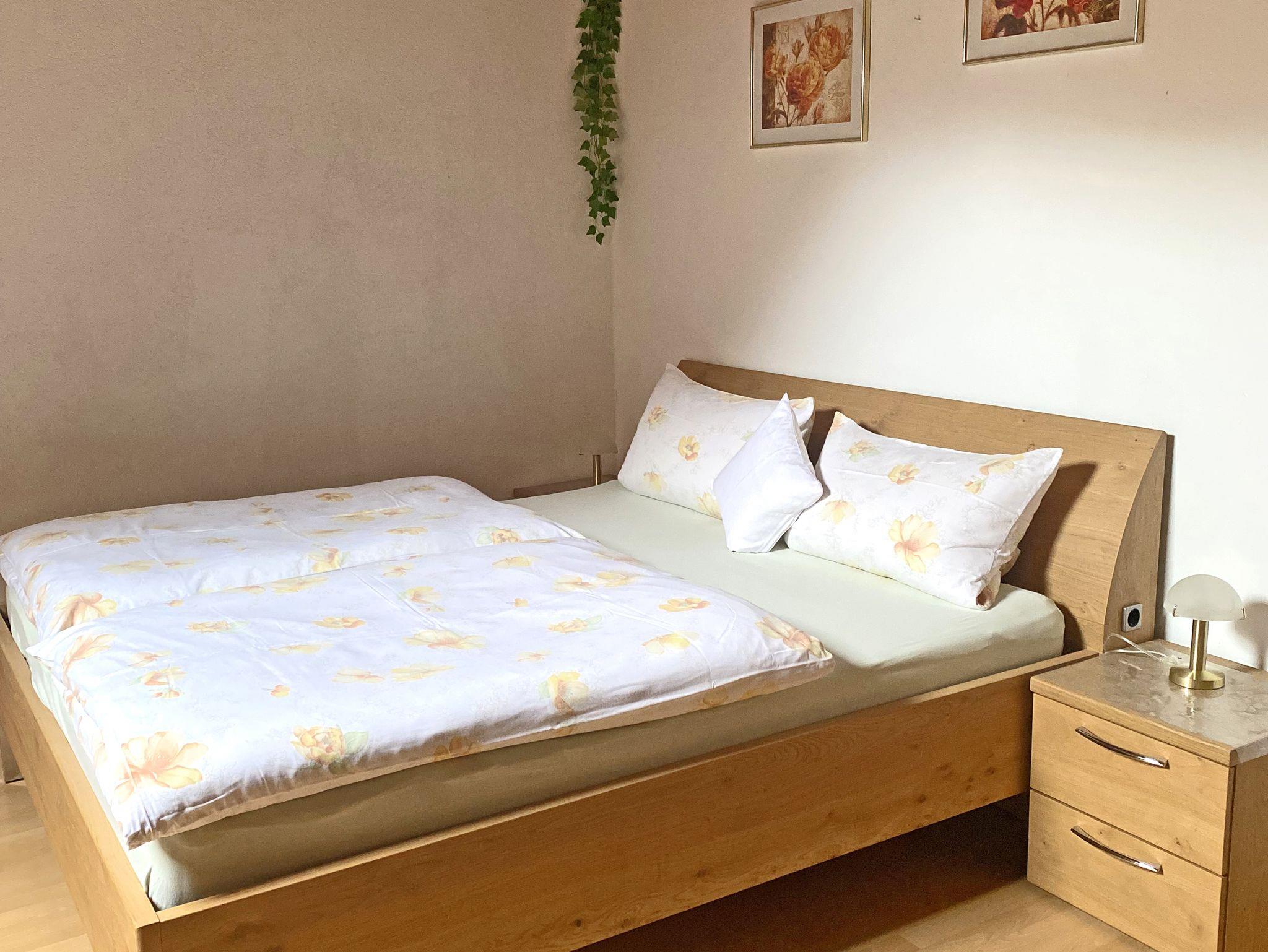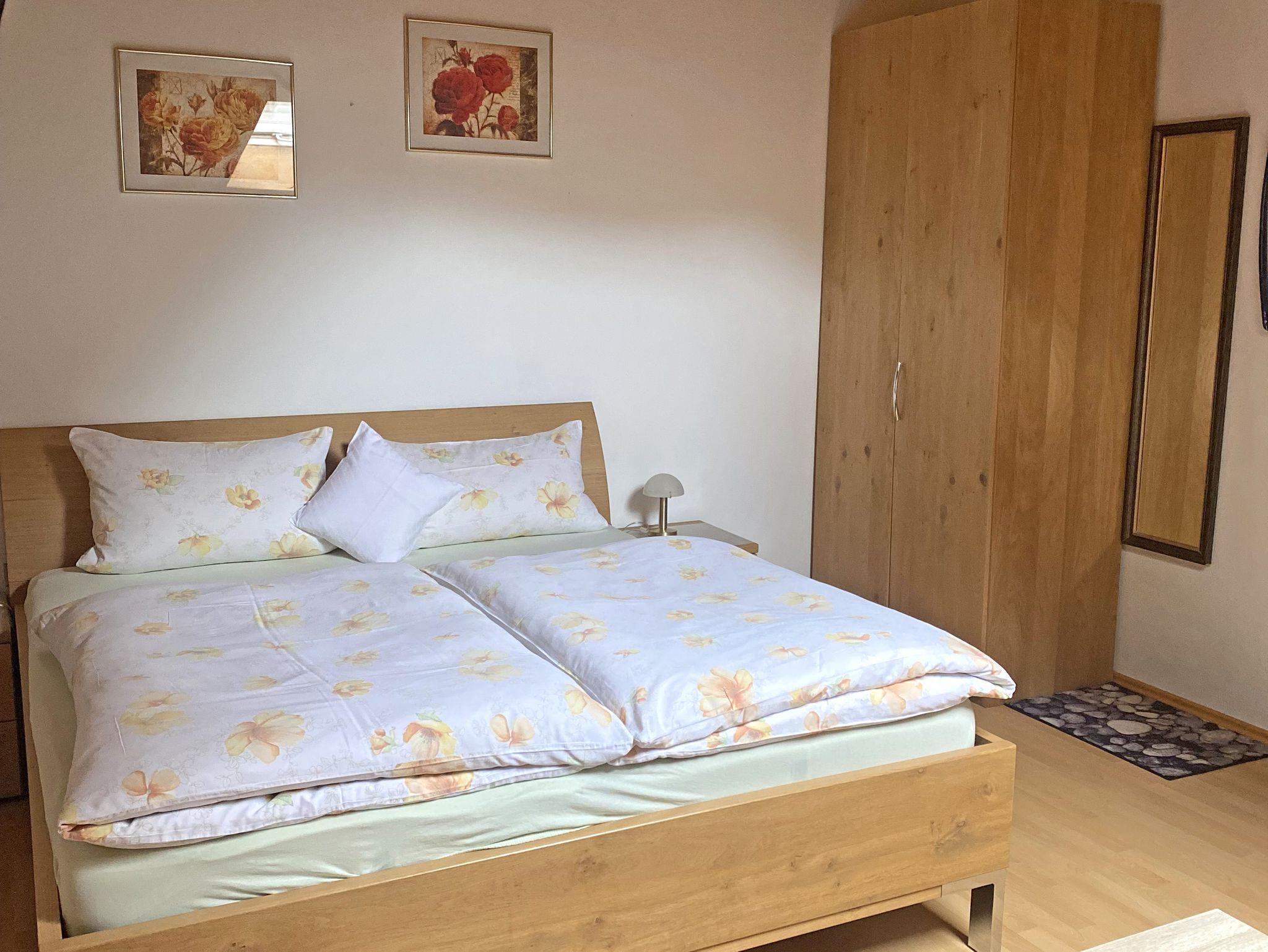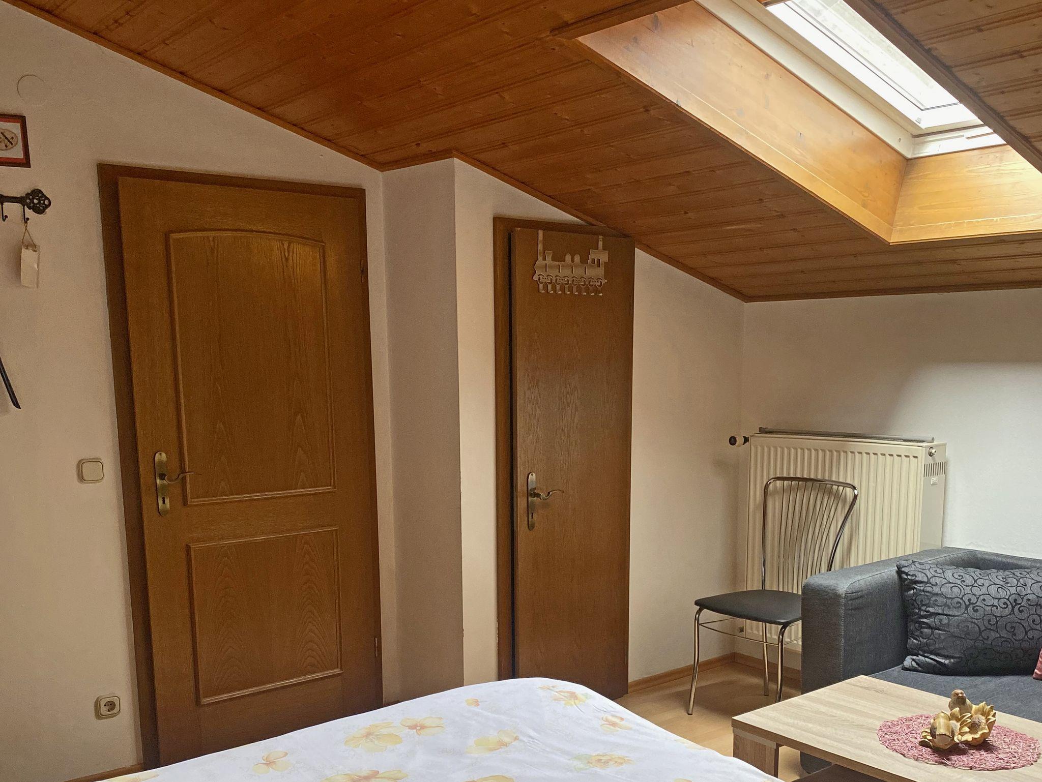 Das kleinere der beiden Gästezimmer mit ca. 18 qm liegt in der Mansarde im 1. Obergeschoss. Das Dachfenster verfügt über einen Rollladen zur Verdunkelung.