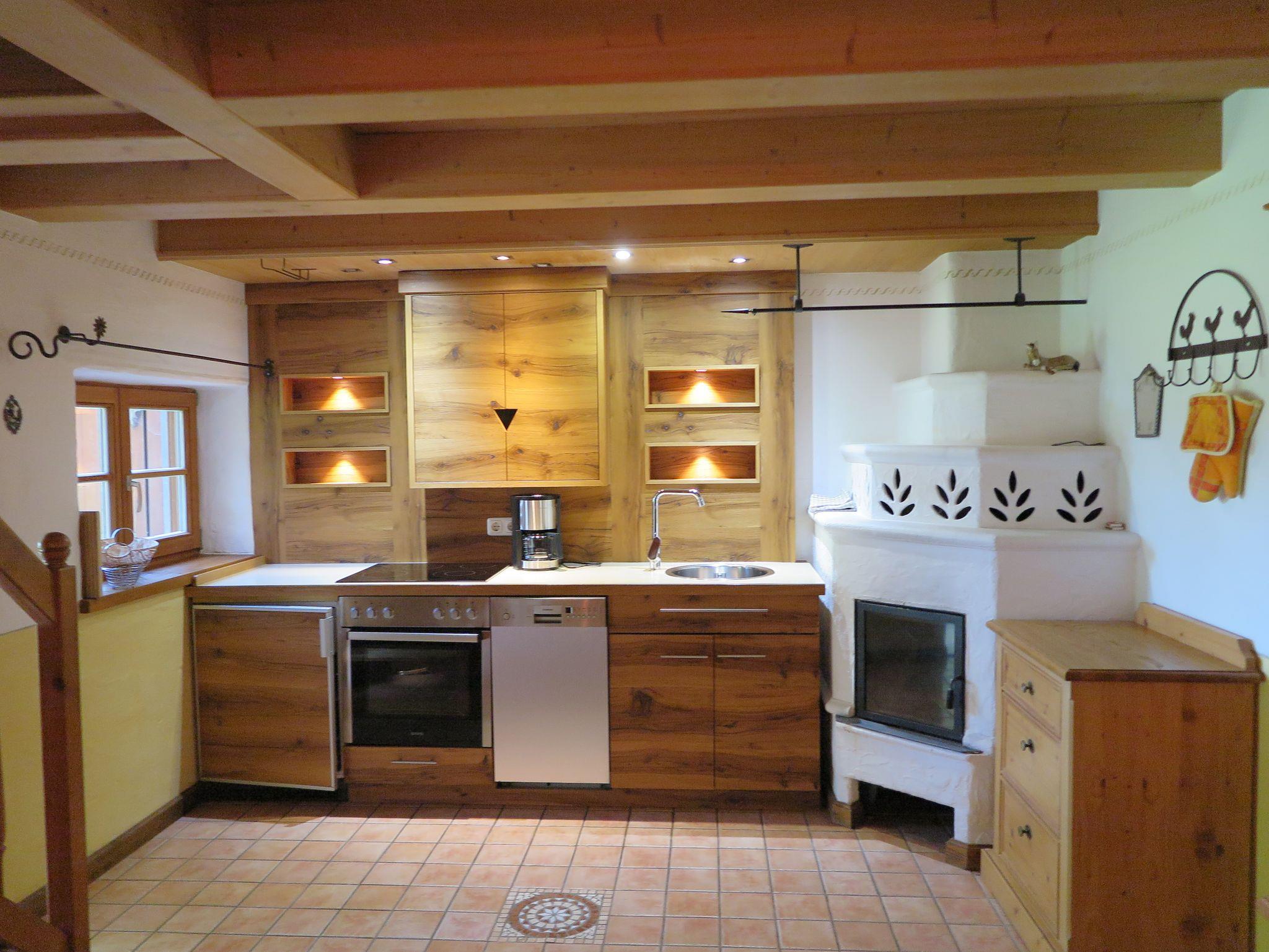 Vollausgestattete Küche. Der Kachelofen verbreitet wohlige Wärme in der kalten Jahreszeit.