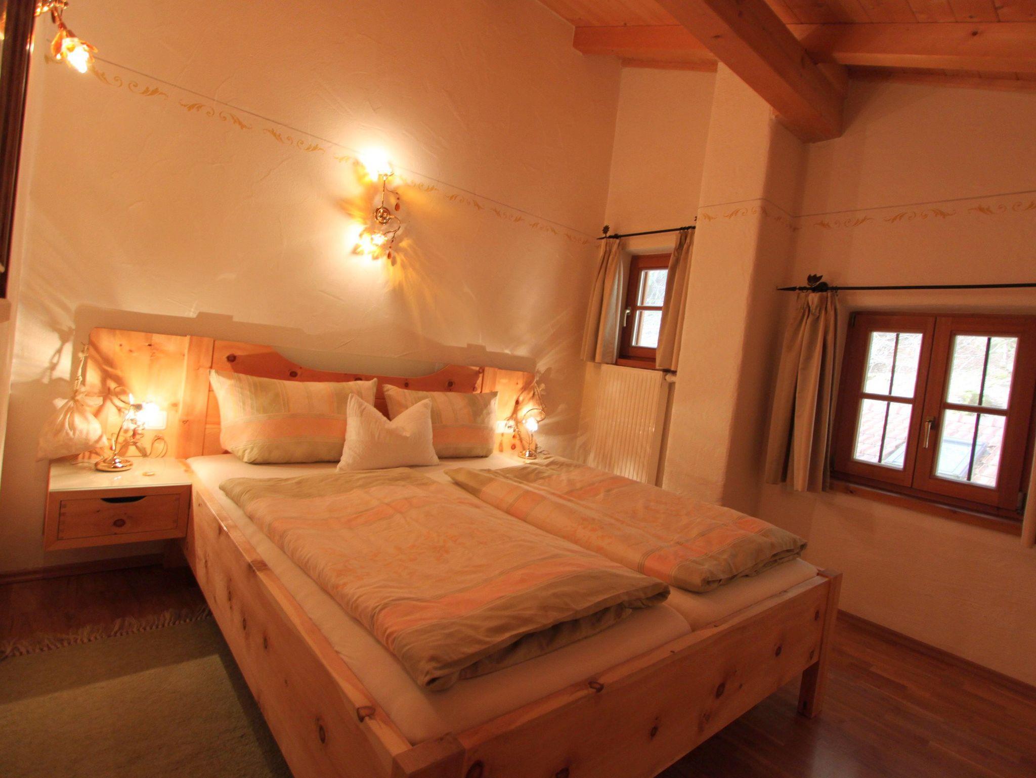 Moderne, baubiologische Einrichtung, Parkett- und Fliesenböden. Erholsamer Schlaf in unseren Zirbenbetten ist garantiert.
