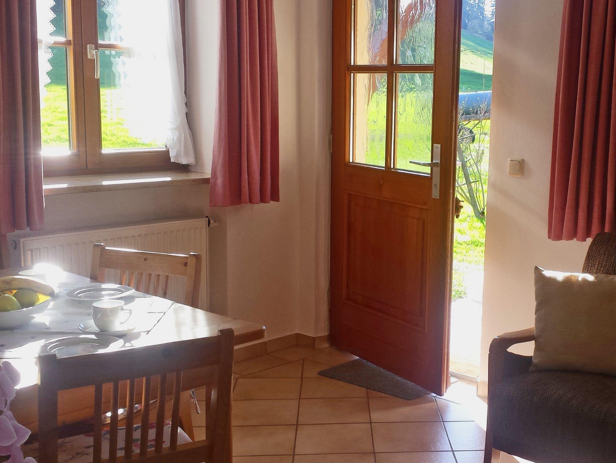 Unsere ebenerdige Nichtraucher-Ferienwohnung Paradies, mit separatem Eingang und gemütlicher Sonnenterrasse mit Liegewiese, lädt Sie zum Träumen, Entspannen und Faulenzen ein. Wohnraum mit Ausziehcouch und großem Esstisch mit Eckbank und Stühlen, SAT-TV, kostenloses WLAN. Komplett ausgestattete Küche mit Mikrowelle, Cerankochfeld, Kühlschrank mit Tiefkühlfach, Kaffeemaschine, Wasserkocher, Toaster, Geschirrtücher sind vorhanden. Großes Badezimmer Du/WC, Fön, Handtücher mit Fußbodenheizung und zwei Fenstern. Separates Schlafzimmer mit Doppelbett, Bettwäsche und Parkettboden. Die gesamte Wohnung ist mit Parkett- und Fließenböden. Autostellplatz vor der Eingangstüre. Sie dürfen gerne gegen Aufpreis Ihren Hund mitbringen. Durch die ebenerdige Lage ist unsere Ferienwohnung behindertenfreundlich, für Rollstuhlfahrer ist die Wohnung leider nicht geeignet, da die Dusche nicht befahrbar ist.