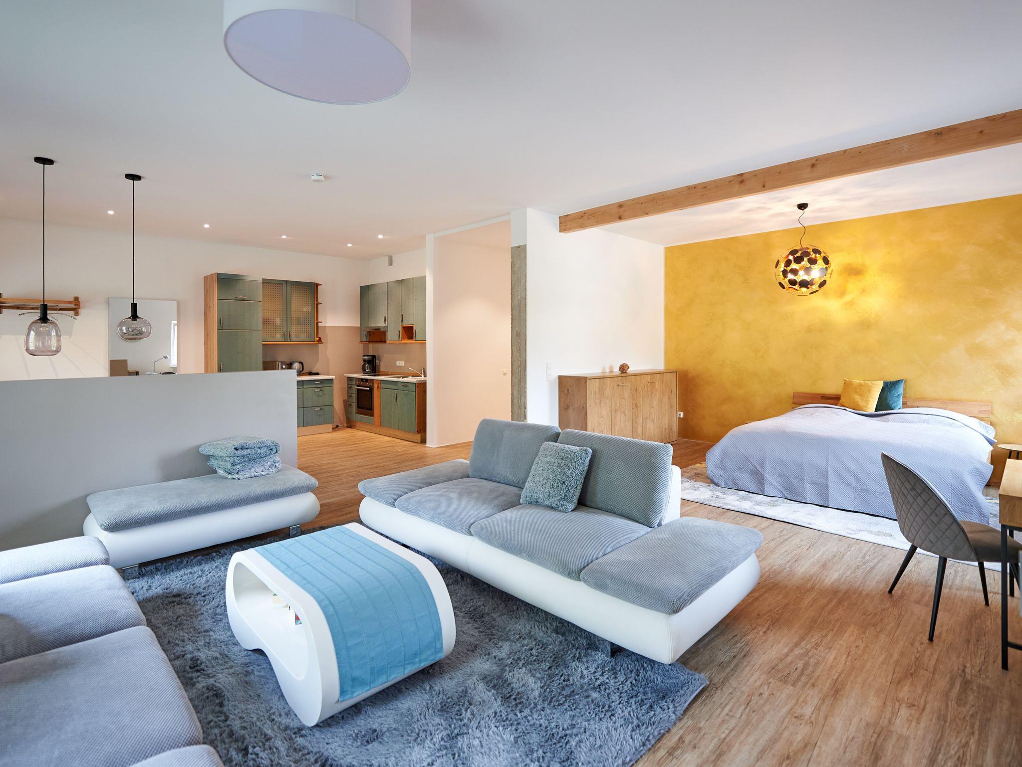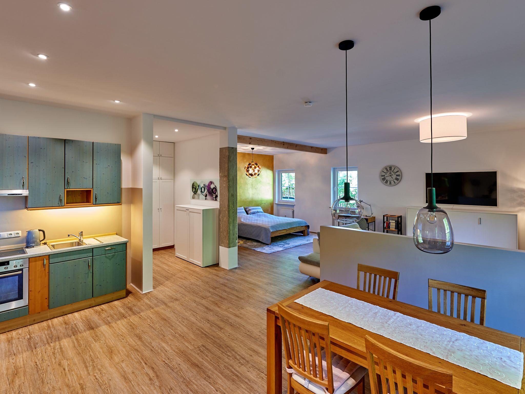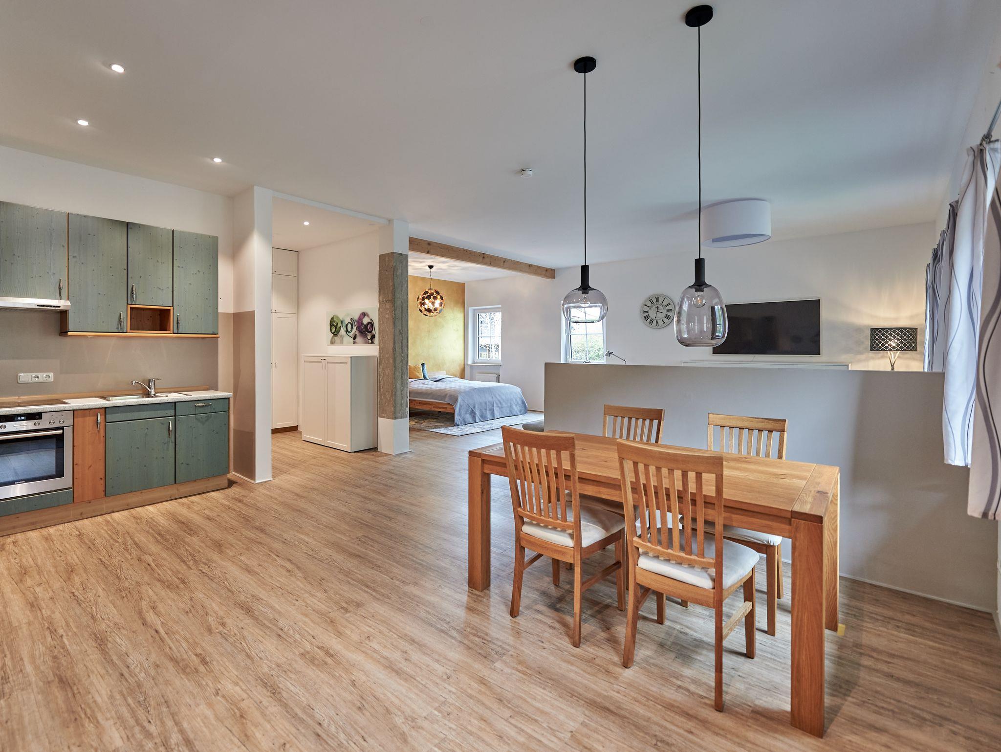 Die Wohnung wurde 2022 mit viel Liebe als Ferienwohnung umgestaltet. Wohnen Sie in einer geschmackvoll eingerichteten offenen und hellen Loft-Wohnung, 75 qm im Erdgeschoss. Mit viel Liebe zum Detail wurde der fast 3 m hohe, loftartige Raum modern eingerichtet und bietet großzügigen Wohnraum. Offener Schlafraum mit Doppelbett 180x200 cm und stilvollem Einzelbett 90x200 cm (bei Bedarf zum Ausklappen für die 3. Person). Wohnbereich mit großer Couchlandschaft, stilvollem Einzelbett 90x200 cm (bei Bedarf zum Ausklappen für die 4. Person), großem Flat-TV/Radio mit Bildfunktion, Stehlampe, Schreibtisch, kostenlosem WLAN. Großer Essbereich mit Esstisch und Stühlen, offener Einbauküche mit Kühlschrank, Tiefkühlfach, Spülmaschine, Mikrowelle, Kaffeemaschine, Wasserkocher, Herd mit Ceranfeld und Backofen, Reinigungsmittel und Geschirrtücher. Das Bad ist modern gefliest mit Badewanne, ebenerdiger Dusche, Waschbecken, WC, Regal, Handtuchheizkörper, Kosmetikspiegel mit Beleuchtung und Fön. Handtücher, Bettwäsche und Pflegeprodukte sind kostenlos. Eigener Eingang mit Terrasse und Blick auf die Berge und ins Grüne. Haustiere und Hunde dürfen leider nicht mitgebracht werden. Ein Auto-Stellplatz Sicado befindet sich direkt neben der Wohnung und ist für Sie kostenlos reserviert.