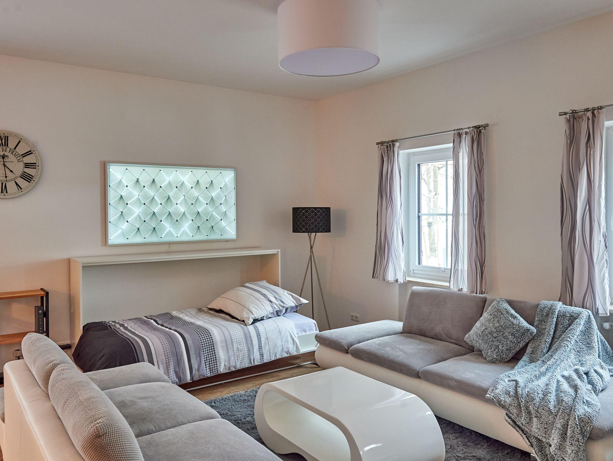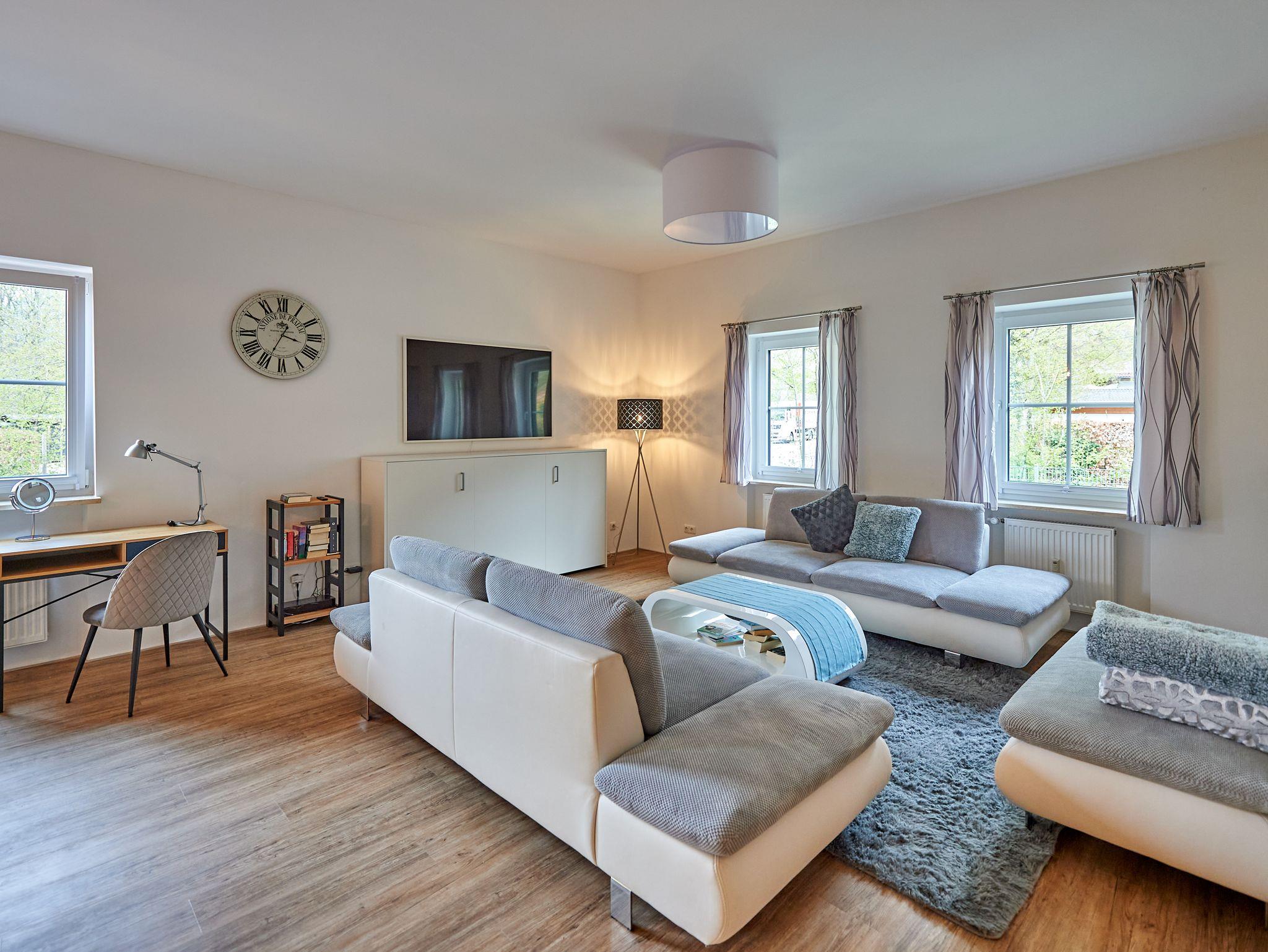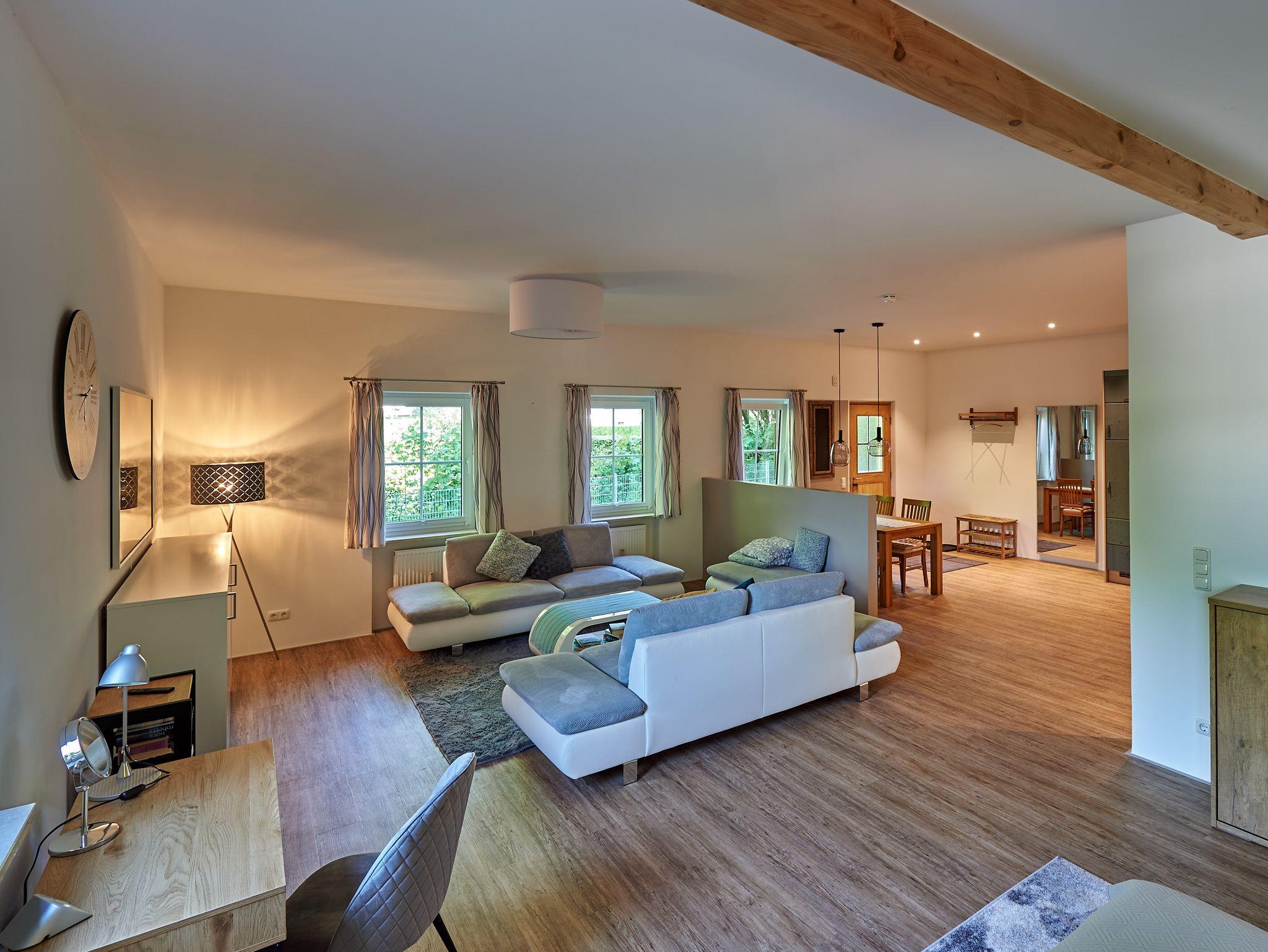 Die Wohnung wurde 2022 mit viel Liebe als Ferienwohnung umgestaltet. Wohnen Sie in einer geschmackvoll eingerichteten offenen und hellen Loft-Wohnung, 75 qm im Erdgeschoss. Mit viel Liebe zum Detail wurde der fast 3 m hohe, loftartige Raum modern eingerichtet und bietet großzügigen Wohnraum. Offener Schlafraum mit Doppelbett 180x200 cm und stilvollem Einzelbett 90x200 cm (bei Bedarf zum Ausklappen für die 3. Person). Wohnbereich mit großer Couchlandschaft, stilvollem Einzelbett 90x200 cm (bei Bedarf zum Ausklappen für die 4. Person), großem Flat-TV/Radio mit Bildfunktion, Stehlampe, Schreibtisch, kostenlosem WLAN. Großer Essbereich mit Esstisch und Stühlen, offener Einbauküche mit Kühlschrank, Tiefkühlfach, Spülmaschine, Mikrowelle, Kaffeemaschine, Wasserkocher, Herd mit Ceranfeld und Backofen, Reinigungsmittel und Geschirrtücher. Das Bad ist modern gefliest mit Badewanne, ebenerdiger Dusche, Waschbecken, WC, Regal, Handtuchheizkörper, Kosmetikspiegel mit Beleuchtung und Fön. Handtücher, Bettwäsche und Pflegeprodukte sind kostenlos. Eigener Eingang mit Terrasse und Blick auf die Berge und ins Grüne. Haustiere und Hunde dürfen leider nicht mitgebracht werden. Ein Auto-Stellplatz Sicado befindet sich direkt neben der Wohnung und ist für Sie kostenlos reserviert.