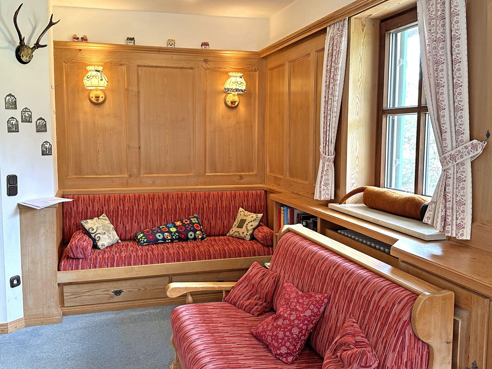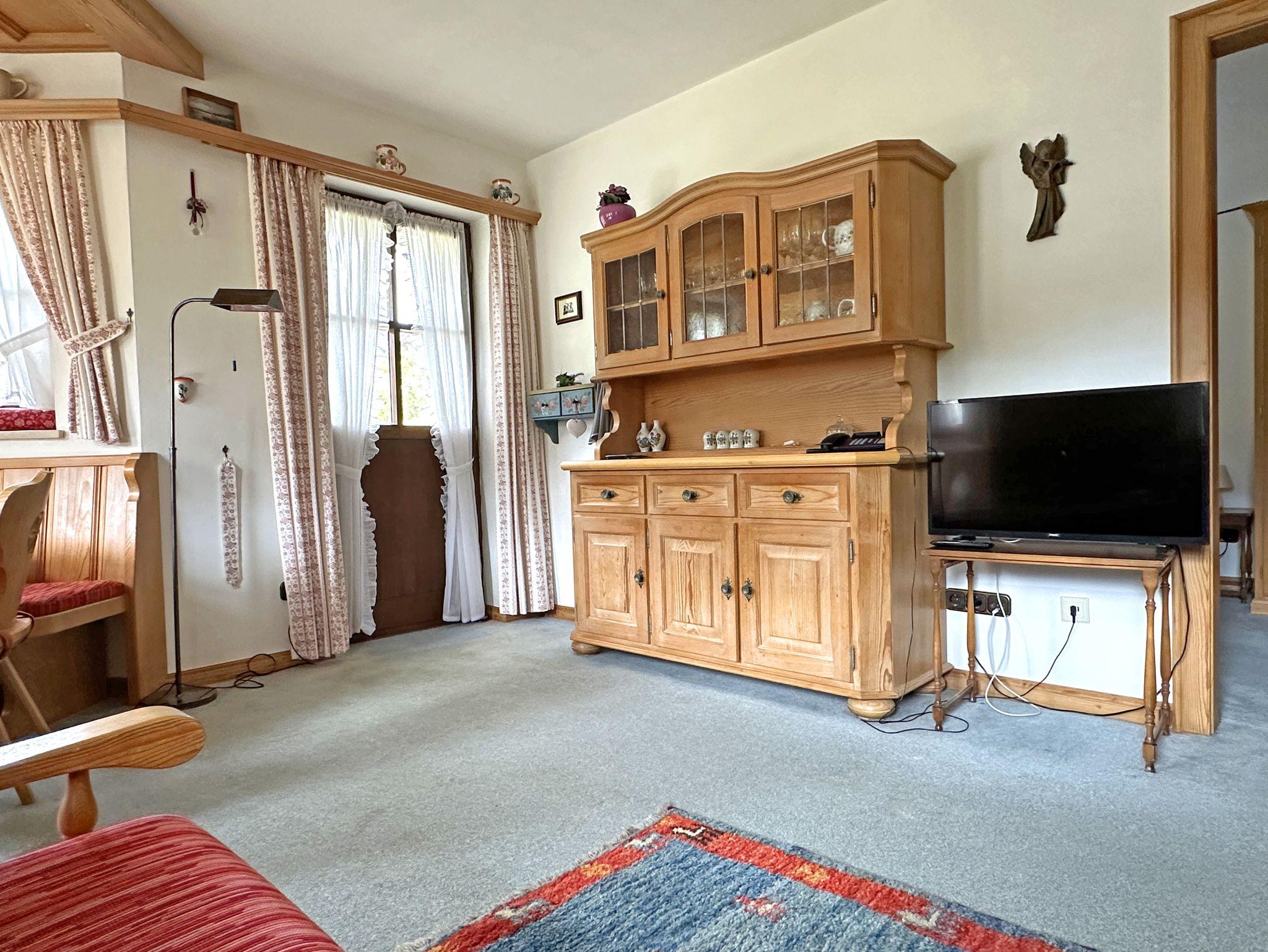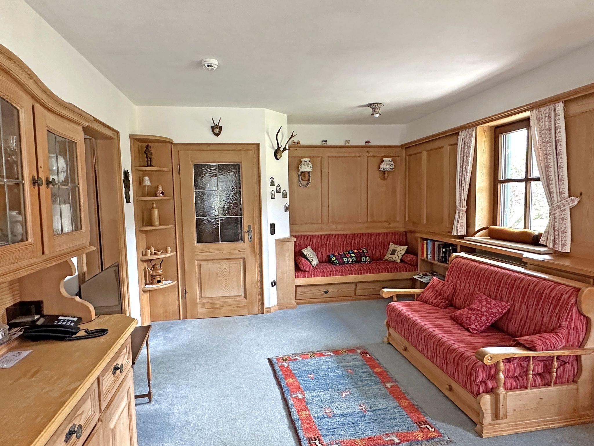 Der Wohn-/Schlafraum ist alpenländisch eingerichtet und lädt mit einer gemütlichen Essecke im Erker, einem Sofa sowie einer ausziehbaren Schlafcouch (1,40?×?2?m) zum Verweilen ein. Flat-SAT-TV, kostenloses WLAN und ein Telefon stehen Ihnen ebenfalls zur Verfügung.