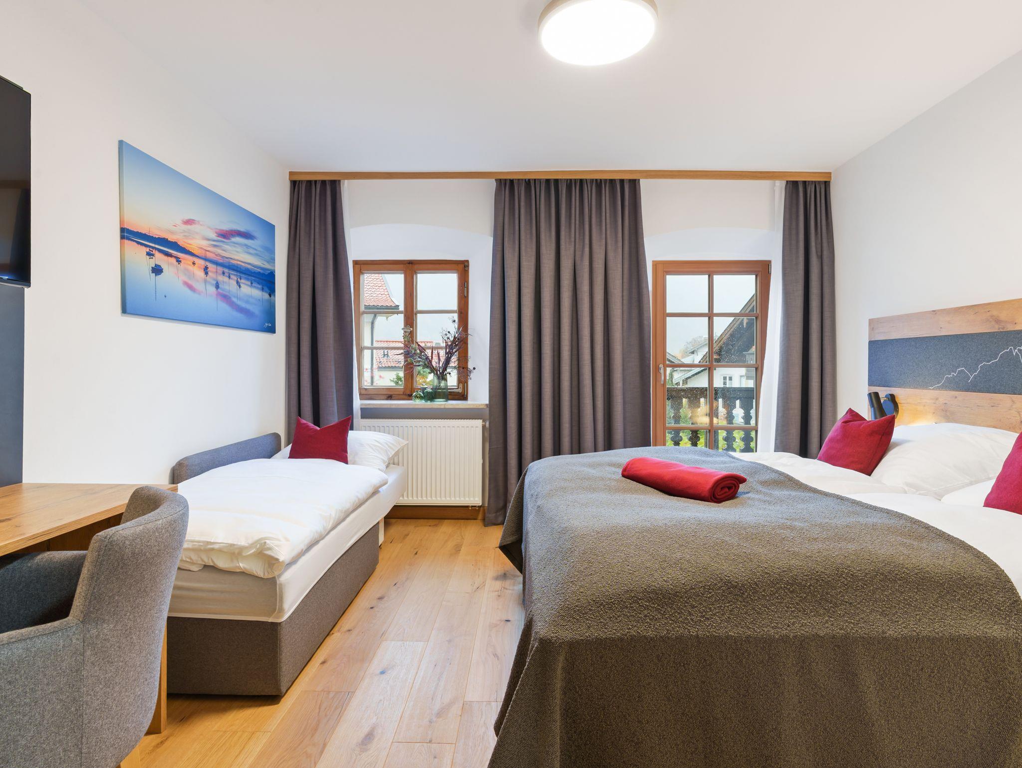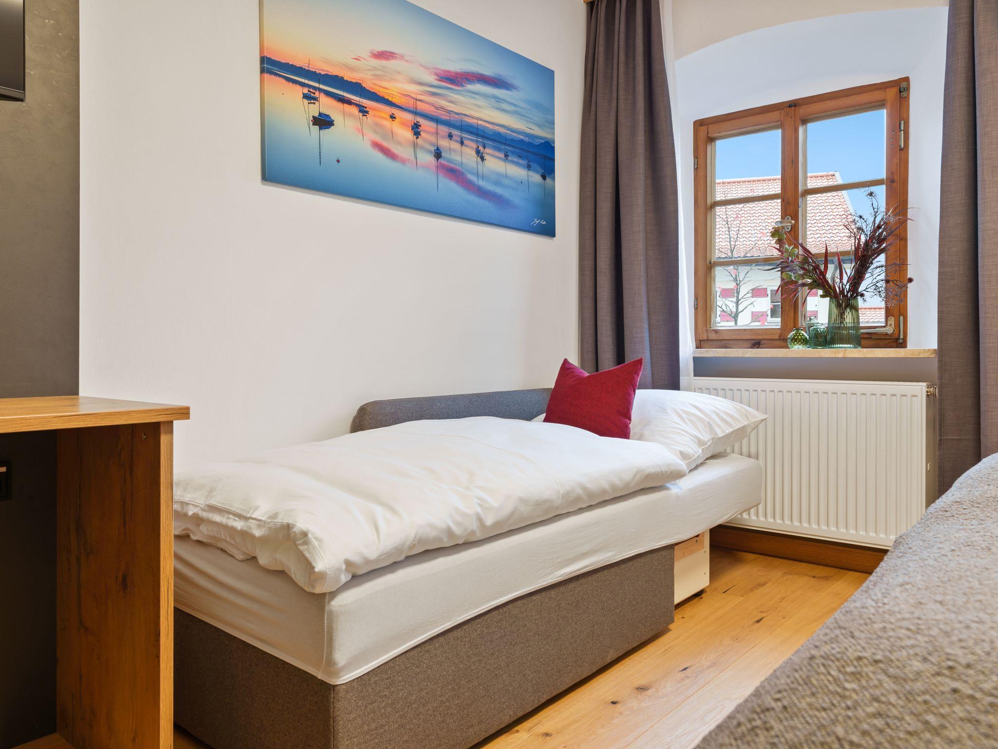 Ihr Wohlfühlzimmer am Kirchberg. Genießen Sie erholsame Urlaubstage in unserem frisch renovierten Doppelzimmer bis zu 3 Personen im 1. Obergeschoss. Das komfortable Boxspringbett (180 x 200 cm) sorgt für traumhaften Schlaf, während die hochwertige, ausklappbare Schlafcouch (80 x 200 cm) eine gemütliche Zusatzschlafmöglichkeit für eine Person bietet.