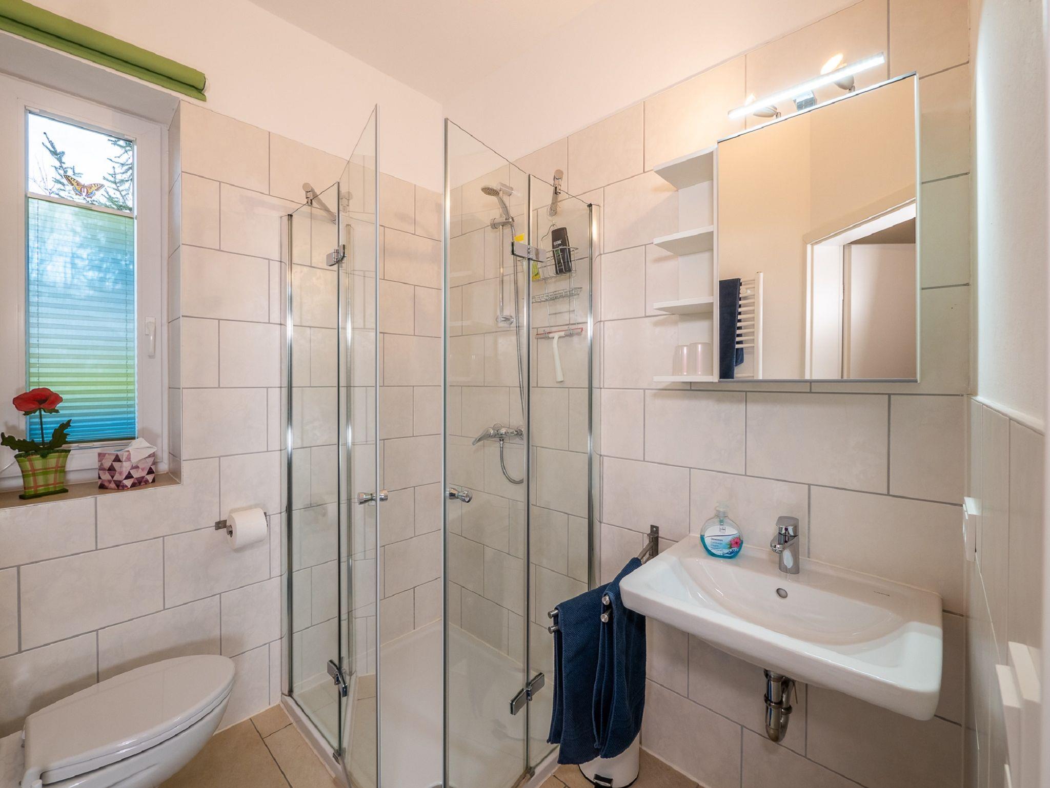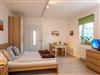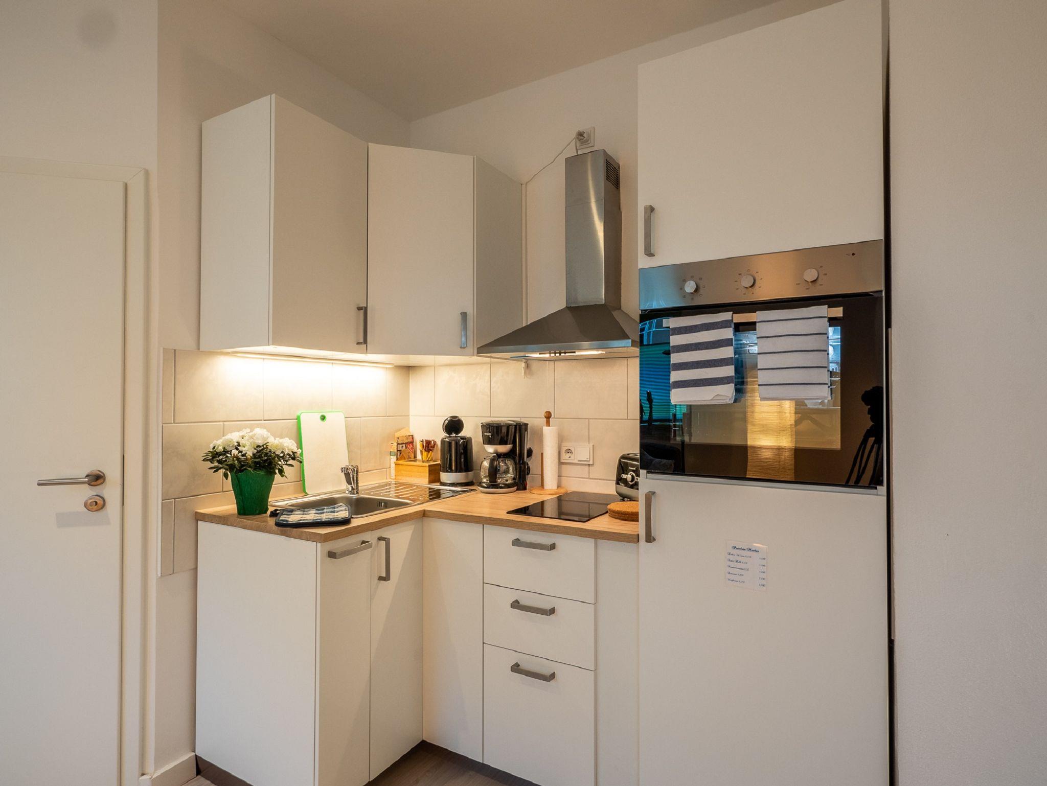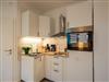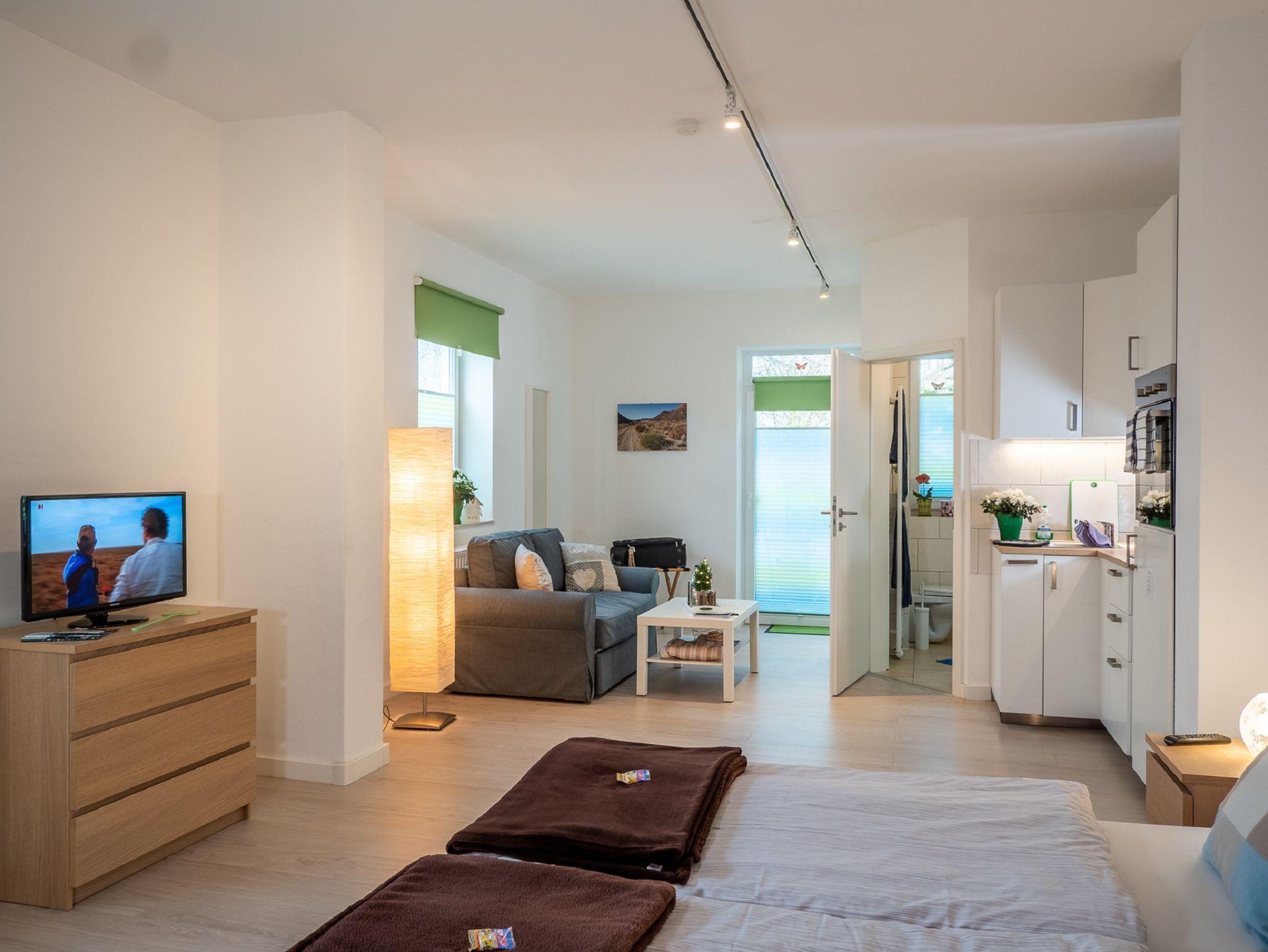 Das Wohnzimmer ist gleichzeitig Schlafzimmer mit einem Doppelbett und einem Schlafsofa (Aufbettung für 1-2 Personen möglich). Außerdem ist eine moderne Küchenzeile mit Backofen, Mikrowelle, Kaffeemaschine, Toaster, Wasserkocher und Kühlschrank und eine gemütliche Essecke vorhanden. Zusätzliche Sitzmöglichkeiten bietet das bequeme Sofa neben dem Fenster. Zur Zimmerausstattung gehören außerdem ein Fernseher und kostenloses Wlan. Das Badezimmer ist mit Dusche, WC und Föhn ausgestattet. Das Apartment befindet sich im Erdgeschoss und verfügt über eine Terrasse mit Tisch und Stühlen und Zugang zur großzügigen Gartenanlage.