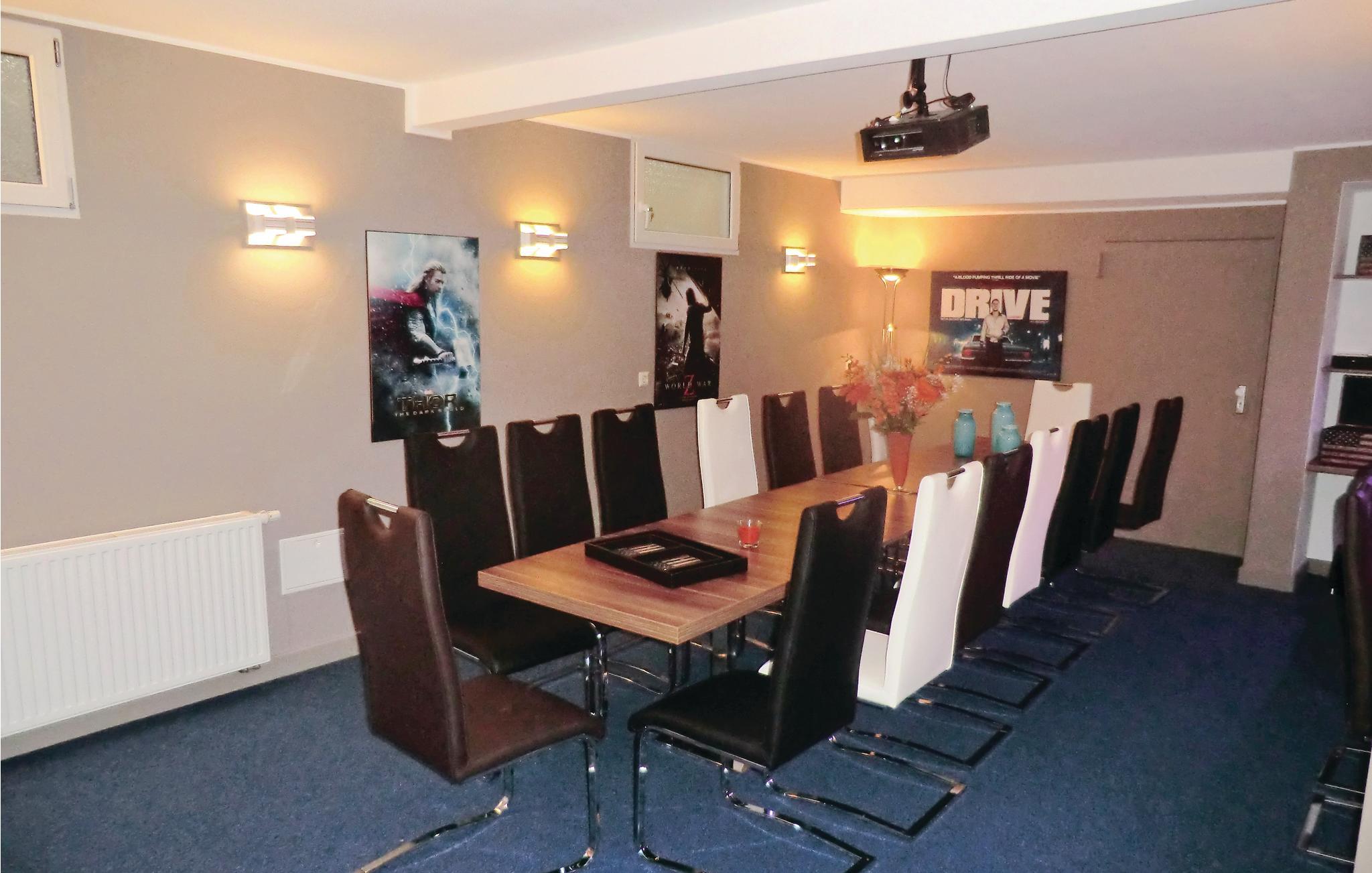 Her er god plads til store familiefester, professionelle møder og workshops samt ferie for en stor gruppe venner. Alt efter ønske, sørger I selv for forplejning eller kan bestille forplejning på forespørgsel (mod betaling). Soveværelserne ligger alle på første og anden sal, er individuelt indrettet og har badeværelse en suite. I stueetagen er der hyggelige sofa- og siddehjørner, bar, morgenmadslokale, køkken, bibliotek – samt et aktivitetsrum for store og små, bl.a. med billard og dart. Her kan I også sidde med en stor gruppe venner og bare nyde at dagen bliver til aften med snak og et godt glas øl. Herfra er der udgang til en terrasse. En trappe ned, i souterrain, er der et mødeværelse med lærred og teknik, et ekstra køkken og et hyggeligt siddehjørne – samt direkte udgang til haven. I feriehuset er der en elektrisk kamin som er dejlig at tænde op i på en kølig aften. I dette moderne og hyggeligt indrettede feriehus er der oplagt at fejre familiefesten eller tage på tur med en gruppe venner eller en sportsklub.