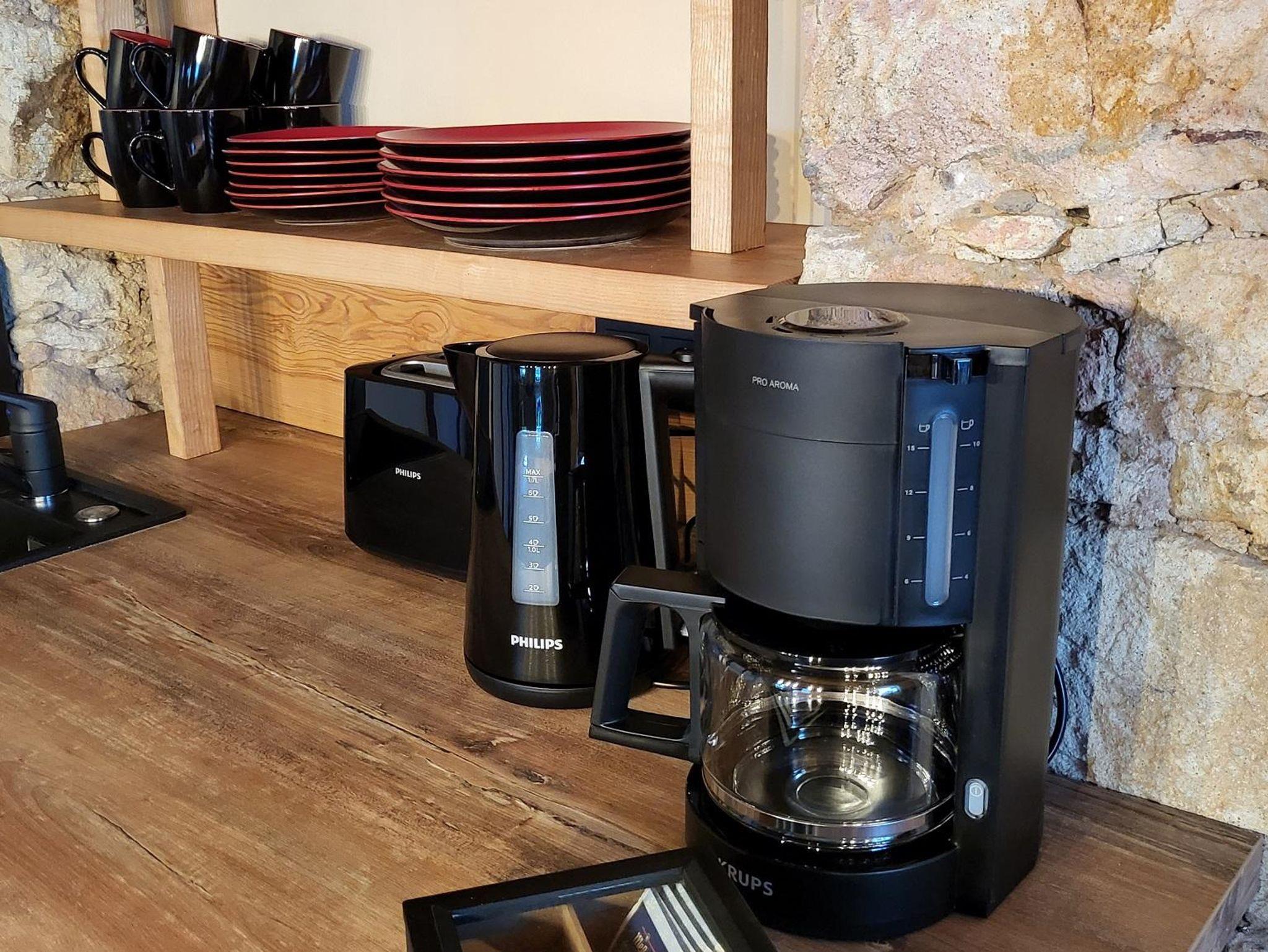 In der Küche finden Sie einen Kühlschrank mit Gefrierfach, einen Backofen mit Kochfeld, Kaffeemaschine und Toaster.