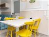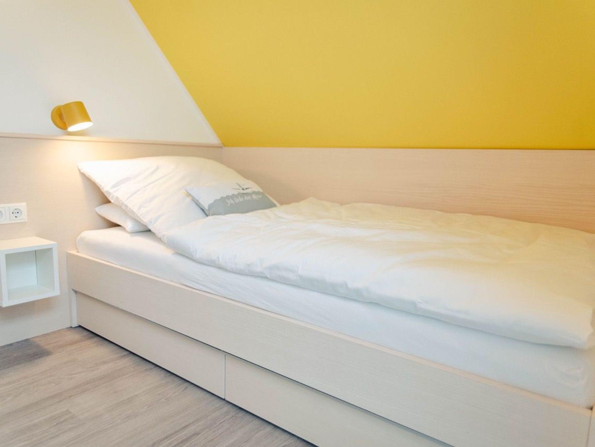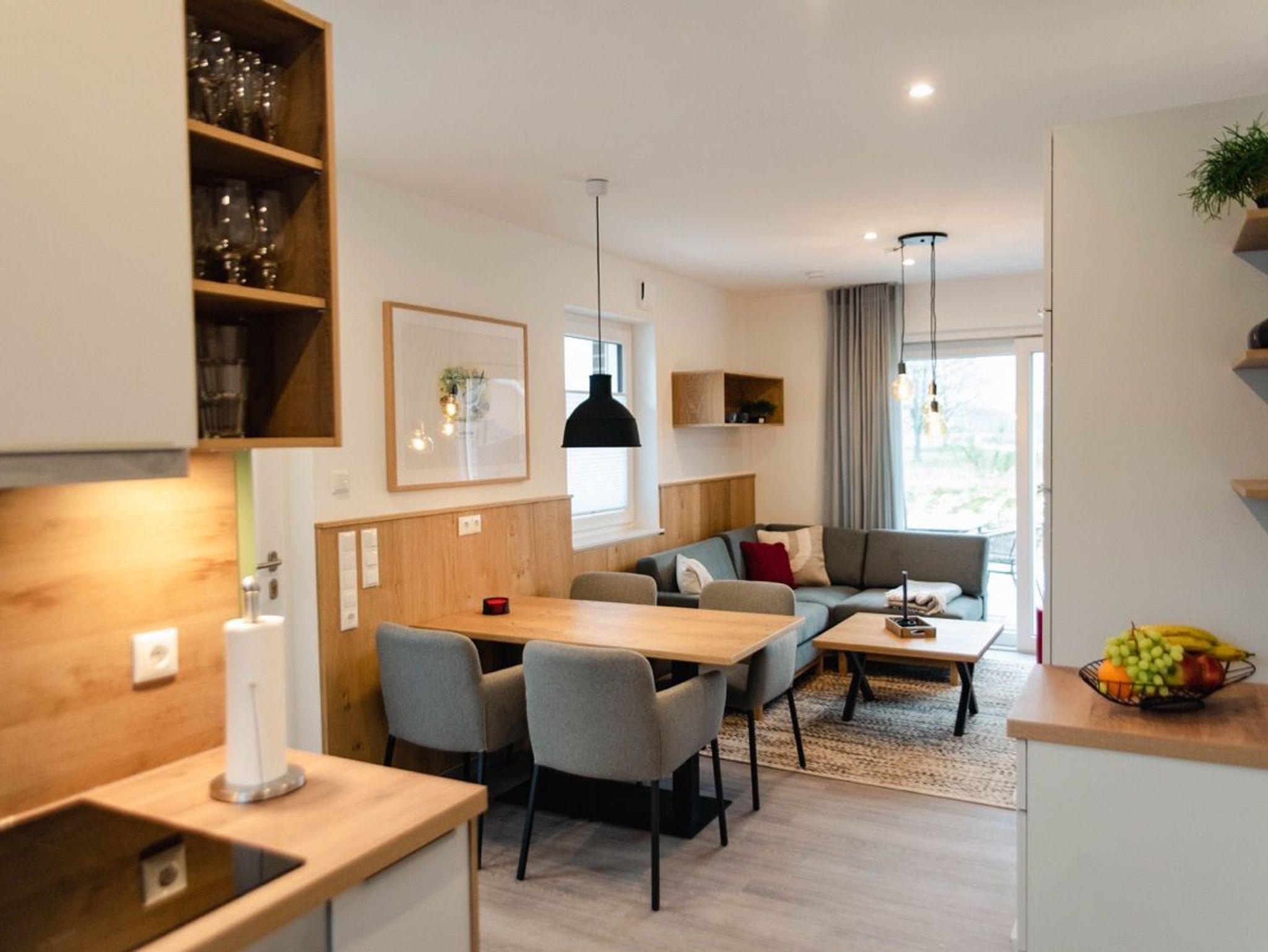 Die modern eingerichteten Doppelhaushälften für bis zu vier Personen erstrecken sich über zwei Ebenen. Ein offener Koch-/Wohn- und Essbereich mit Anschluss an die Terrasse sowie ein Gäste WC und ein praktischer Abstellraum befinden sich im Erdgeschoss. Das Dachgeschoss bietet zwei gemütliche Schlafzimmer und ein Bad mit WC, Dusche und zwei Waschbecken.