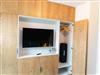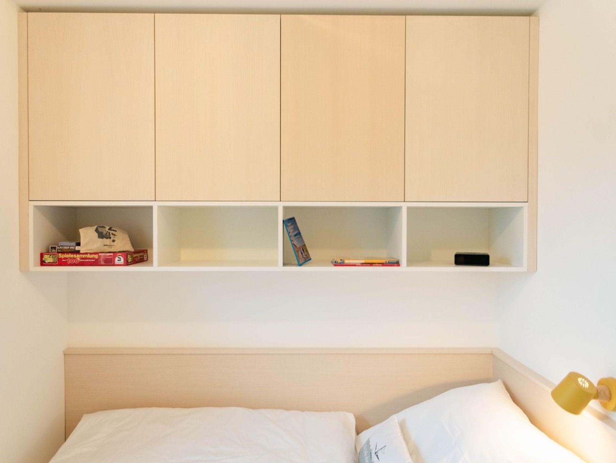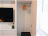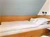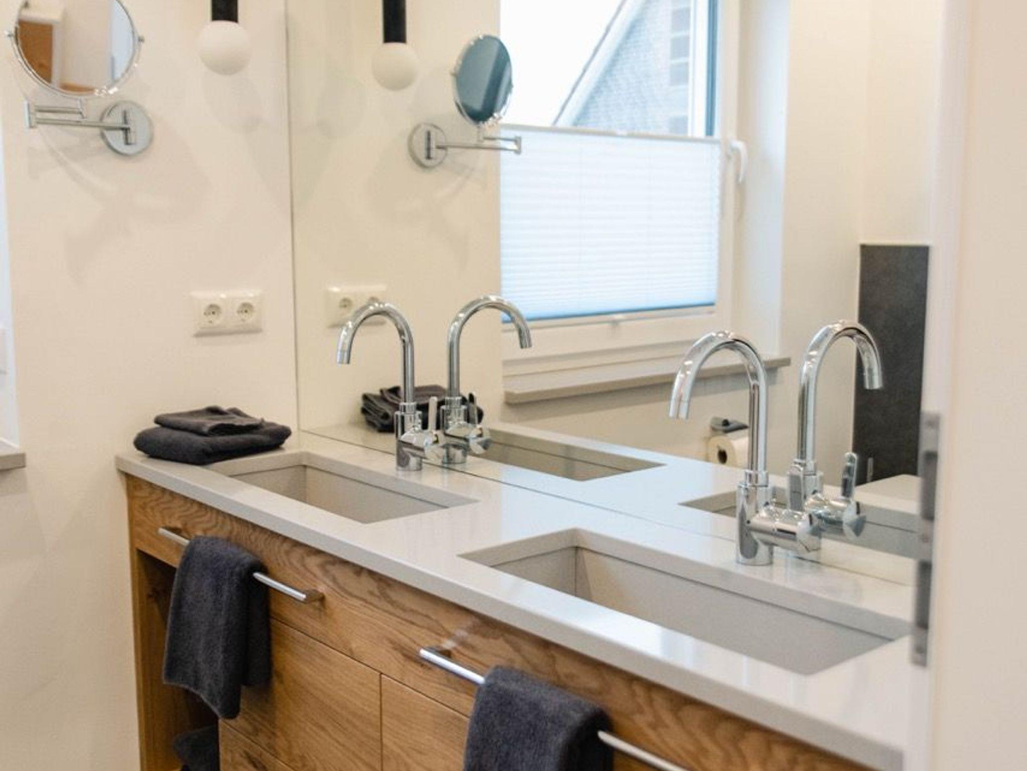 Im Obergeschoss befindet sich ein Schlafzimmer mit Doppelbett sowie ein Kinderzimmer mit zwei Einzelbetten und das Badezimmer mit ebenerdiger Dusche und zwei Waschbecken.
