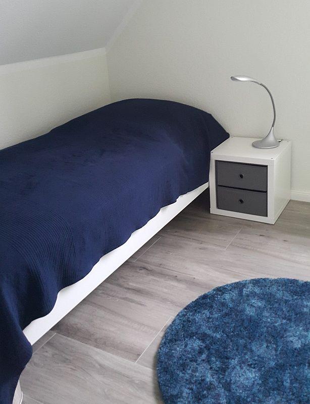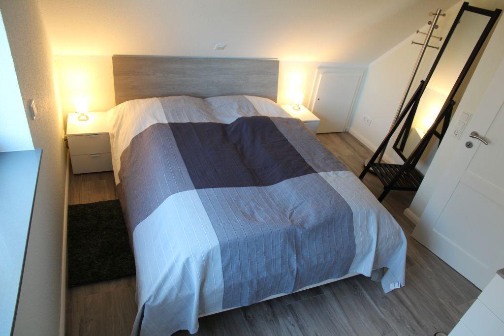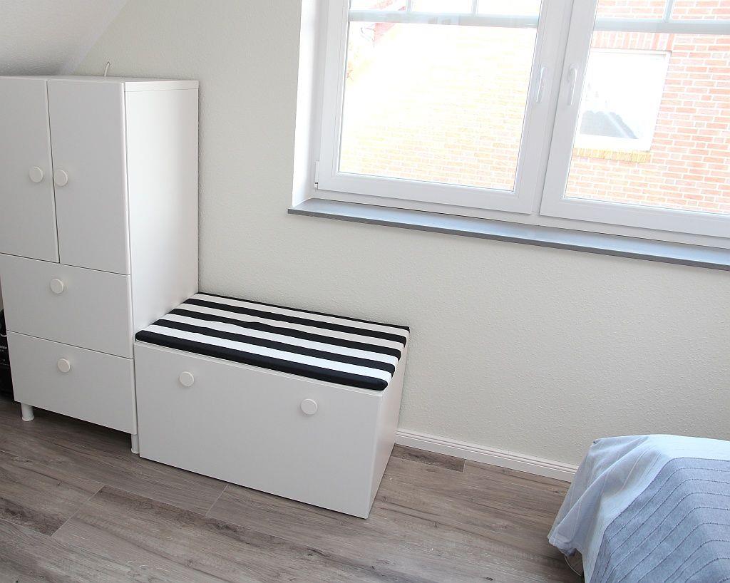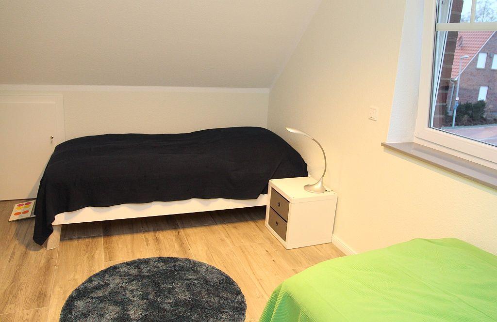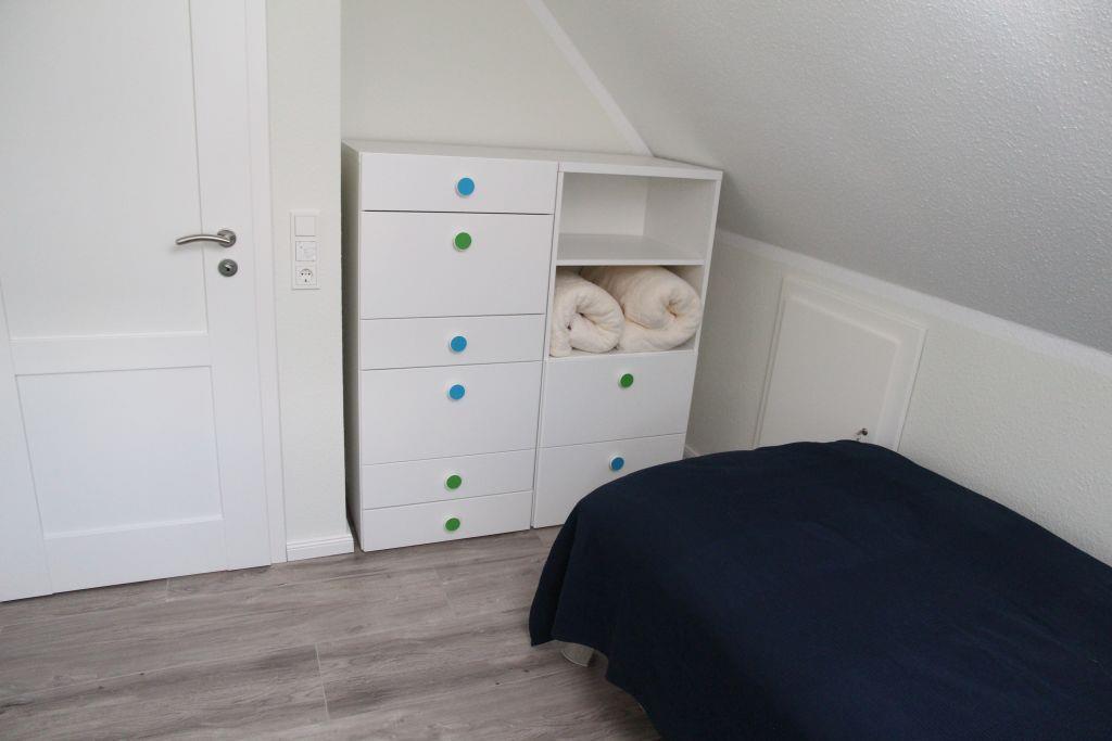 2 Schlafzimmer im OG: Eines ist mit Doppelbett, Kleiderschrank und Flach-Sat-TV und das andere mit zwei Einzelbetten und einer Kommode. Im Kinderzimmer befinden sich noch verschiedene Gesellschaftsspiele. Beide Schlafzimmer können mit elektrischen Außenjalousien abgedunkelt werden.