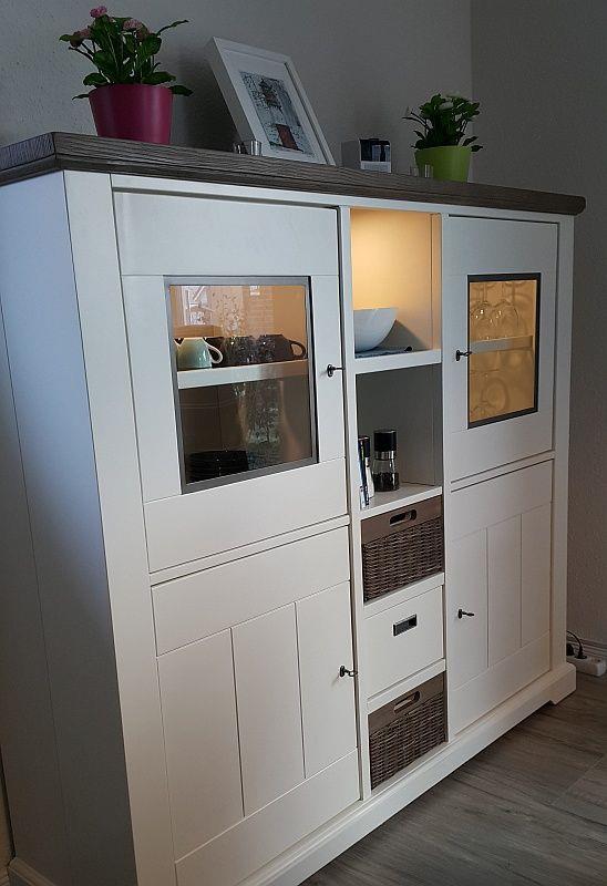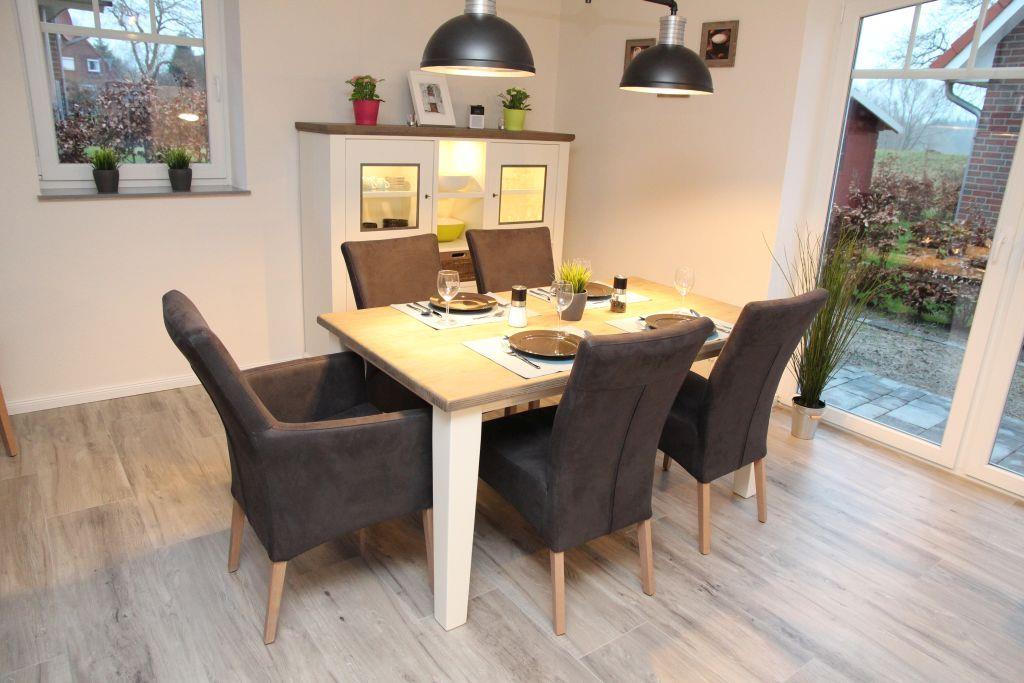 Wohn-/Esszimmer: Ecksofa mit Tisch, Esstisch für bis zu 6 Personen, Sideboard, Flach-Sat-TV.