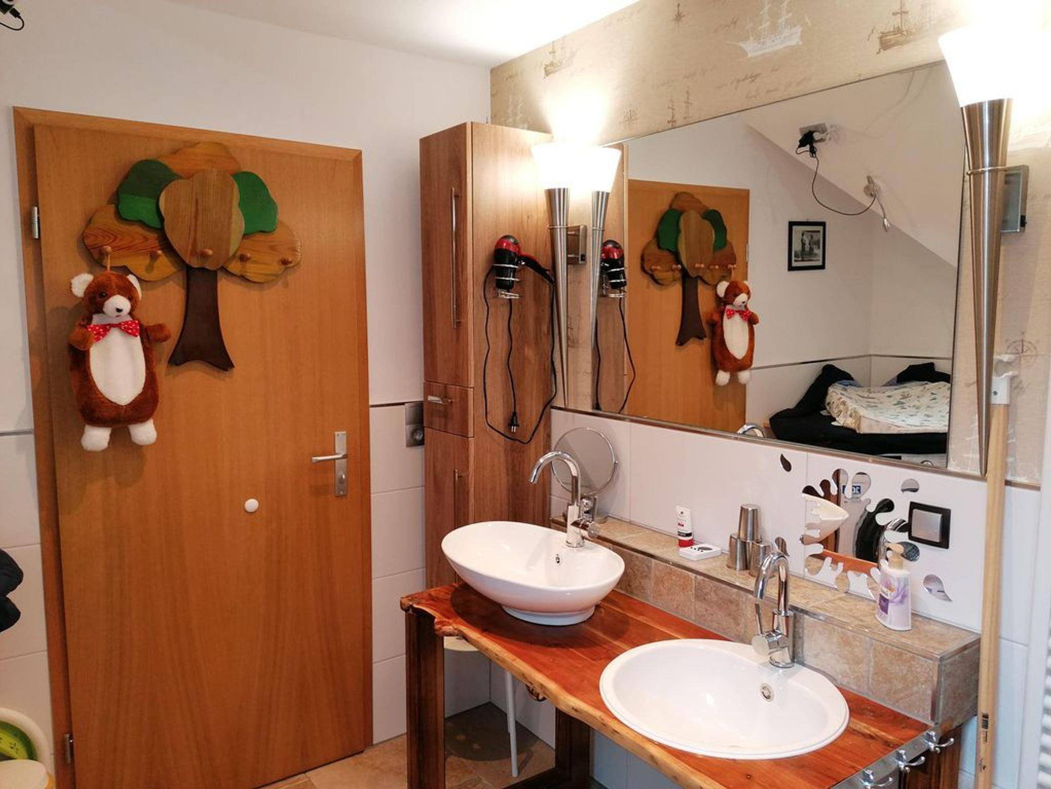 Gegenüber vom Einzelzimmer befindet sich das moderne Bad. In dem Bad sind zwei Waschbecken, eine große Dusche und das WC vorhanden. Hinter der Tür wartet eine Waschmaschine auf ihren Einsatz. Auf der Waschmaschine steht ein stabiler, großzügiger Wickeltisch. Eine Babybadewanne kann für die Jüngsten zum Badespaß genutzt werden. Zudem steht ein Wäschesammler für Sie bereit.