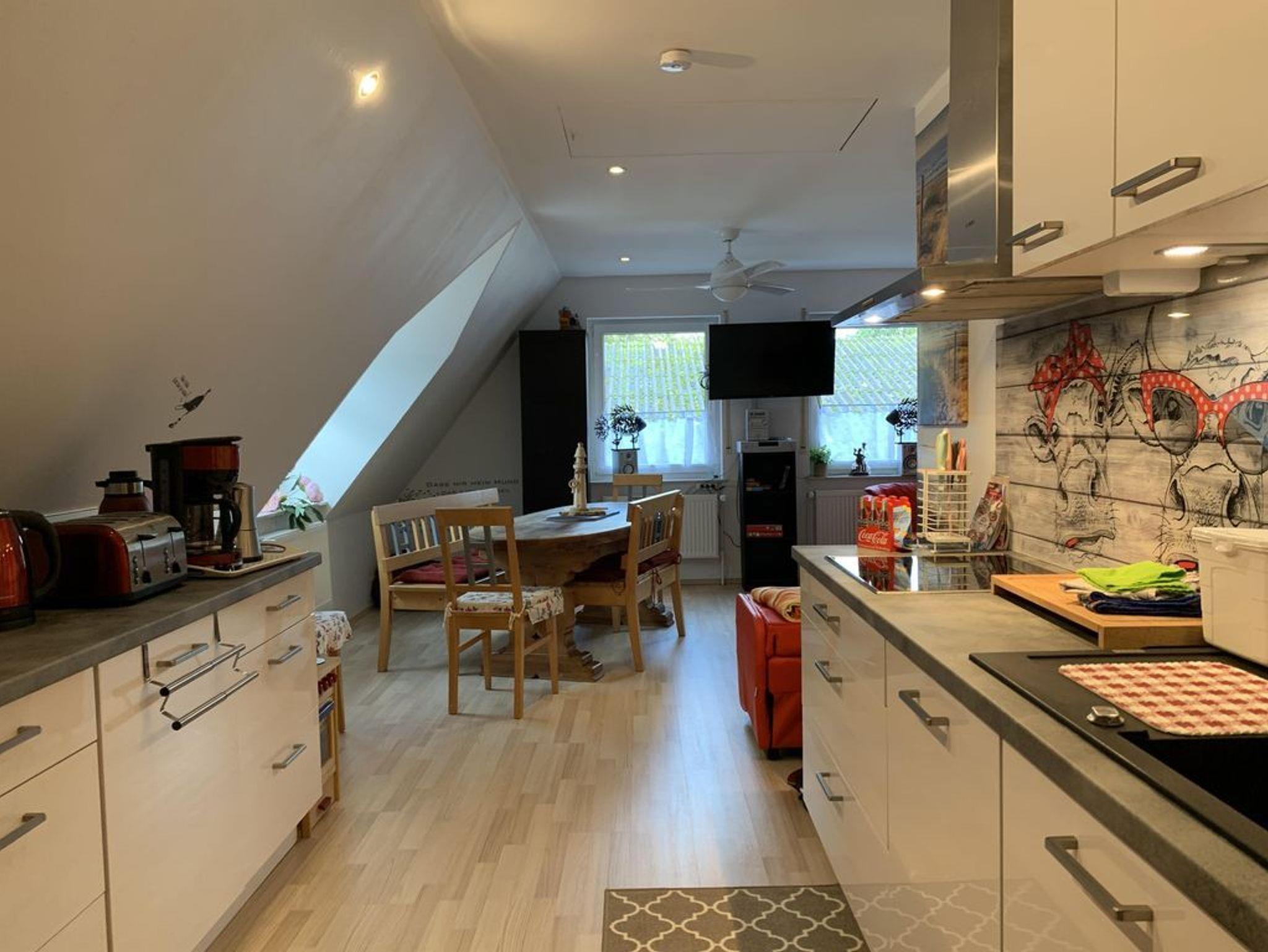 Gegenüber von dem gelben Zimmer befindet sich die vollausgestattete Küche. Die Küche verfügt über ausreichend Schränke, einem Kühl- und Gefrierschrank, einer Mikrowelle und einem Geschirrspüler, einem Backofen und Herd mit Induktions-Ceranfeld. Außerdem gibt es eine Filter-Kaffeemaschine, einen elektrischen Espressokocher, einen Wasserkocher und elektrischen Mixer. Auch für Töpfe, Pfannen, Backformen, Geschirr und Besteck ist gesorgt. Sie können sich somit beim Kochen und Backen austoben. Ein großer massiver Eichenesstisch mit Bänken und Stühlen, sowie Kinderhochstühlen (bis zu 3) laden zum gemeinsamen Zusammensitzen und Essen ein. Für die Babyfläschchen gibt es ein Sterilierset .