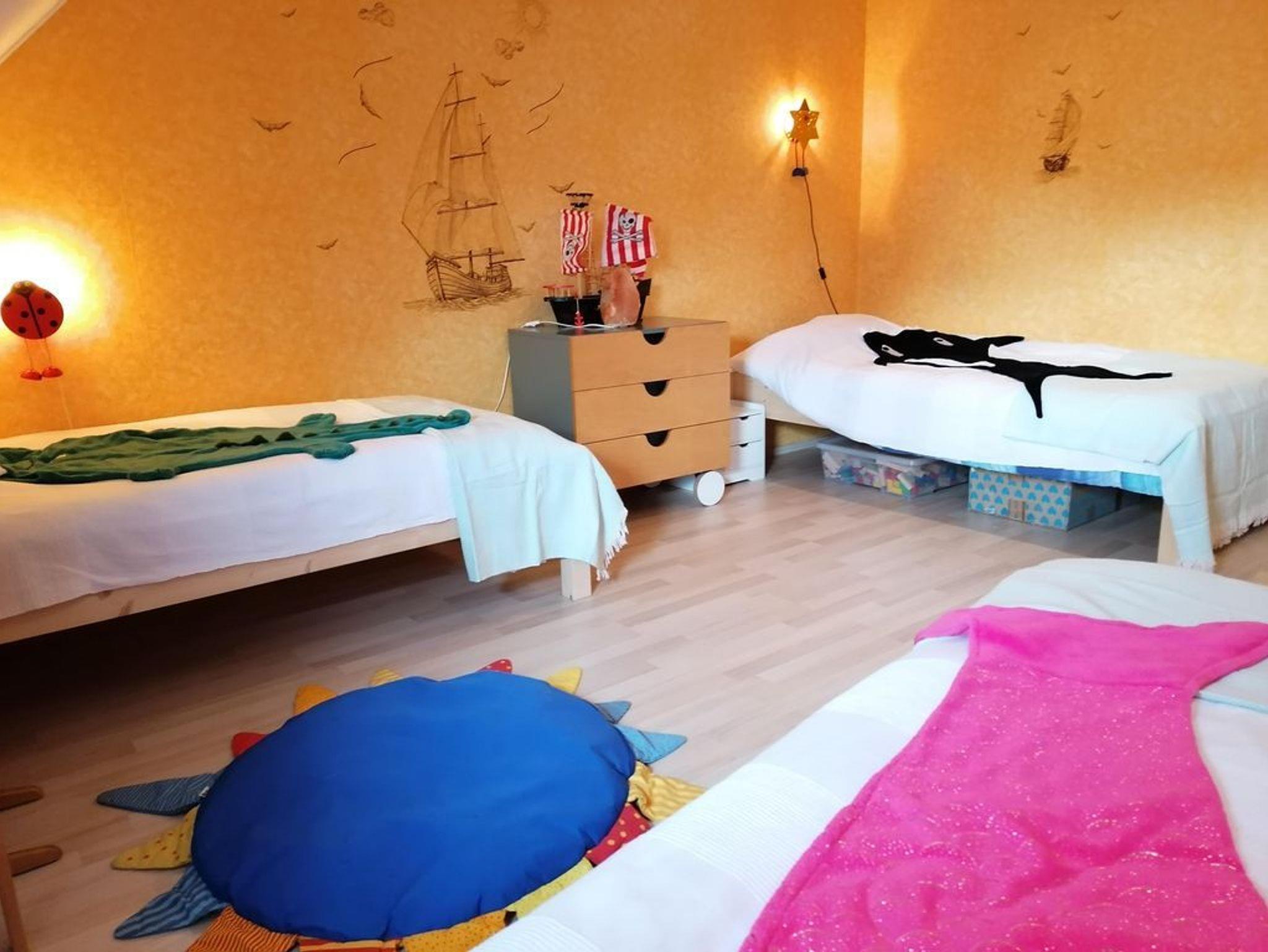 Ein großes Zimmer - das gelbe Zimmer - bietet genug Platz für die drei Einzelbetten (2 Betten können zu einem Ehebett zusammen gestelle werden) einen Kleiderschrank und eine Kommode.