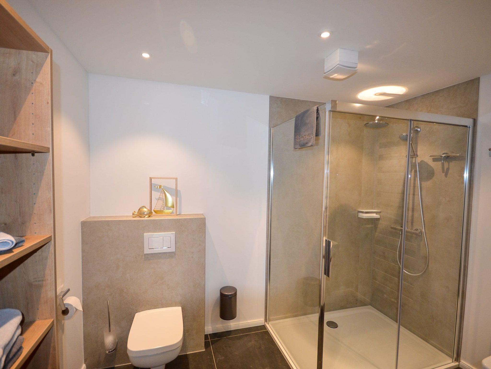 Das Bad hat eine ebenerdige, verglaste Dusche (140 x 100 cm) mit Regendusche und Handbrause, einen Waschtisch, einen Handtuchheizkörper und ein WC sowie ausreichende Ablageflächen und ein Einbauradio.