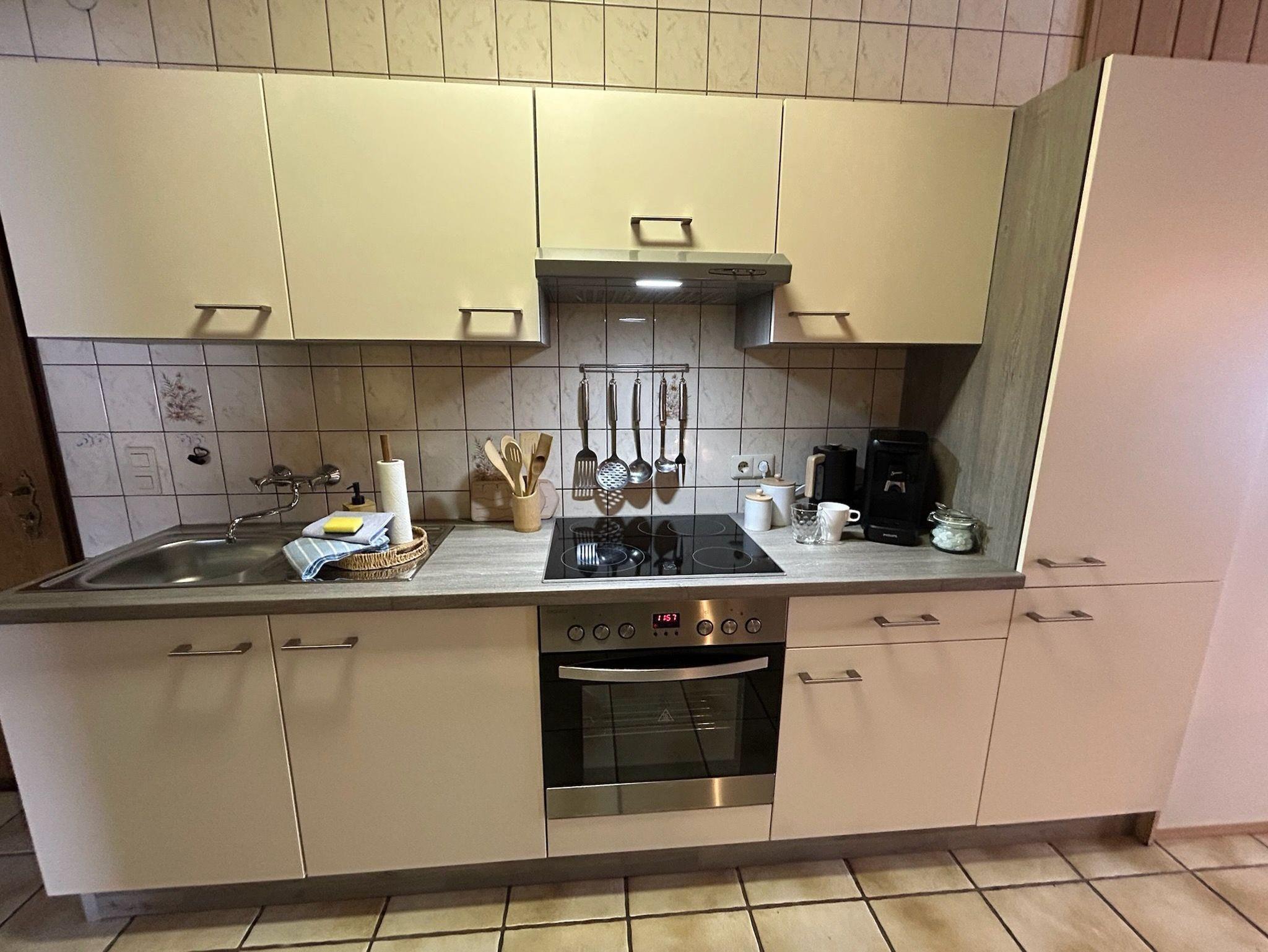 Helle, gemütliche Ferienwohnung für 2 - 4 Personen (1 Schlafraum mit Doppel- und Etagenbett), modernem Bad und einem freundlichen Wohn-Essbereich. Die gut ausgestattete Küche bietet zwei Kochplatten, einen kleinen Backofen, eine Senseo-Kaffeemaschine und einen Kühlschrank mit Gefrierfach. Eine eigene Terrasse lädt zum Entspannen ein - ideal für Paare, Familien und alle, die eine komfortable Unterkunft mit Wohlfühlatmosphäre suchen.