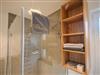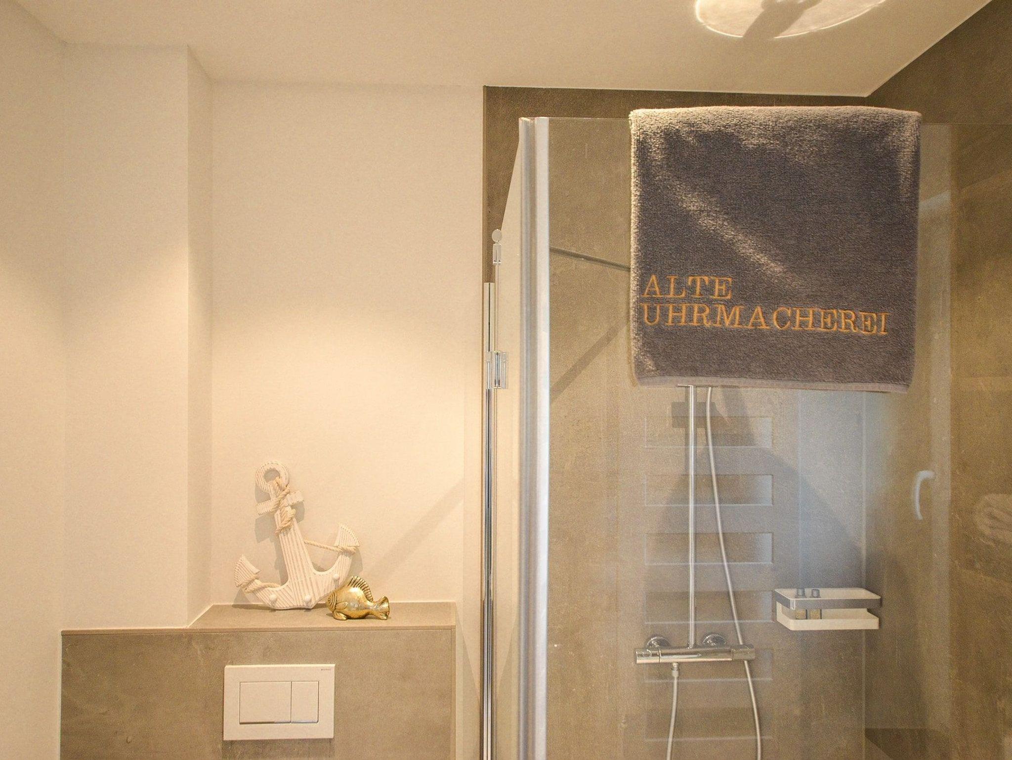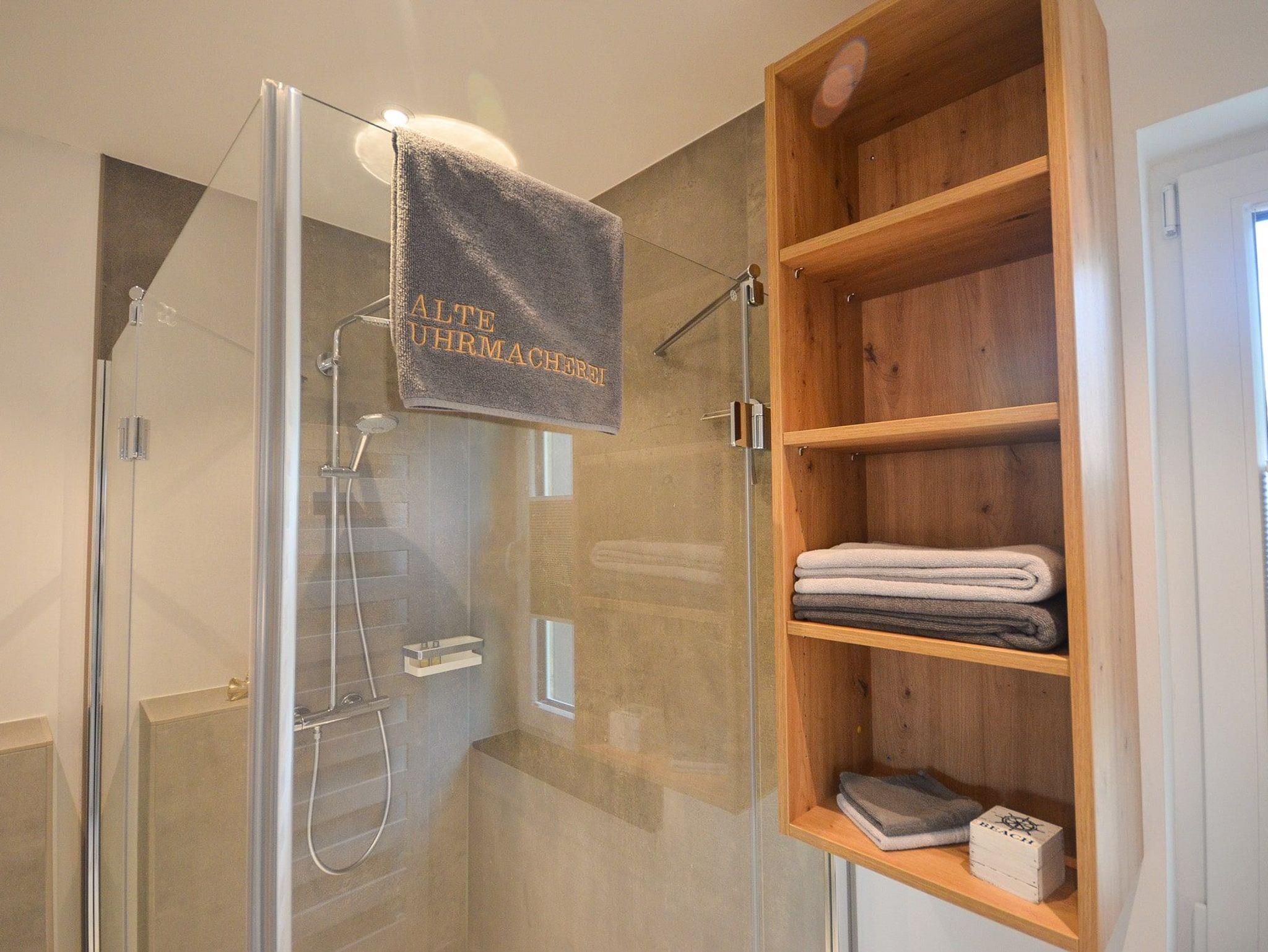 Das Tageslichtbad hat eine bodentiefe, verglaste Dusche mit Regenduschkopf und Handbrause, einen Waschtisch, einen Handtuchheizkörper und ein WC, sowie ausreichende Ablageflächen und ein Einbauradio.