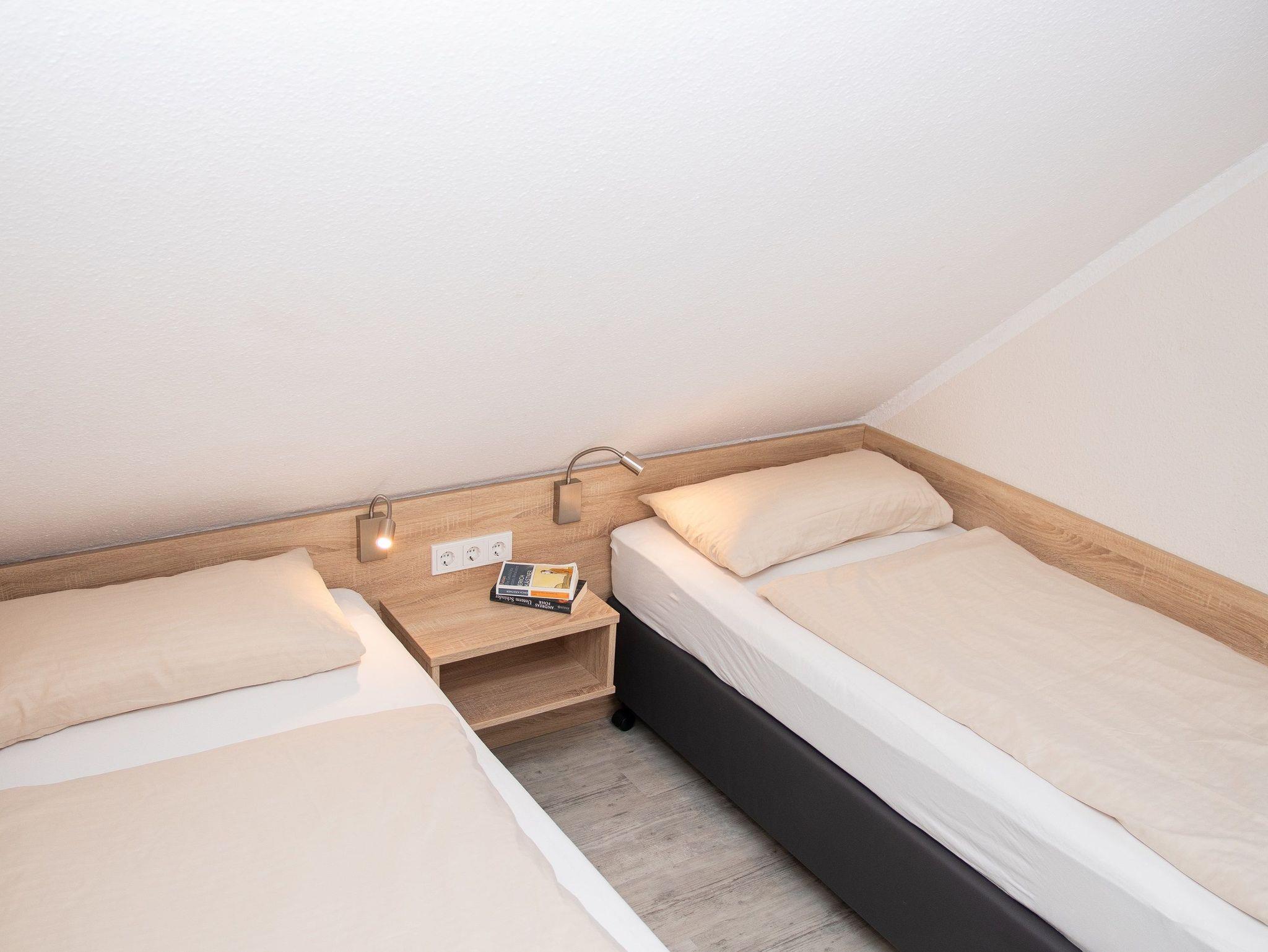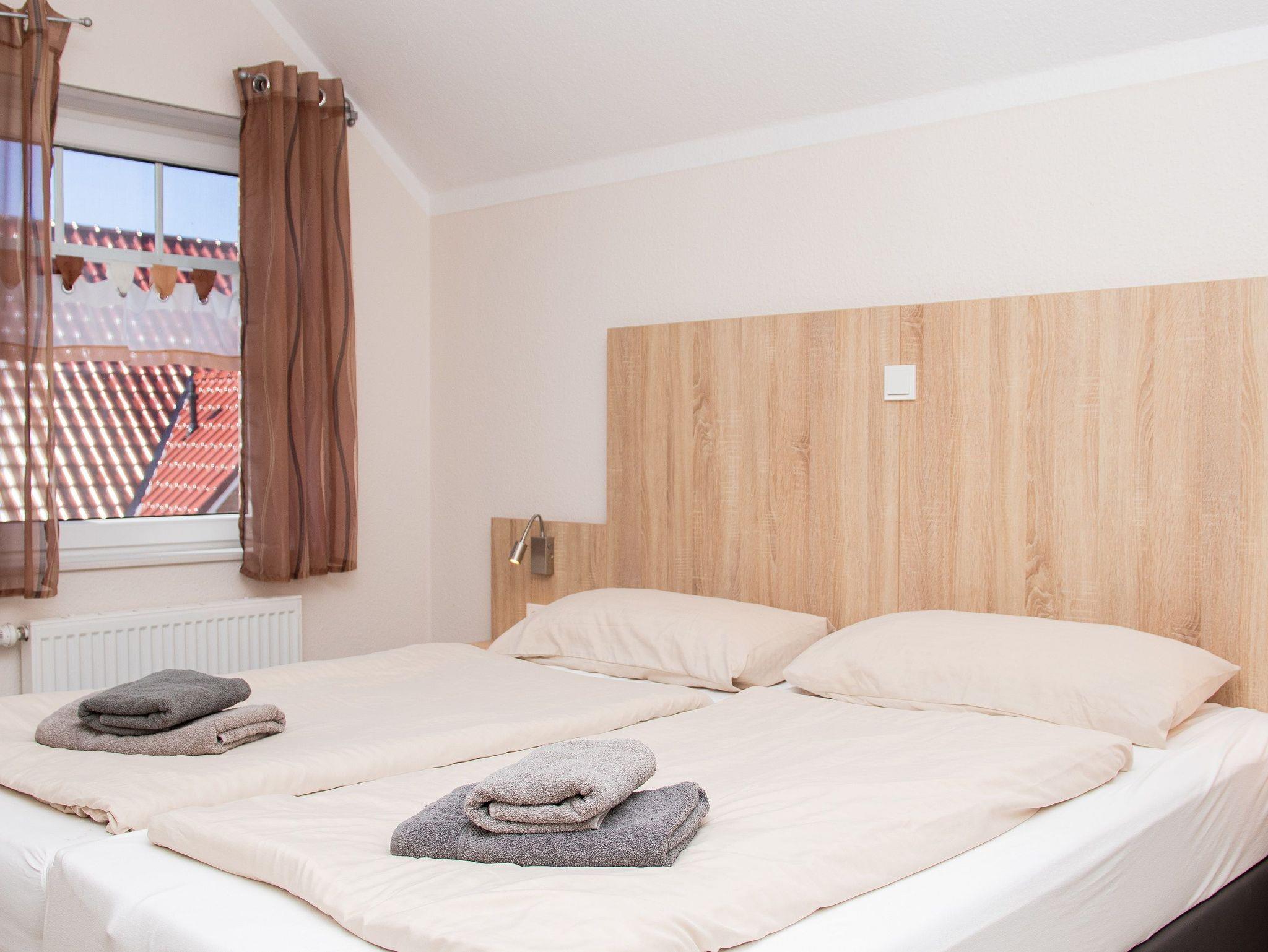 Zwei mit 4 Sternen des Deutschen Tourismusverbandes ausgezeichnete Doppelhaushälften für je 4 Personen, mit einer Wohnfläche von ca. 60 qm. Das ansprechend eingerichtete Wohnzimmer sowie die voll ausgestattete Küche befinden sich im Erdgeschoss. Von den zwei barrierefreien Bädern liegt das eine im Ober- und das andere im Untergeschoss. Die zwei Schlafzimmer (eines mit Doppelbett, das andere mit zwei getrennten Betten sind im Obergeschoss untergebracht. n Bad, Küche, Wohnzimmer und Flur ist Fußbodenerwärmung vorhanden. Alle Räumlichkeiten sind mit Raumbe- und entlüftung (ideal für Allergiker) sowie elektrischen Jalousien ausgestattet. Zur weiteren Ausstattung des Ferienhauses gehören Kaffeemaschine, Toaster, Wasserkocher, Eierkocher, Föhn, Geschirr, Geschirrspülmaschine, Waschmaschine, Trockner, Bügeleisen und Bügelbrett, Gartenmöbel und Grill, Internetzugang.