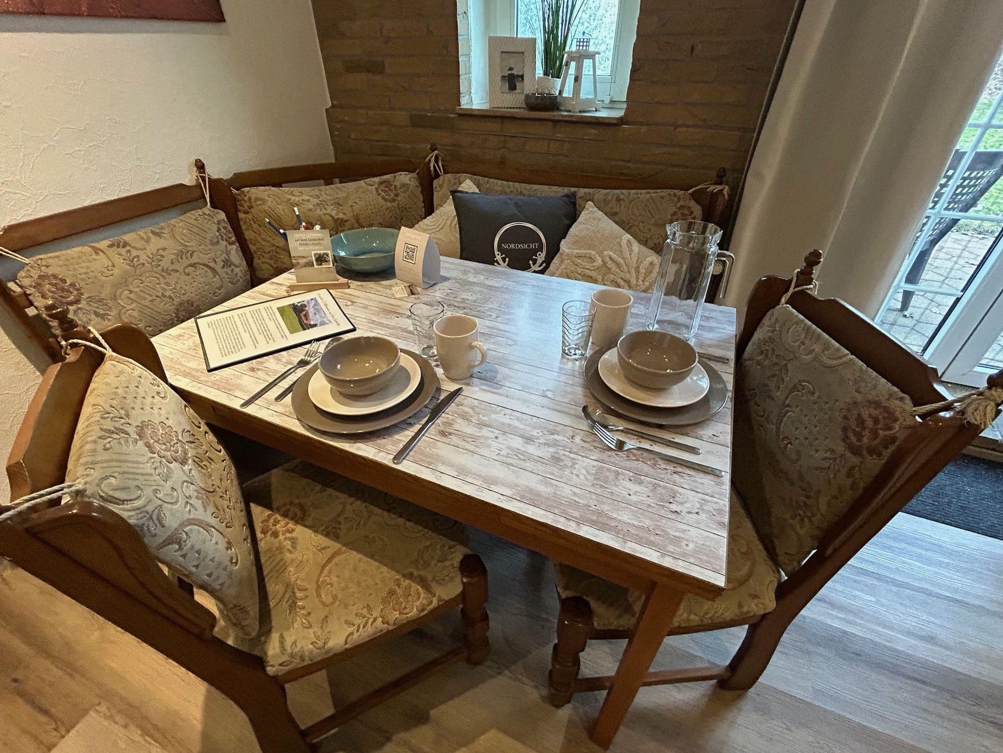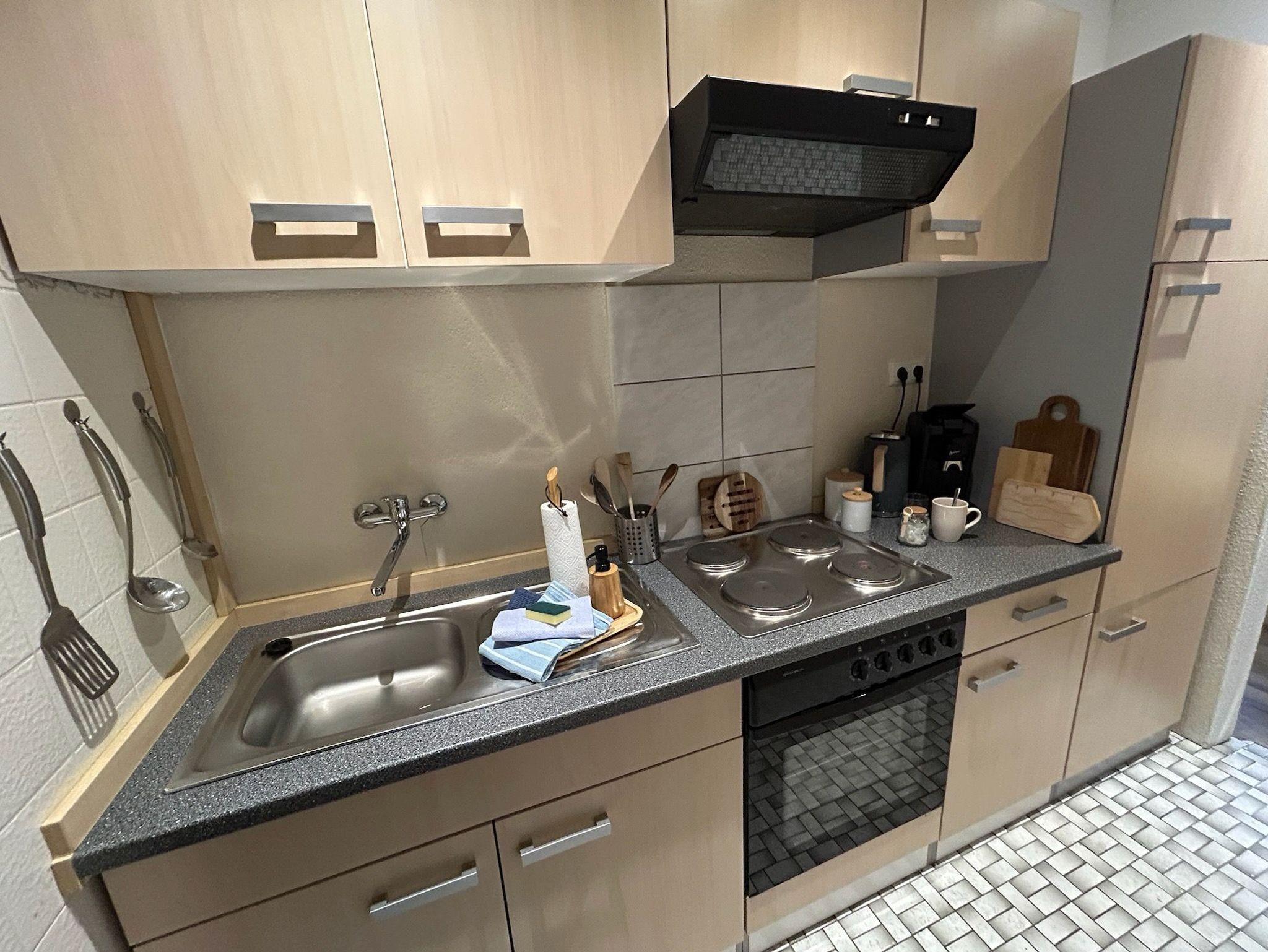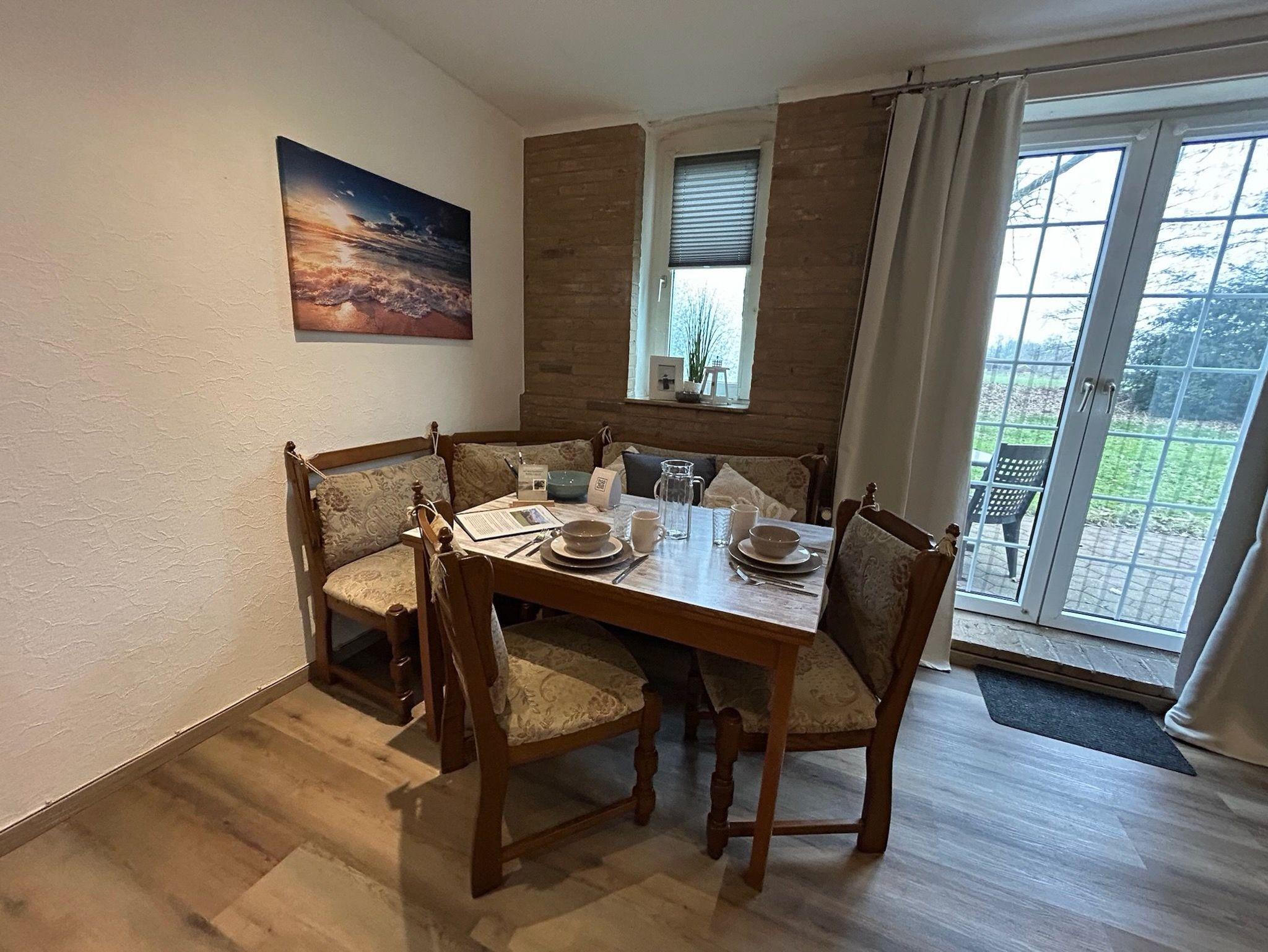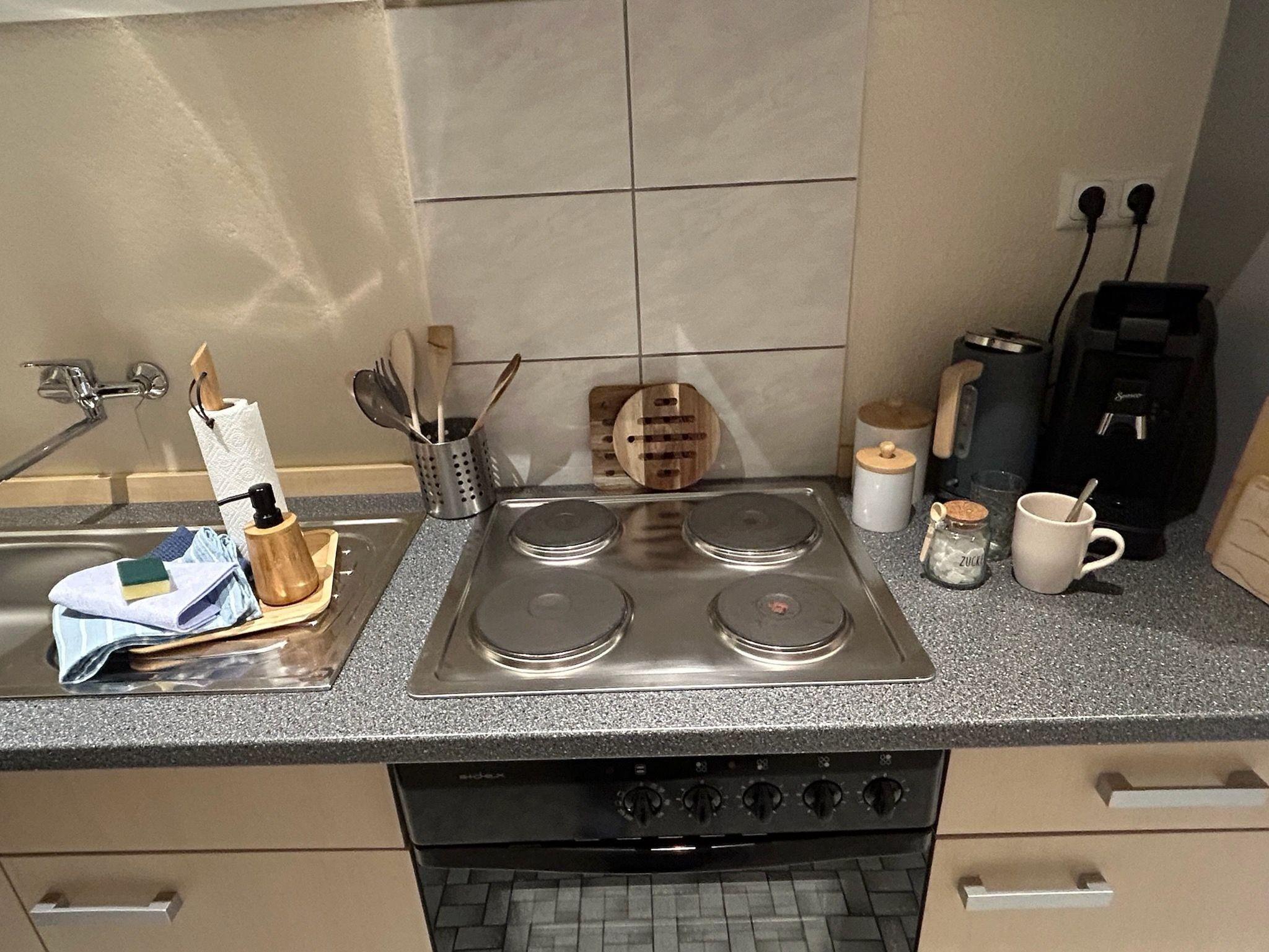 Helle, gemütliche Ferienwohnung für 2 - 4 Personen (1 Schlafraum mit Doppel- und Etagenbett), modernem Bad und einem freundlichen Wohn-Essbereich. Die gut ausgestattete Küche bietet zwei Kochplatten, einen kleinen Backofen, eine Senseo-Kaffeemaschine und einen Kühlschrank mit Gefrierfach. Eine eigene Terrasse lädt zum Entspannen ein - ideal für Paare, Familien und alle, die eine komfortable Unterkunft mit Wohlfühlatmosphäre suchen.