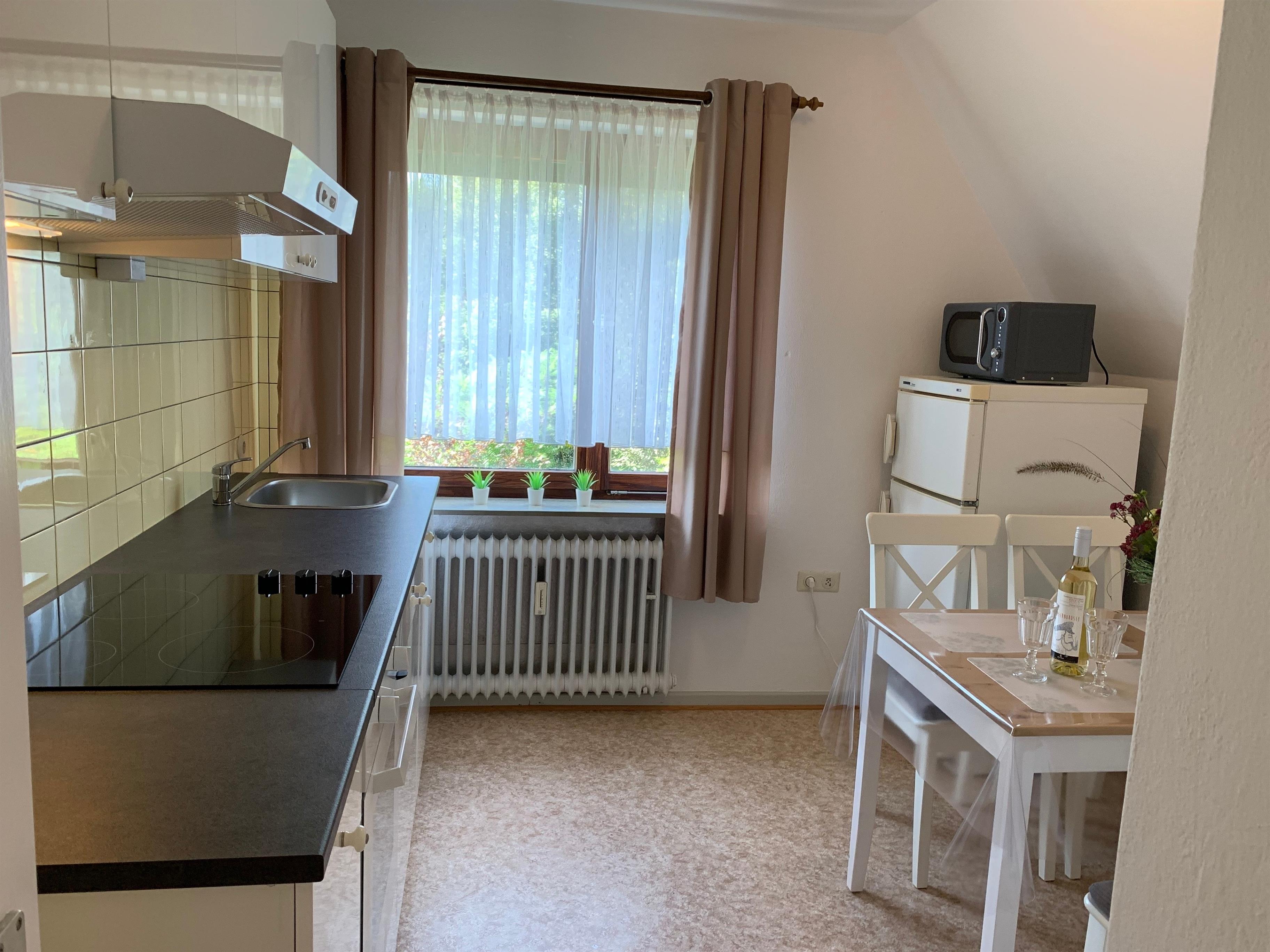 Küche: Vollständige Einrichtung mit Kühlschrank, Mikrowelle, kleiner Spülmaschine, Kaffeemaschine, etc..