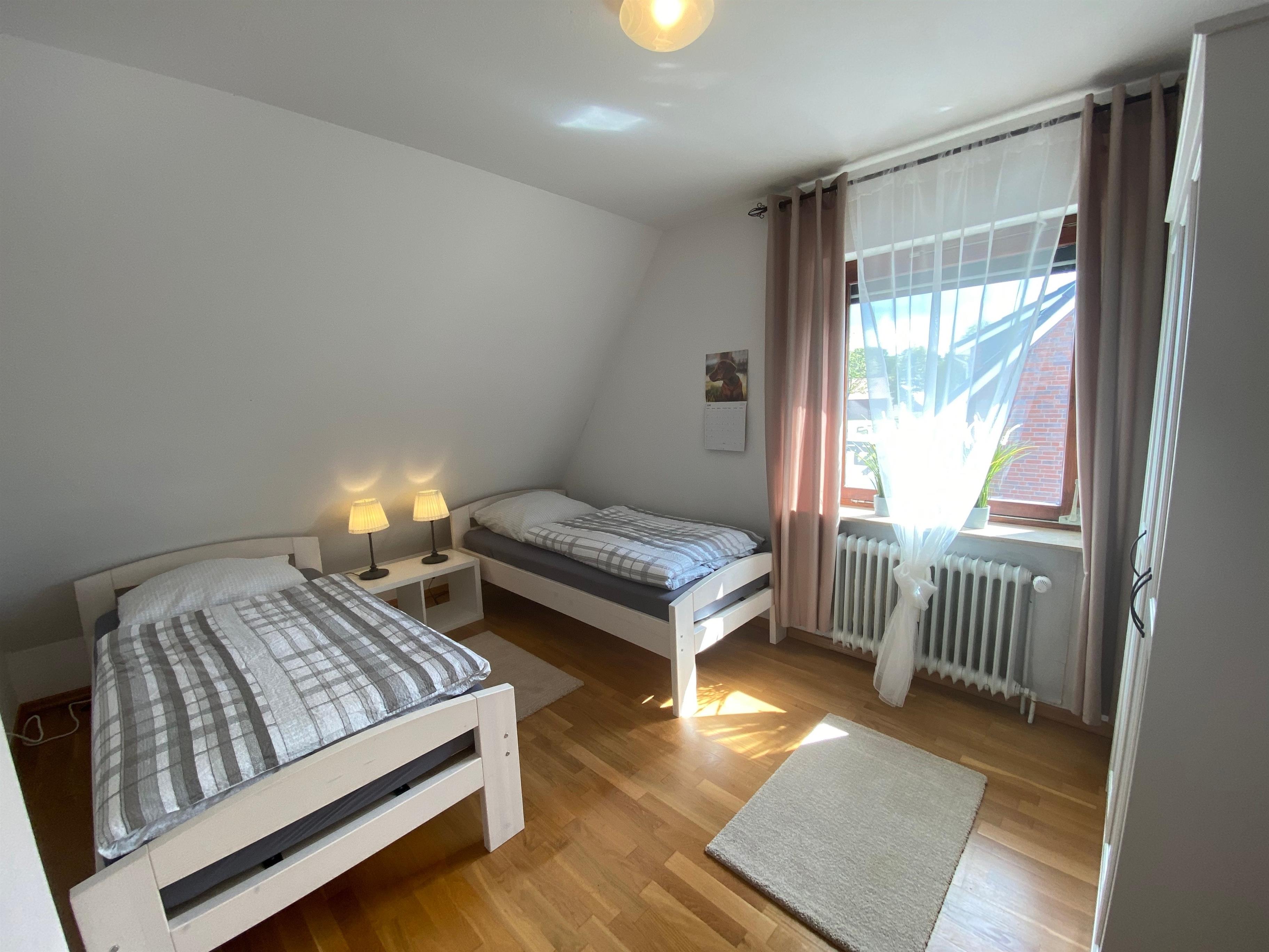 Schlafzimmer 2: zwei bequeme Einzelbetten, zwei Nachttische mit Leuchten und ein Kleiderschrank