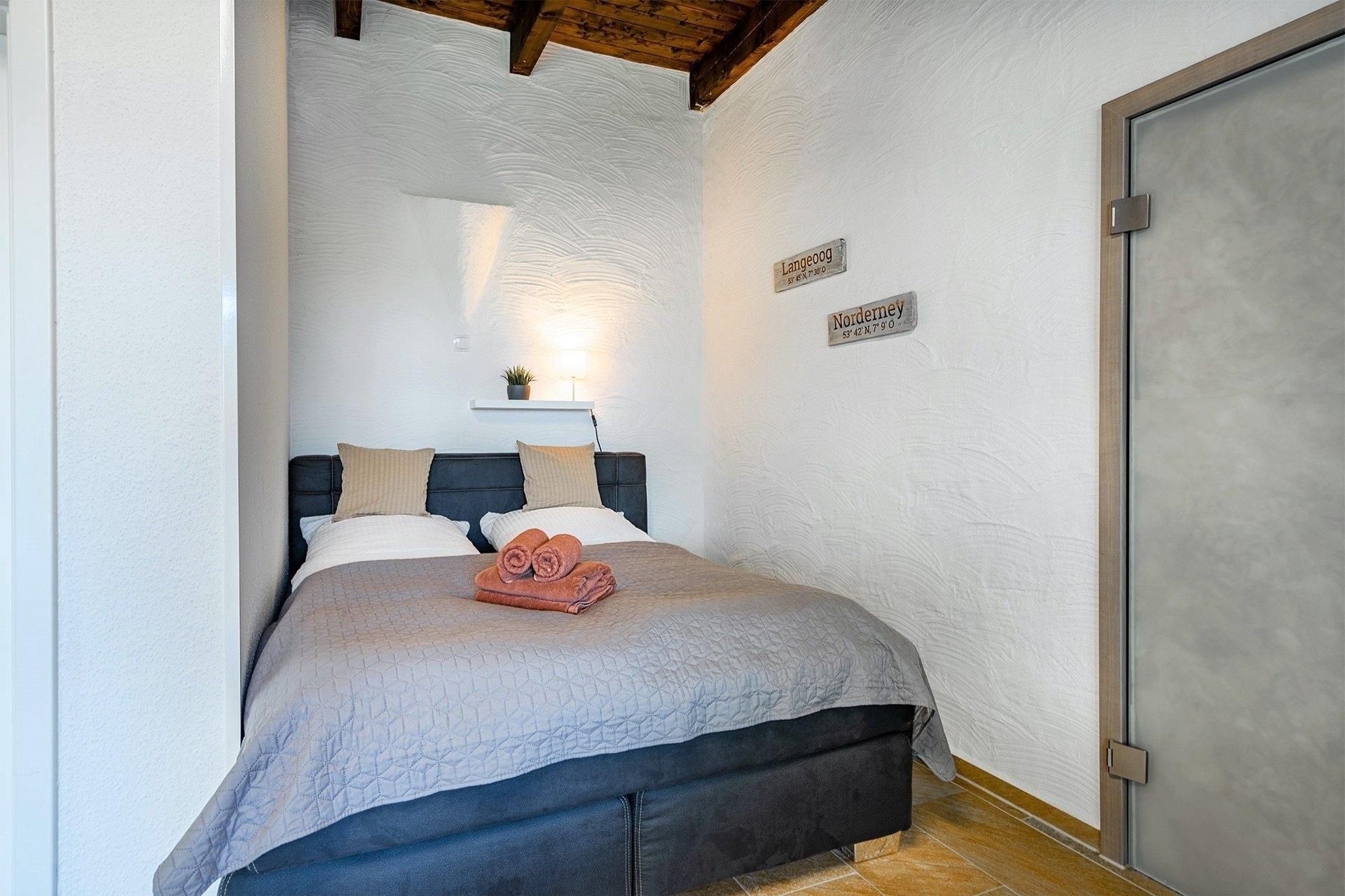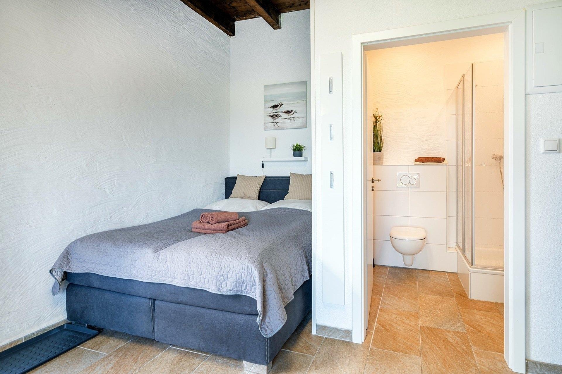 Das Appartement mit Garten bietet eine einzigartige Raumaufteilung, bestehend aus zwei separaten Räumen, die beide als Schlafzimmer fungieren und zugleich eine voll funktionsfähige Küchenzeile sowie ein gemütliches Wohnzimmer beherbergen. Jeder Raum ist mit einem komfortablen Boxspringbett (160x200cm) ausgestattet, das für einen erholsamen Schlaf sorgt.In der Küchenzeile finden sich alle notwendigen Annehmlichkeiten, darunter ein Cerankochfeld, Backofen, Kühlschrank, sowie Geschirr und Besteck für die Zubereitung von Mahlzeiten. Ein gemütlicher Essbereich lädt zum gemeinsamen Speisen ein, während eine komfortable Couch und ein Fernseher für entspannte Stunden sorgen.Die zwei Bäder des Apartments bieten jeweils eine Dusche und ein WC, was besonders praktisch ist, um den Komfort der Gäste zu gewährleisten. Exzellente Bettwäsche und Handtücher können optional dazu gebucht werden, um den Aufenthalt noch angenehmer zu gestalten.Der Garten, der eine Höhe von 1,80 cm aufweist, ist vollständig eingezäunt und exklusiv für die Gäste des Apartments zugänglich. Diese Privatsphäre ermöglicht es den Gästen, die Natur zu genießen und sich vollkommen zu entspannen.Die unmittelbare Nähe zum See sowie die kilometerlangen Spazierwege garantieren Erholung pur für Mensch und Hund, denn Gäste mit bis zu zwei Hunden sind in dieser Wohnung herzlich willkommen.Für zusätzlichen Komfort stehen eine Waschmaschine und ein Trockner gegen Gebühr im zweiten Stockwerk der Villa Moorstern zur Verfügung. Ein abschließbarer Abstellraum für Fahrräder und E-Bikes mit Ladestationen ist ebenfalls vorhanden, um den Gästen maximale Bequemlichkeit zu bieten.Die Zufriedenheit und das Wohlbefinden unserer Gäste, insbesondere Familien, liegen uns sehr am Herzen. Auf Wunsch stellen wir gerne kostenfreie Babybetten mit passender Bettwäsche, Wickelkommoden, Babybadewannen, Rausfallschutz und Tritthocker zur Verfügung, um den Aufenthalt für Eltern und ihre Kleinen so angenehm wie möglich zu gestalten.Darüber hinaus bieten wir in unserem Abstellraum kostenfrei Bollerwagen zur Ausleihe an, damit Familien bequem ihre Ausflüge in die Umgebung oder zum nahegelegenen Strand unternehmen können. Unsere Gäste sollen sich bei uns wie zu Hause fühlen und einen unbeschwerten Urlaub genießen können, ganz gleich, ob sie als Familie oder in anderer Konstellation anreisen.