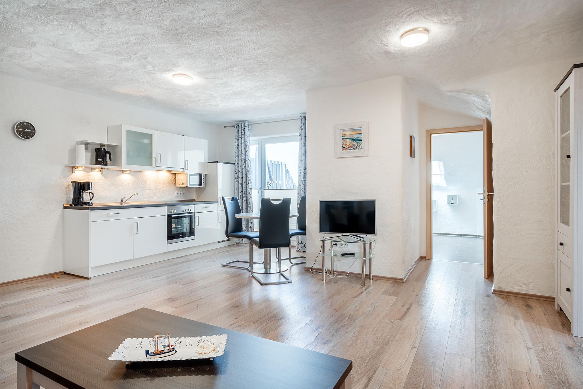 Großzügig geschnittener Wohn-/Essbereich mit einer vollwertig ausgestatteten Küche und eine gemütliche Couch mit TV ergänzen die Einrichtung.