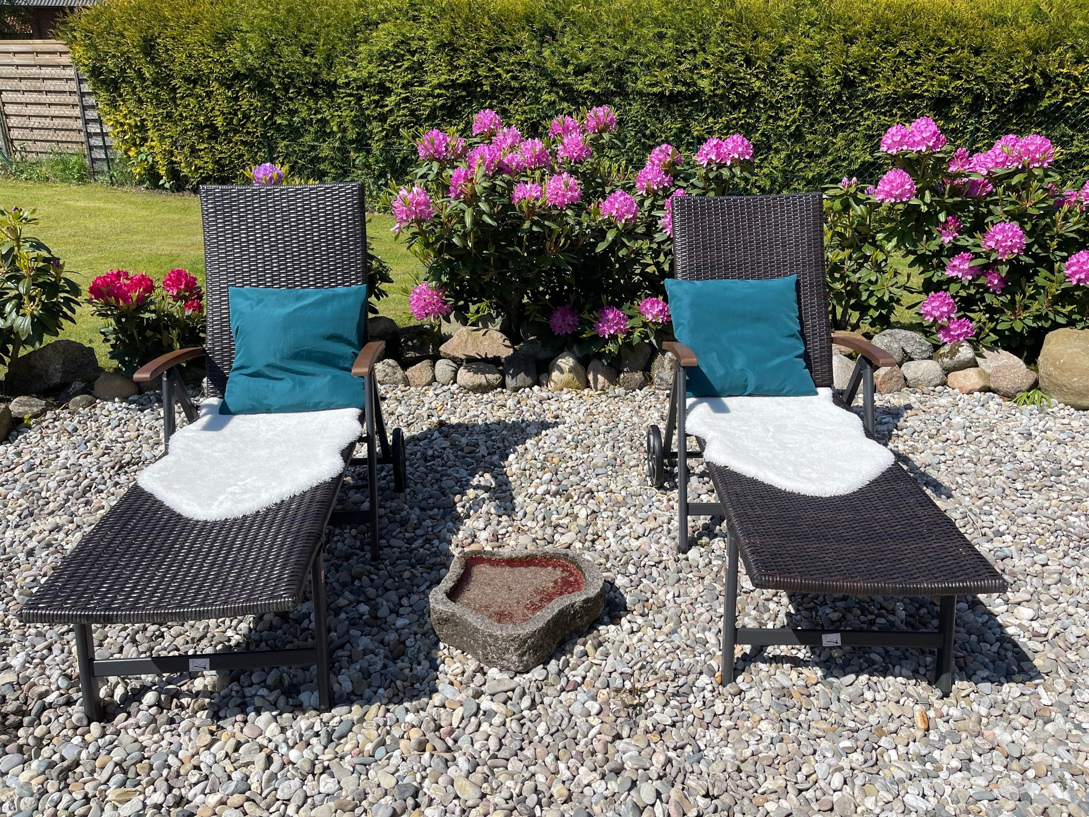 Im Garten befindet sich ein 90qm großer Gartenstrand mit Palettenmöbeln, Liegen und einer Feuerstelle.