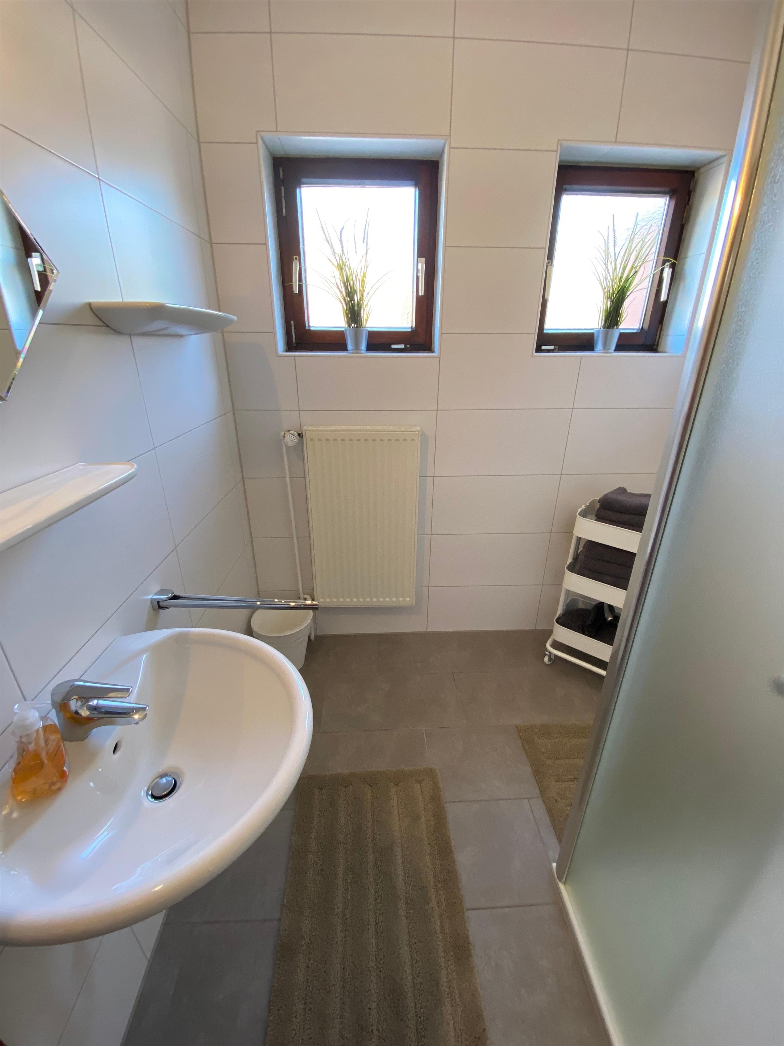 Das neu renovierte Bad ist mit einer ebenerdiger Dusche mit Duschhocker und Haltegriffen ausgestattet.