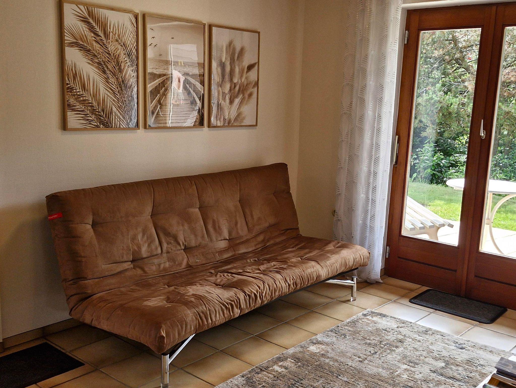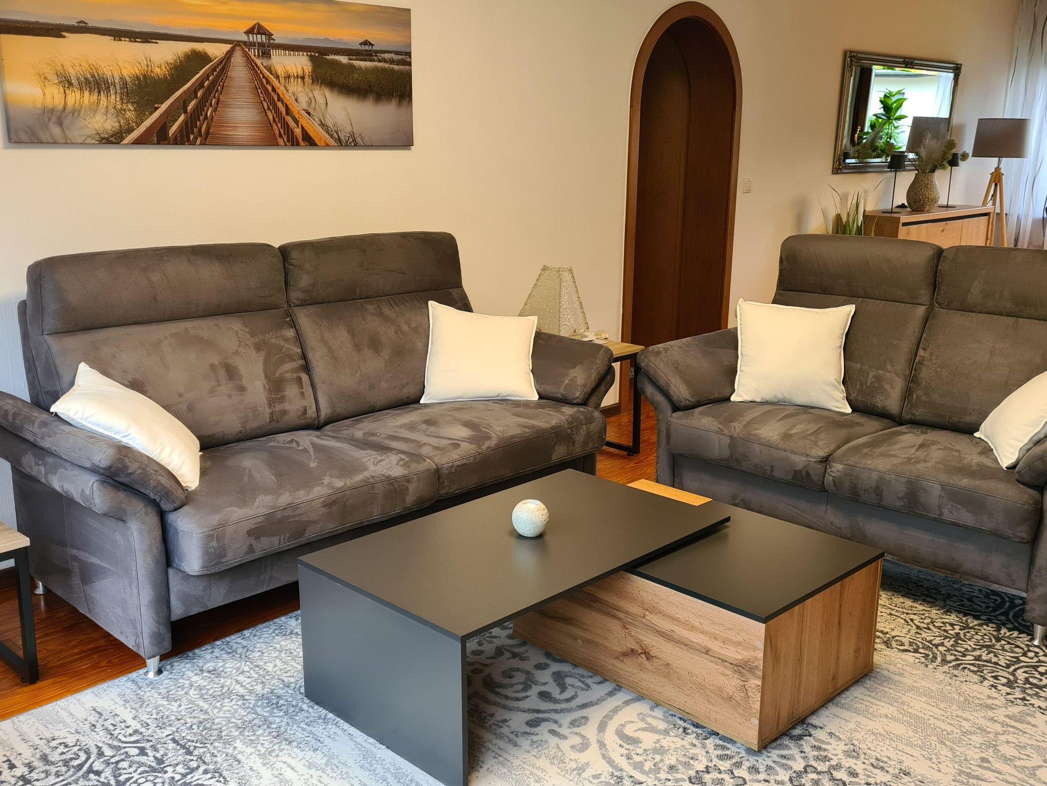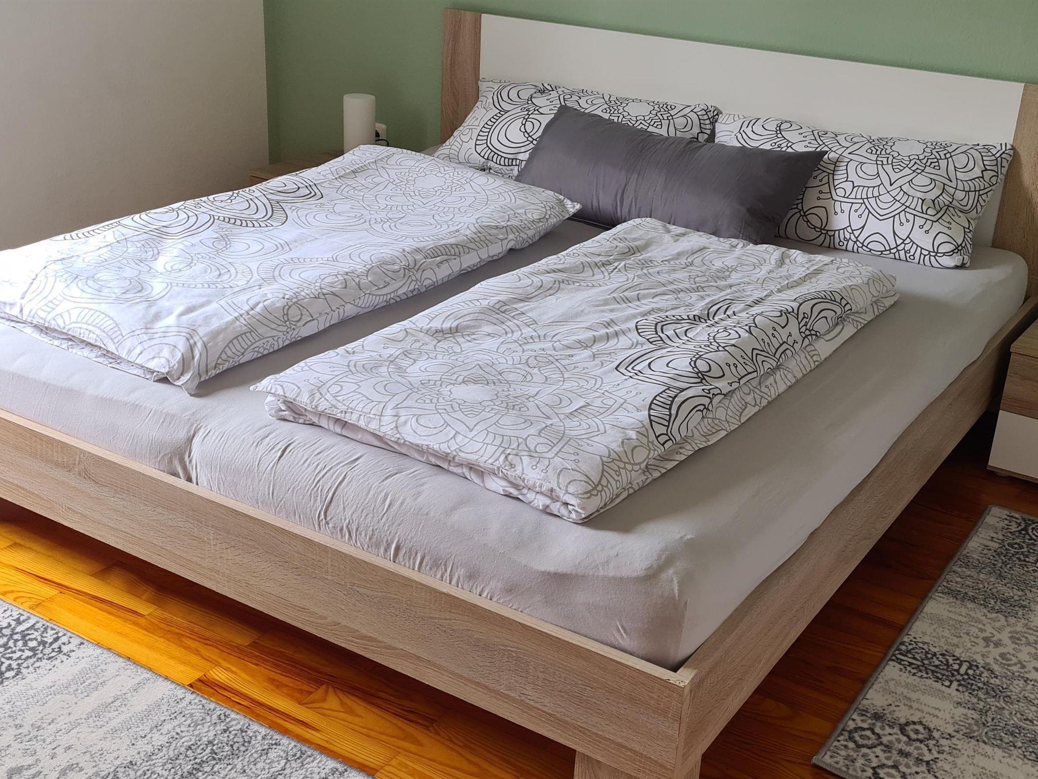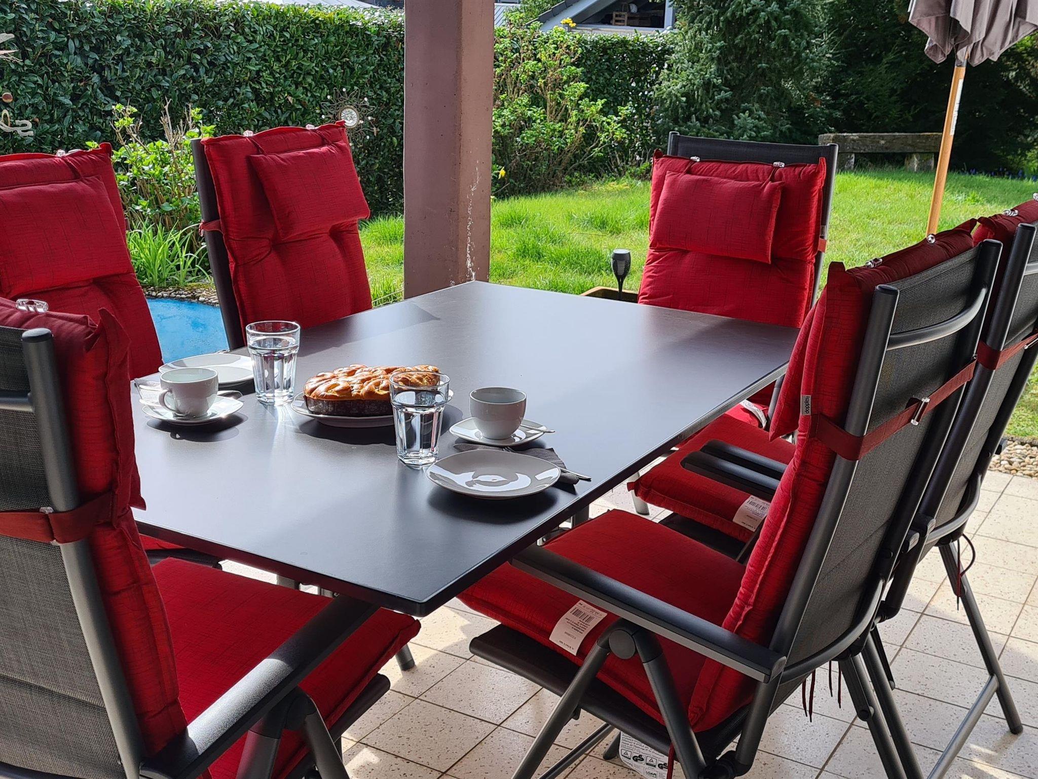 2 getrennte Doppelschlafzimmer (Doppelbett je 180 x 200 cm) und ein Zimmer mit ausziehbarer Couch (140 x 200 cm). Die Küche ist mit Kühlschrank, Geschirrspüler, Backofen, Herd mit Ceranfeld, Mikrowelle, Wasserkocher, Mini-Backofen, Kaffeemaschine (Nespresso-Kapselmaschine inkl. Milchaufschäumer), Küchenmaschine und Wasserkocher ausgestattet. Das Bad ist mit Dusche/WC und Fön ausgestattet. Im großen Wohn-Esszimmer befindet sich eine Stereoanlage mit CD-Player und ein 55-Zoll-Fernseher. Im großen Garten gibt es eine überdachte Terrasse mit Sitzecke. Außerdem stehen Liegestühle mit Auflagen und ein Grill zur Verfügung.